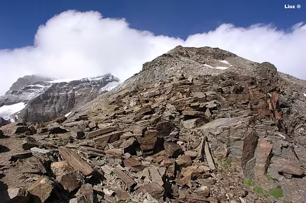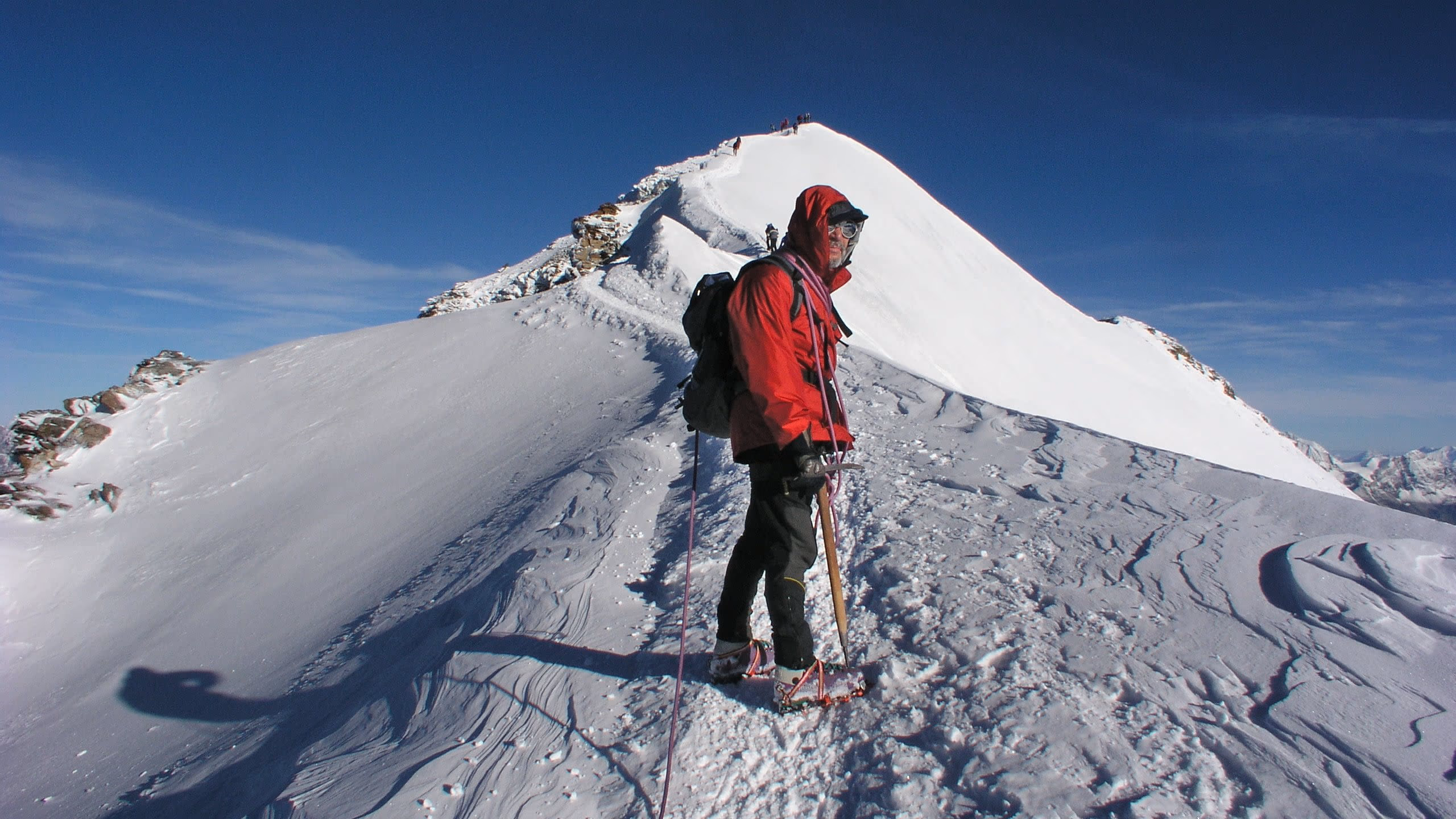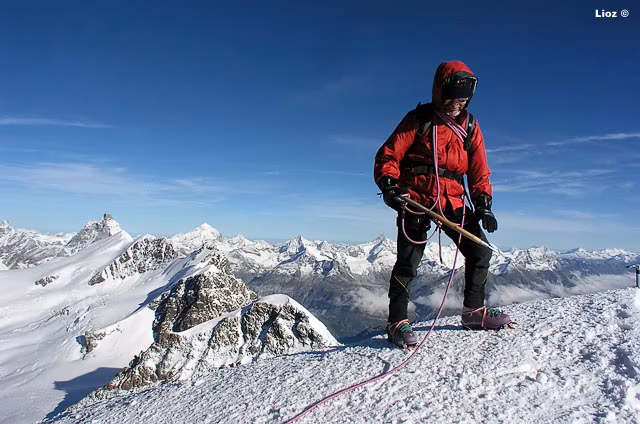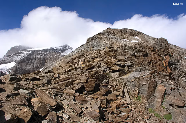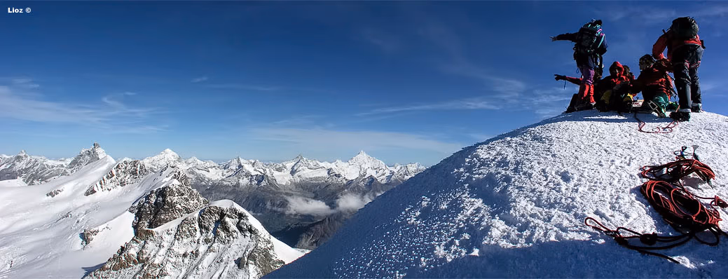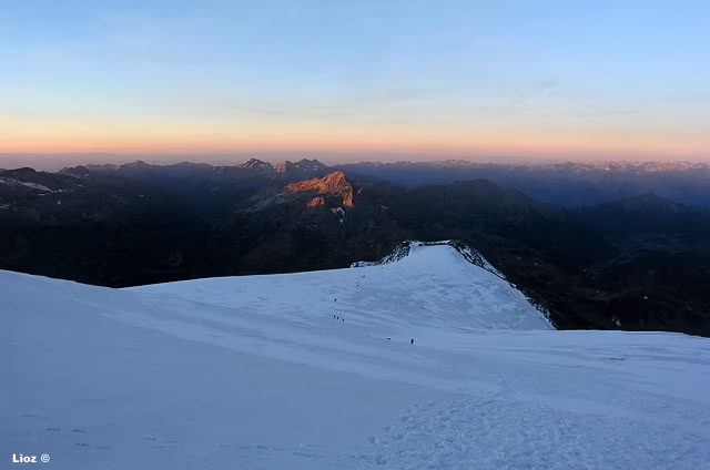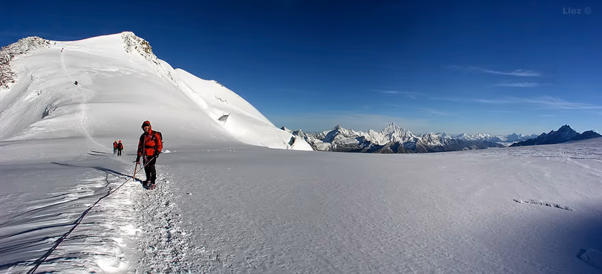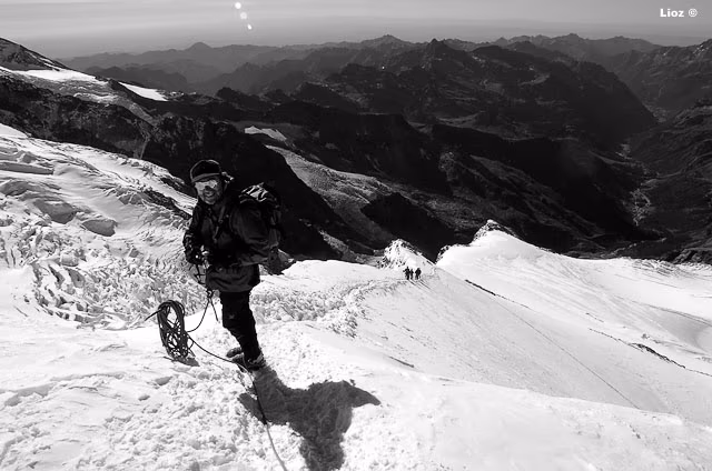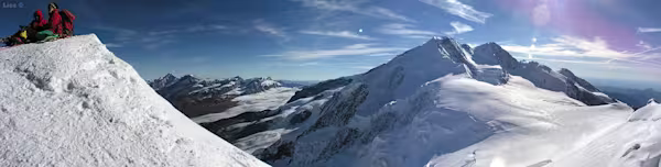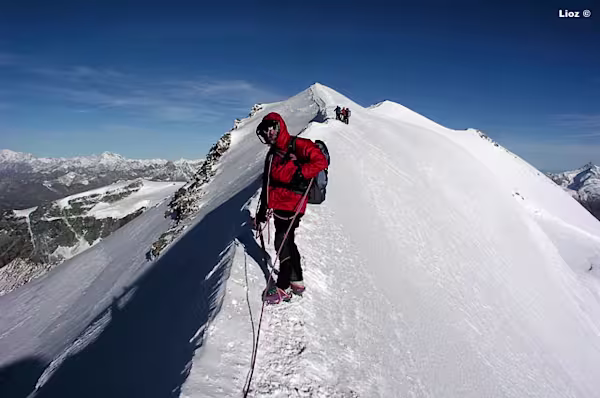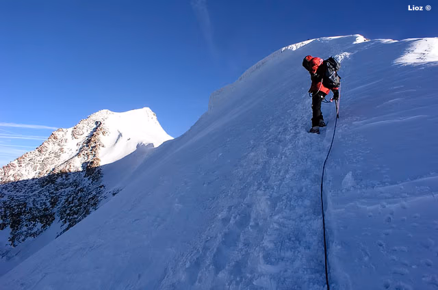 Dal colle inizia la cresta che in direzione W con alcuni saliscendi ci porterà fino in vetta. La cresta è splendida e si può percorrere con attenzione certo, ma in assoluta tranquillità, dal momento che non è mai eccessivamente affilata. La vista degli scivoli dei versanti S e N che precipitano verso i sottostanti ghiacciai assicurano un tocco di adrenalina in più.