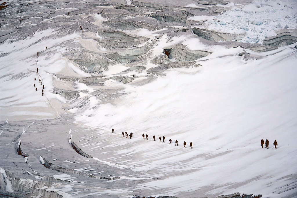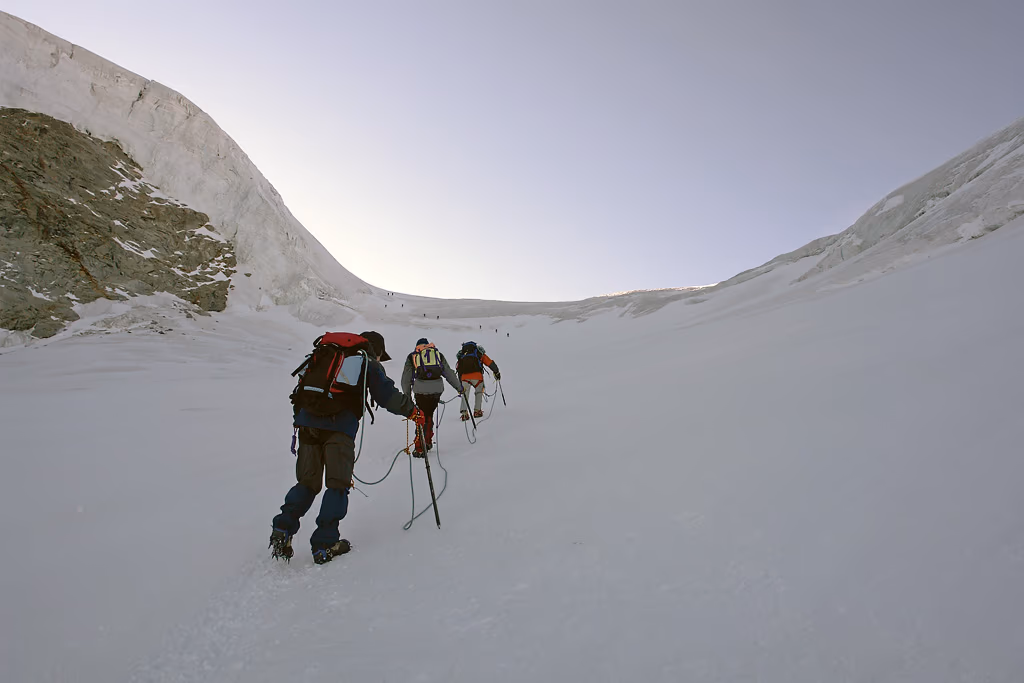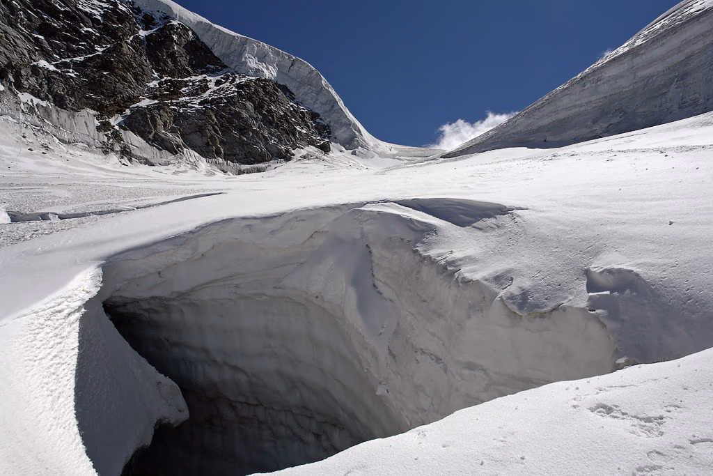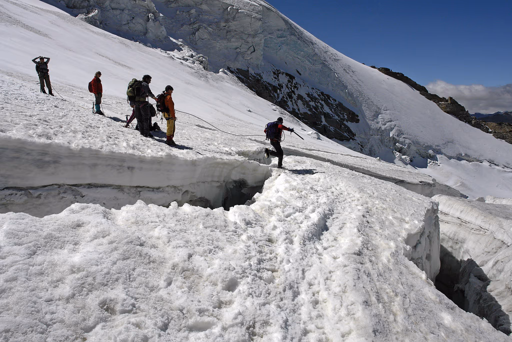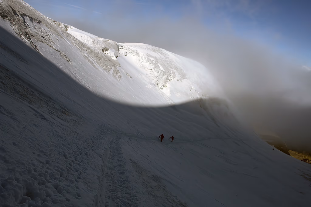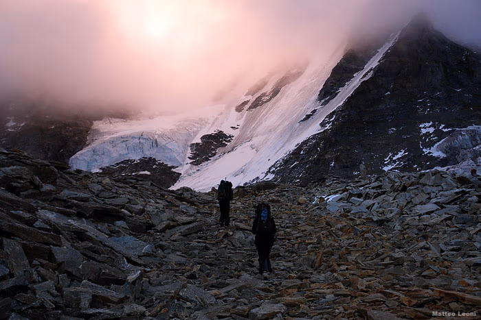 Non siamo soli ma in discreta compagnia. Alle prime luci del giorno raggiungiamo lo sperone che costeggia il Ghiacciaio del Lavaciau a quota 3200 m. Qui scendiamo per circa quaranta metri fino a un pianerottolo dove possiamo indossare imbrago, calzare i ramponi, legarci in cordata e iniziare la salita. Ho detto 40 metri. Lo spessore perso dal ghiacciaio nel corso degli ultimi tre anni di anticiclone africano!Il ghiacciaio si presenta subito molto crepacciato e ci costringe a continue diversioni. La pendenza è abbastanza accentuata ma arriviamo a esere illuminati dal sole quando raggiungiamo la Schiena d’Asino e percorriamo il traverso verso ESE fino al Colle della Becca di Mocorvé 3851 m.