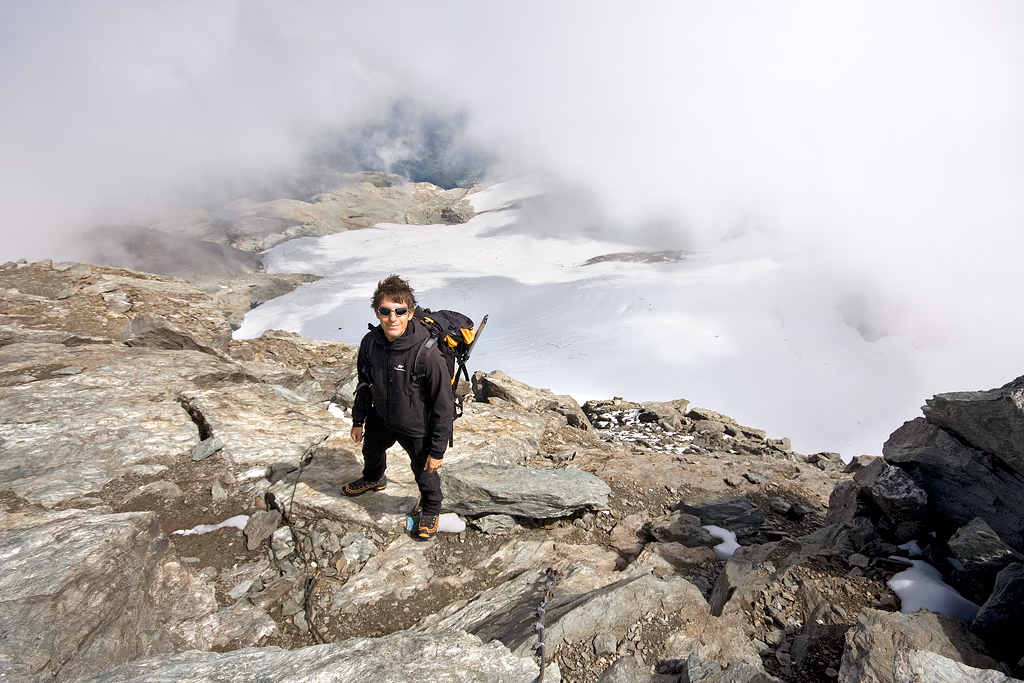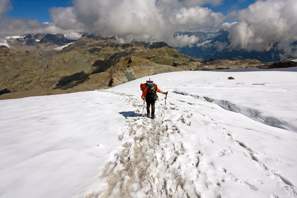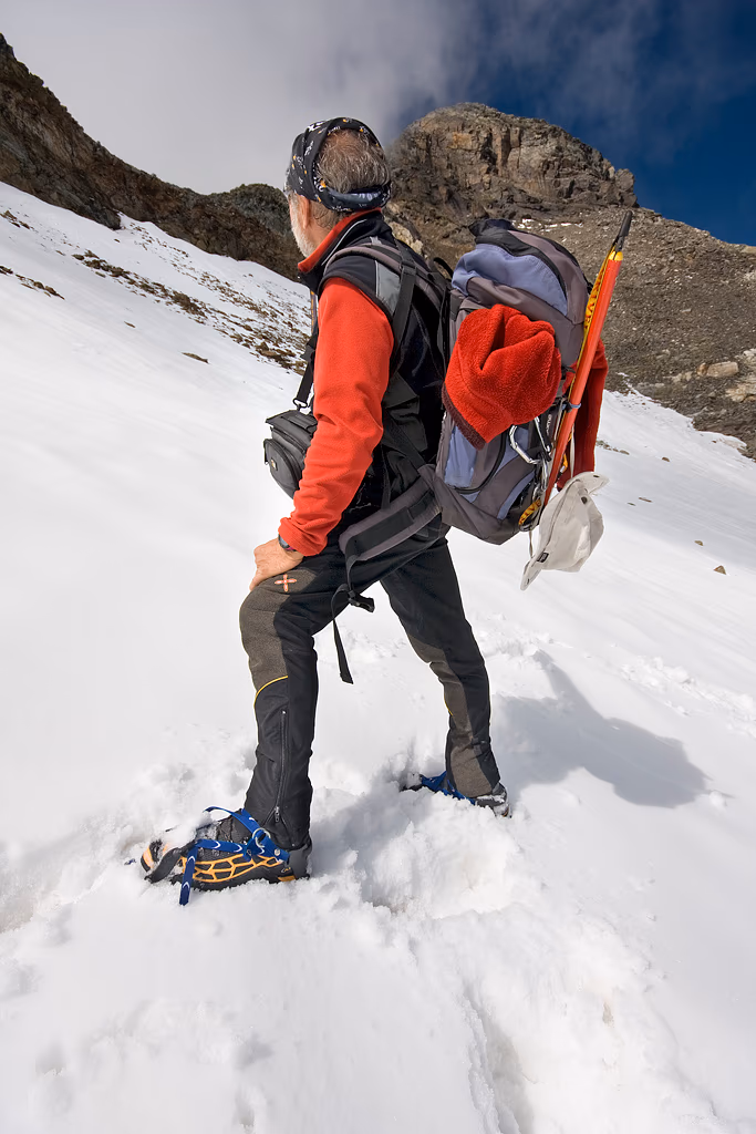 Per sfasciumi (o nevai a seconda della stagione) si sale sul ghiacciaio e lo si percorre fino all’evidente sella che divide il Pizzo Scalino dalla Cima Giovanni Paolo II e che permette si salire sulla cresta finale. La roccia è molto instabile, bisogna quindi prestare molta attenzione nell’affrontare l’ultimo tratto. È possibile evitare la prima paretina aggirandola sulla sinistra perdendo un po’ di dislivello oppure, sulla destra, risalendo il ghiacciaio fino a una piccola paretina che permette di attaccare la cresta dopo il tratto più difficile.