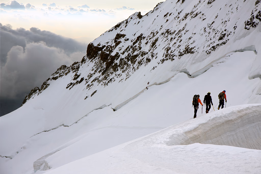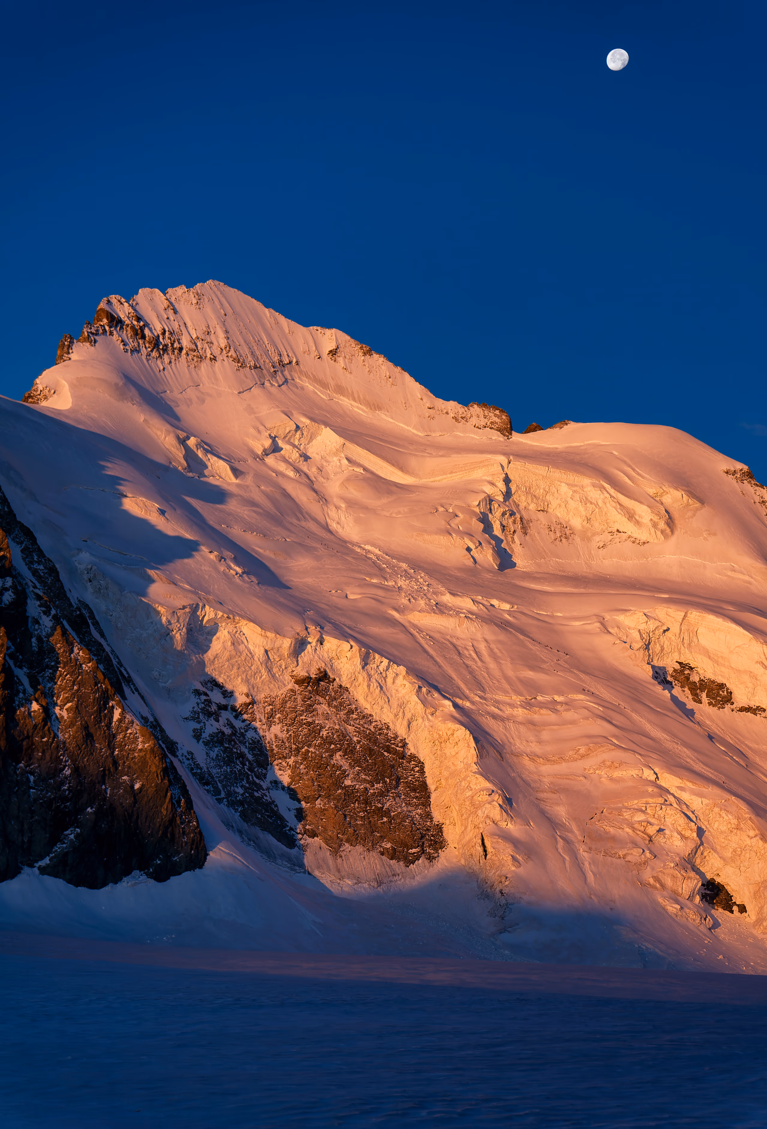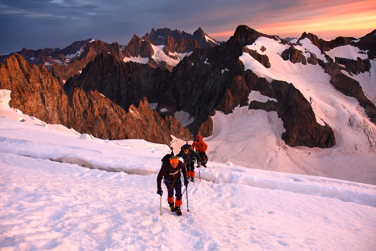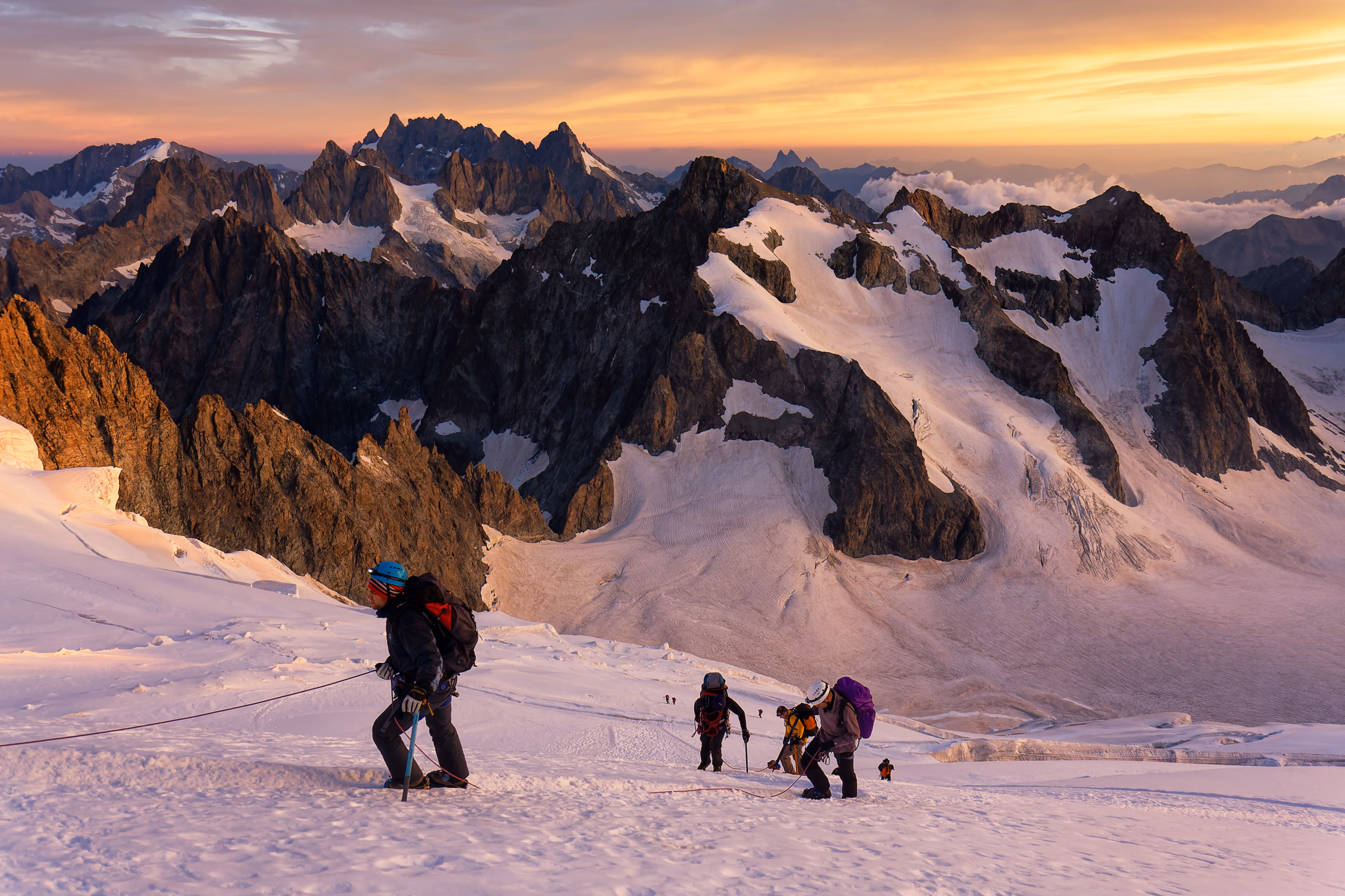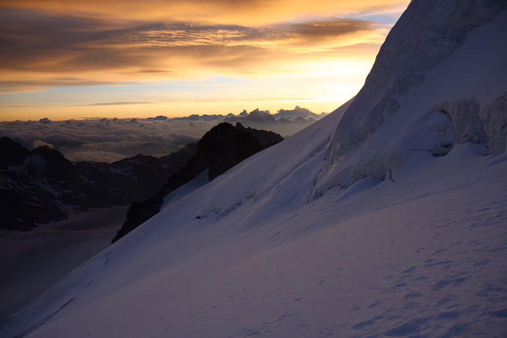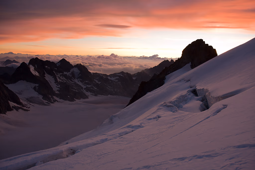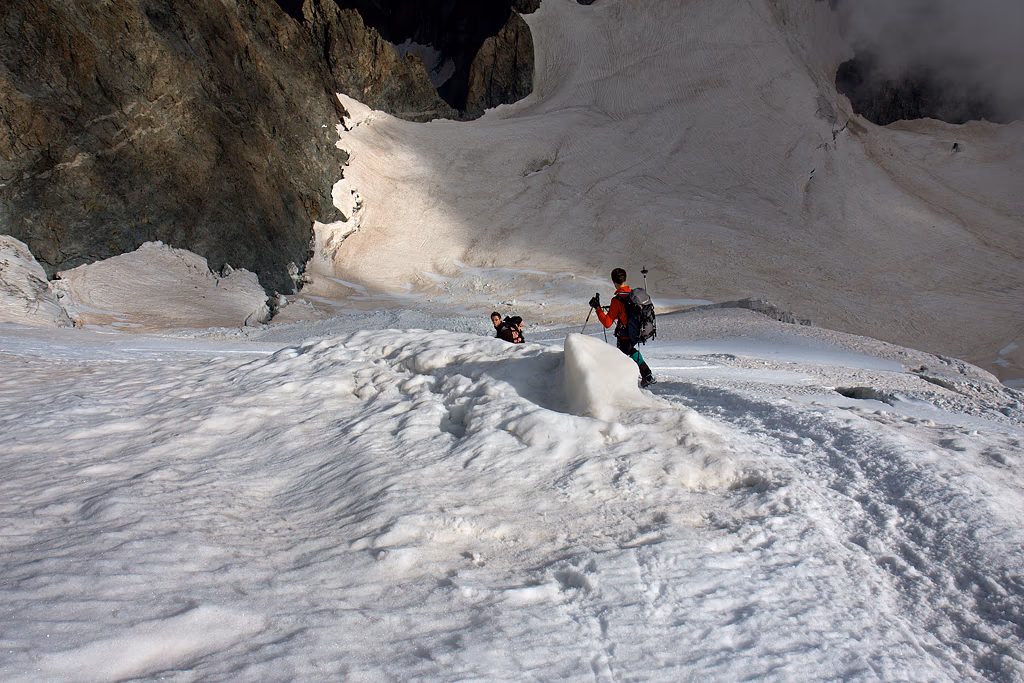 Il primo tratto in discesa è abbastanza fastidioso al buio e ogni tanto si sente qualcuno scivolare. Arrivati sul ghiacciaio ci leghiamo e partiamo per il lungo avvicinamento che ci condurrà alla base della parete di ghiacciaio della Barre. Ci vuole almeno un’ora per raggiungere l’attacco della salita (massima attenzione durante questo tratto del ghiacciaio per la presenza di numerosi crepacci nascosti). Rifiatiamo prima di affrontare il primo, terribile, tratto della salita. Questo tratto è costantemente sotto il tiro di una minacciosa seraccata, bisogna quindi farlo tutto di un fiato: vista la pendenza e l’ora è il momento più duro e delicato della salita. Dopodichè la pendenza diminuisce e la salita si fa meno impegnativa ma sempre sostenuta.L’alba ci coglie a 3800m, lo spettacolo toglie il fiato: il cielo diventa dapprima rosso fuoco per poi diventare giallo e quindi sfumare verso l’azzurro. Solo questo breve momento ci ripaga di tutti gli sforzi. L’ultimo tratto della salita passa sotto la la splendida parete della Barre. Superiamo la facile crepaccia terminale e siamo in vetta (circa 4h-4h:30 dal Rifugio).