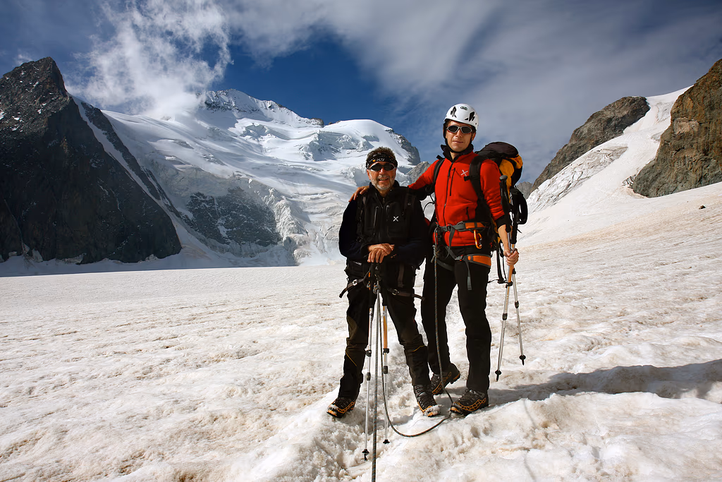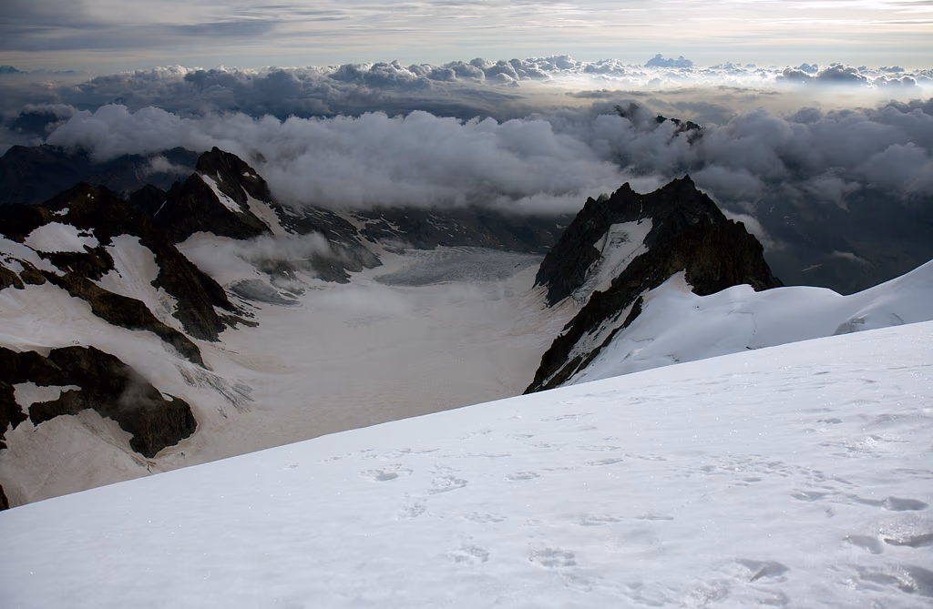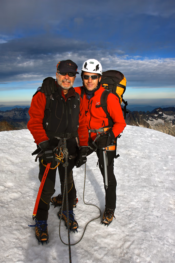 Come al solito a questa quota sembra di essere sopra ogni cosa.Respiriamo di nuovo l’aria dei 4000m, un momento sempre emozionante. La discesa va effettuata con molta attenzione soprattutto nell’ultimo tratto che va fatto di nuovo senza fermarsi. I seracchi non hanno orari, meglio quindi rimanere il meno possibile sotto il loro raggio d’azione. Di nuovo sulla spianata del Glacier Blanc; siamo fuori pericolo, ci fermiamo per riposarci un po’ prima della lunga discesa verso la macchina.