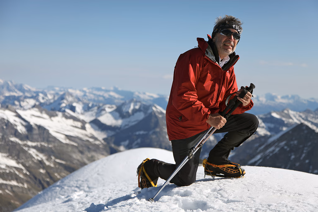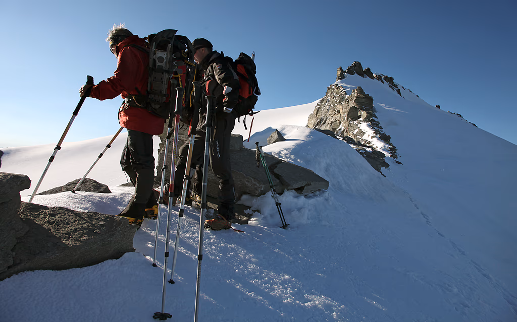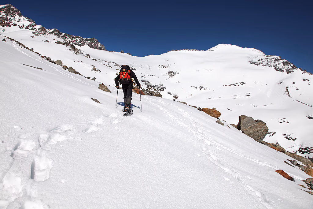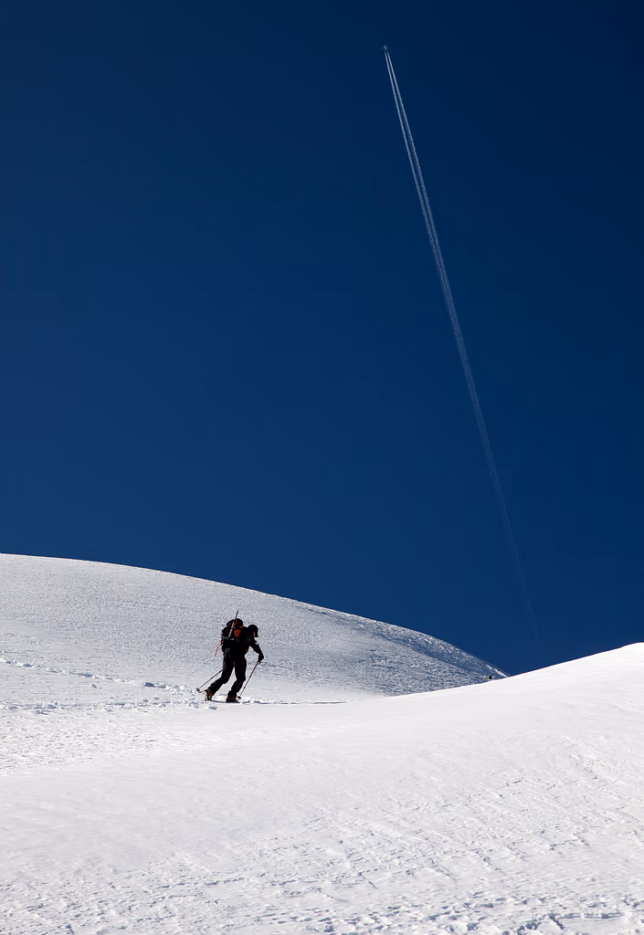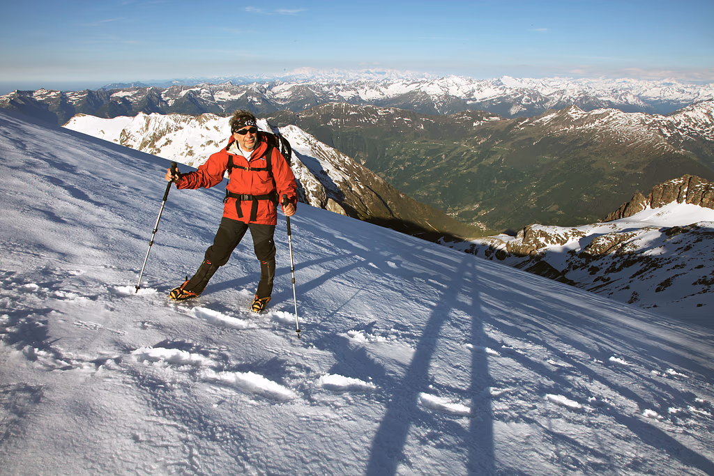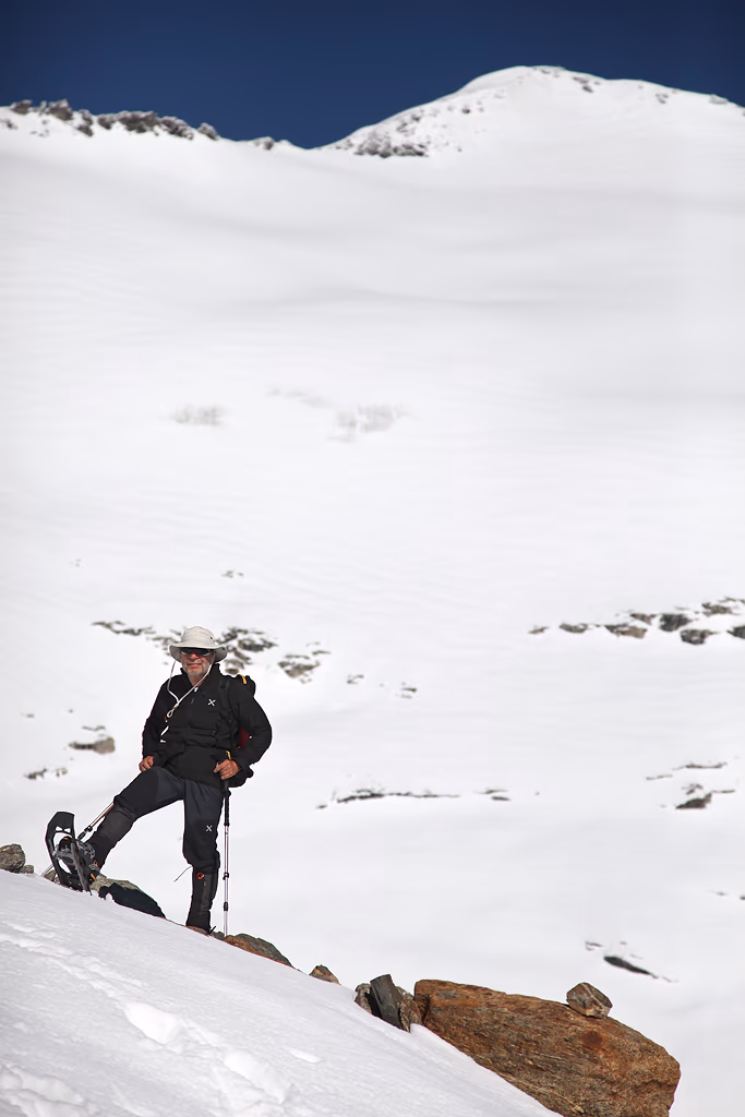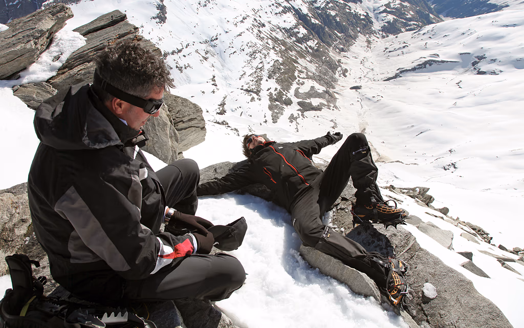 La risaliamo per tutta la sua lunghezza e affrontiamo sulla sinistra un salto roccioso di circa 60 metri.Da qui in poi è una lunga camminata sulla neve fino alla vetta. Sopra i 3000m la copertura è notevole, sicuramente superiore ai 2 metri; decidiamo quindi di procede slegati. Il percorso sul Ghiacciaio della Bresciana è evidente e segue il limite della cresta rocciosa fino a una selletta attraverso la quale si passa all’altro versante.