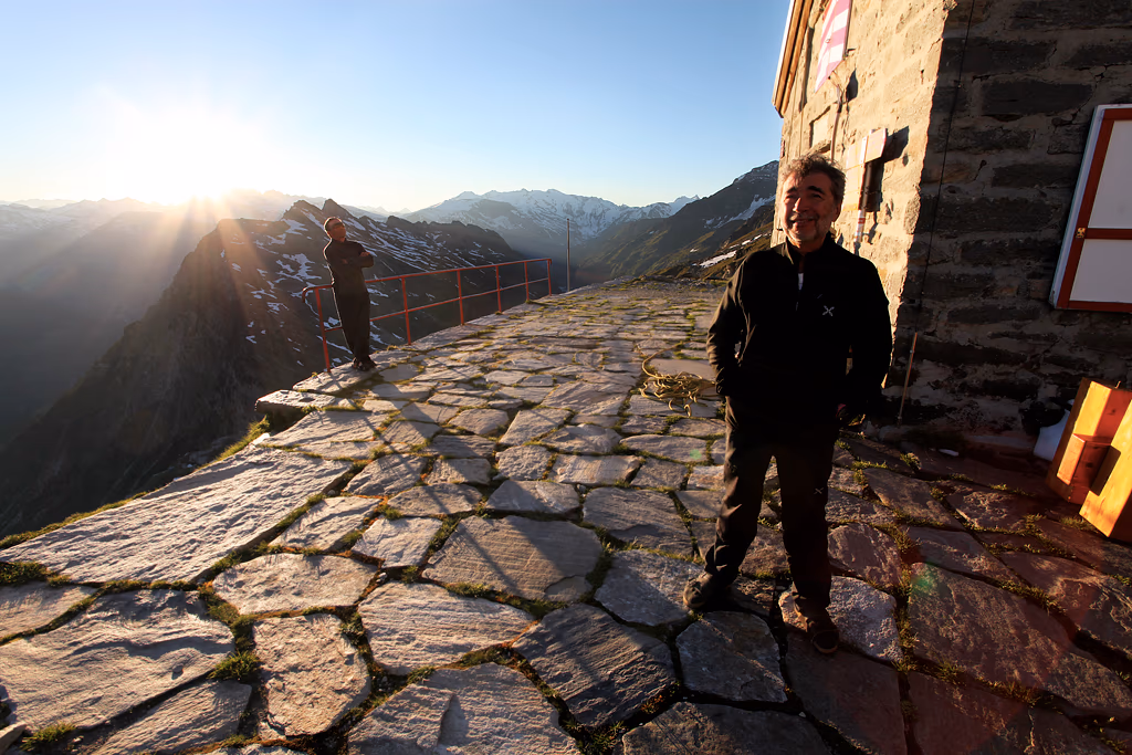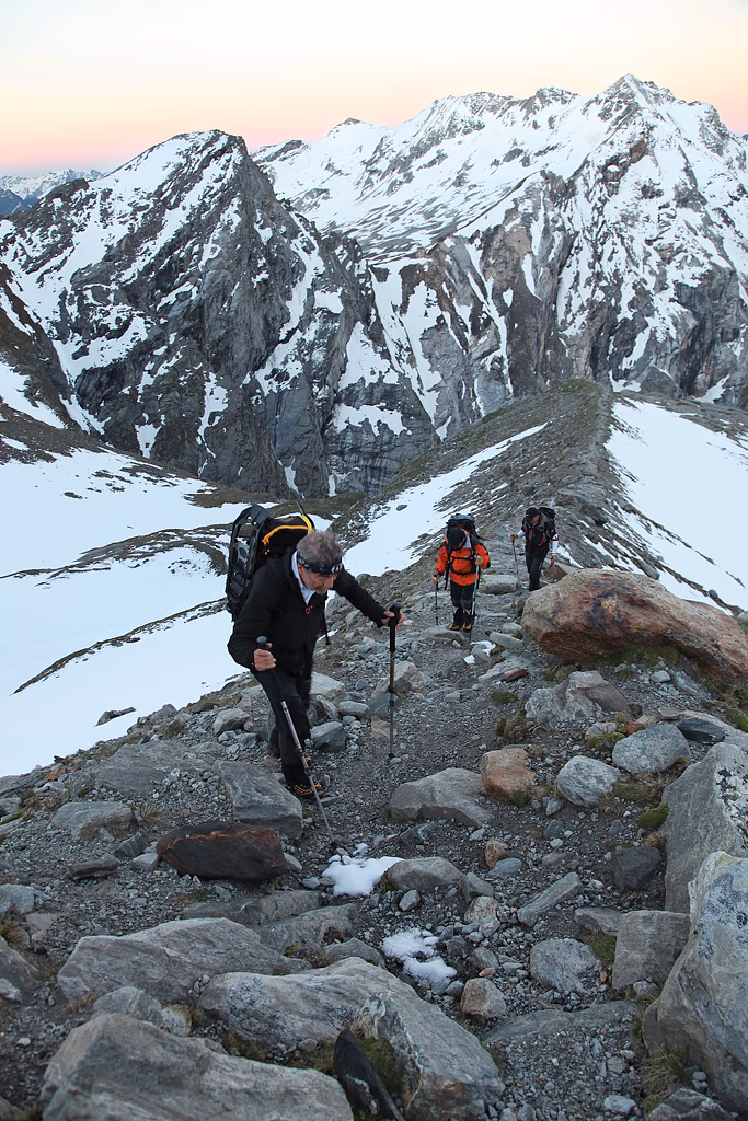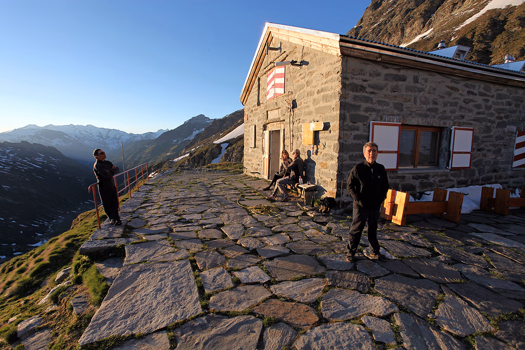 Se avessimo incrociato un’altra macchina nella prima galleria l’incastro sarebbe stato fatale! Come al solito percorriamo l’interminabile Val Carassino fino all’ultimo strappetto che conduce alla Capanna Adula UTOE, ancora incustodita ma sempre accogliente.Un bel brodino della Knorr e subito a letto! I morbidi piumoni della capanna garantiscono dormite eccezionali. Sveglia alle 4:15 e partenza con le prime luci dell’alba. Appena usciti dal rifugio swguiamo un costone roccioso fino ad arrivare alla base della morena.