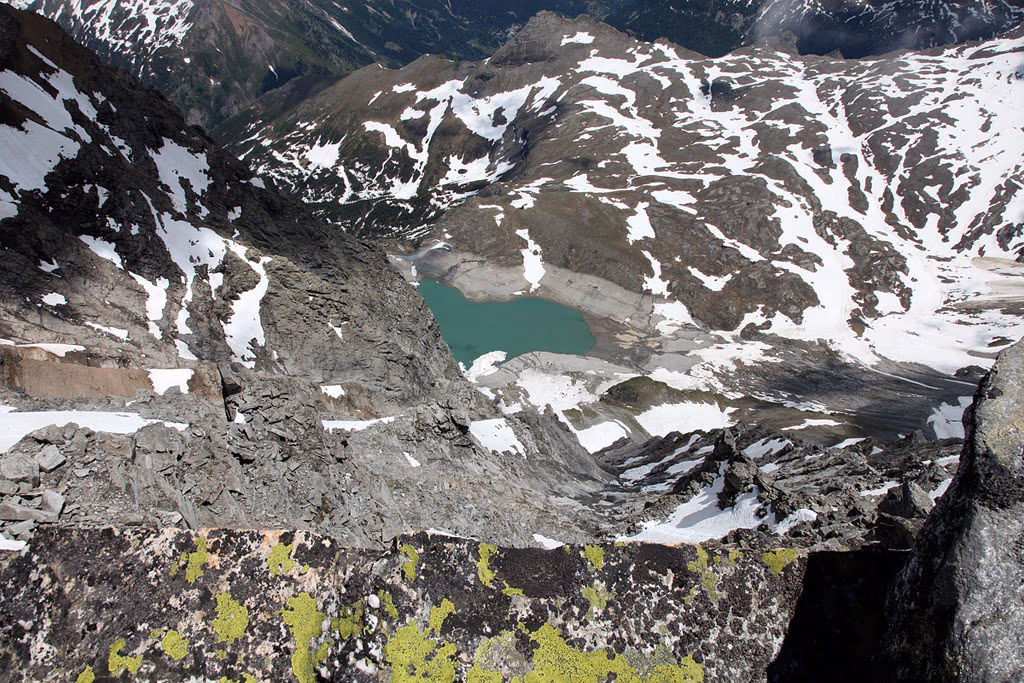 Si deve perdere un po’ di quota e quindi risalire, cercando di rimanere alti lungo il traverso per evitare allungare inutilmente la strada. Si monta in cresta su un evidente intaglio di quest’ultima, attraverso un pendio di 30 gradi circa (facile).La cresta non presenta mai passaggi insidiosi, anche se è molto esposta verso il Veglia. Nel nostro caso abbiamo trovato dei passaggi ancora innevati che hanno creato qualche problema. In particolare l’aggiramento di un blocco roccioso su uno scivolo di neve molle che finiva 500m più sotto. Niente di sconvolgente ma l’assicurazione era obbligatoria. Eccoci finalmente in cima ai 3553m del Monte Leone.