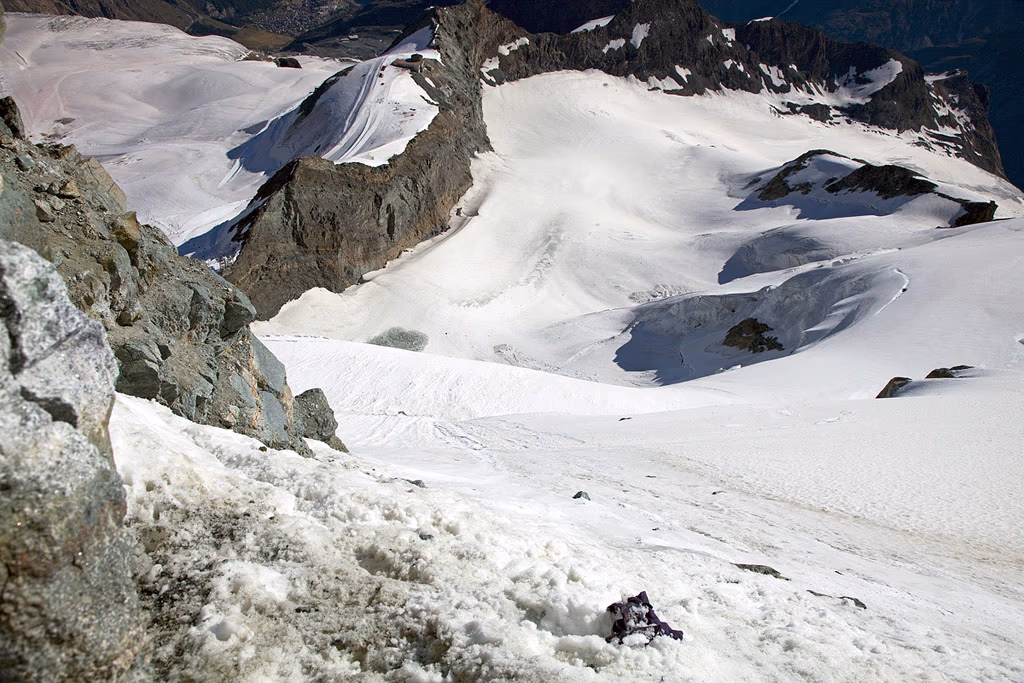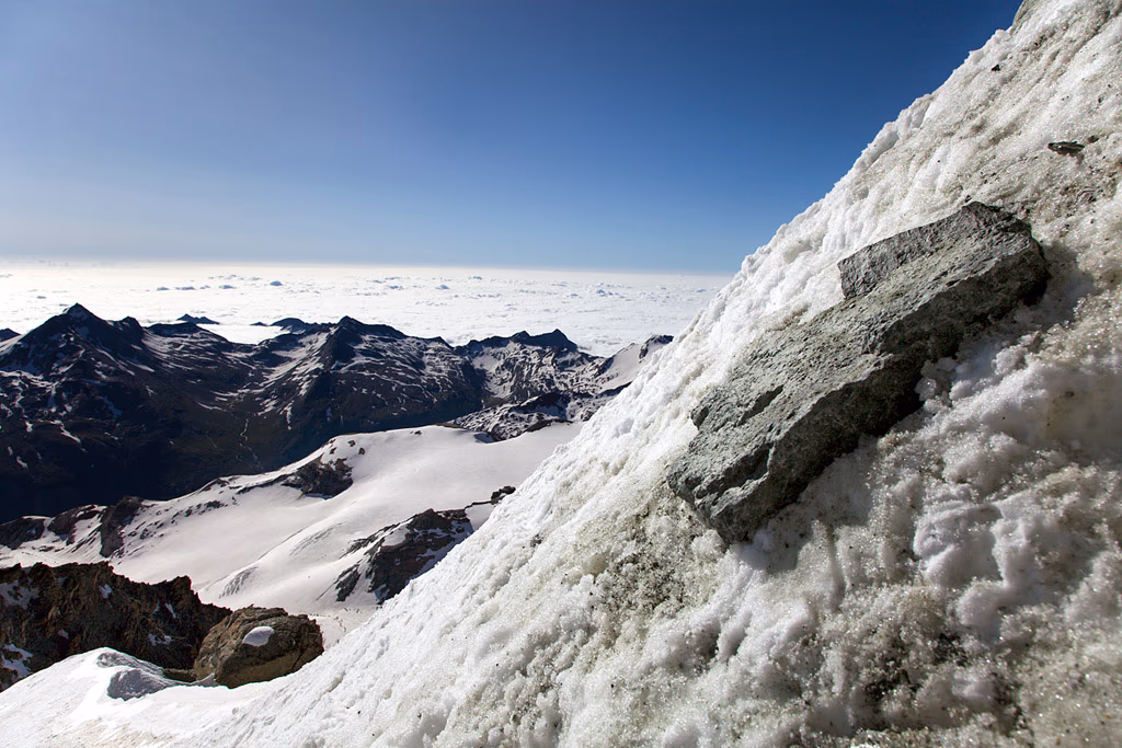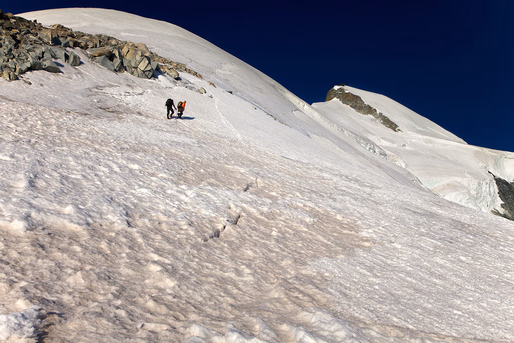 È il nostro tredicesimo 4000.L’affollamento è garantito, e interrompe la magica atmosfera della cresta NE. Scendiamo lungo la via normale dove incontriamo di tutto: mamme ansimanti con bambini al seguito, gente in jeans e maglietta e guide alla loro terza salita giornaliera con tanto di numerosa cordata al seguito. In un’ora scarsa raggiungiamo il Metro Alpin che ci riporta a Saas Fee.Il giudizio sull’itinerario è ottimo: elegante e di grande soddisfazione, mai troppo difficile ma neanche banale, consigliatissimo!