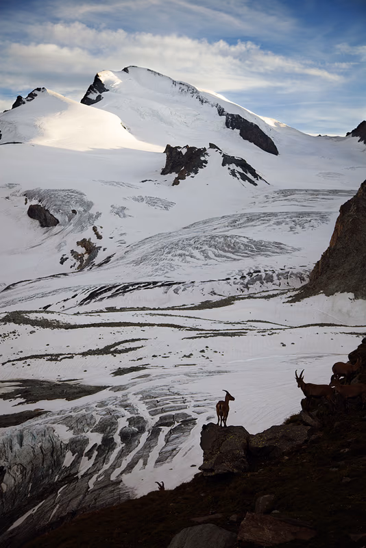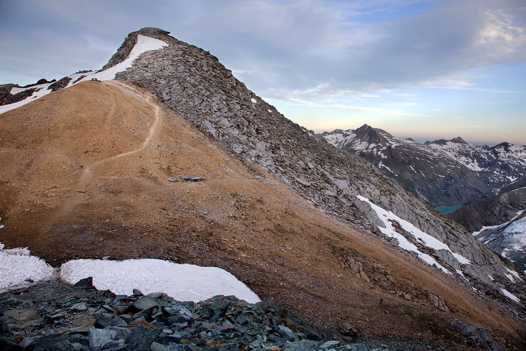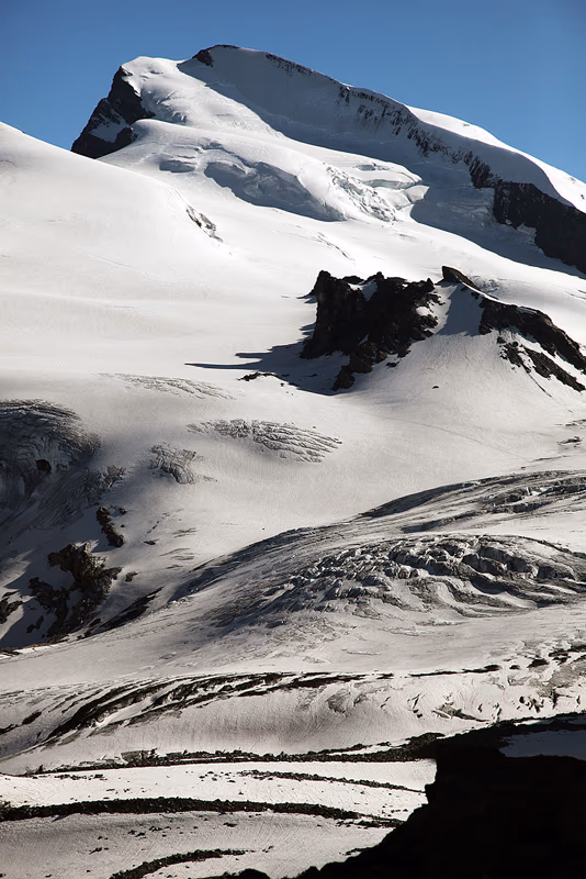 Ci svegliamo alle 3:45, rapida e indigesta colazione e siamo pronti per partire. Affrontiamo il primo tratto in discesa con le frontali, superando qualche chiazza di neve residua. In breve tempo giungiamo sull’Hohlaubgletscher dove ci leghiamo e beviamo un goccio di tè caldo. Risaliamo il ghiacciaio dapprima sulla destra, poi piegando decisamente verso sinistra dove iniziano i pendii glaciali che portano sulla cresta. Da qui ci sono due possibilità: la prima è quella di risalire il pendio di sinistra (meno pendente) oppure quello di destra più ripido ma che consente di accorciare di poco la salita.
