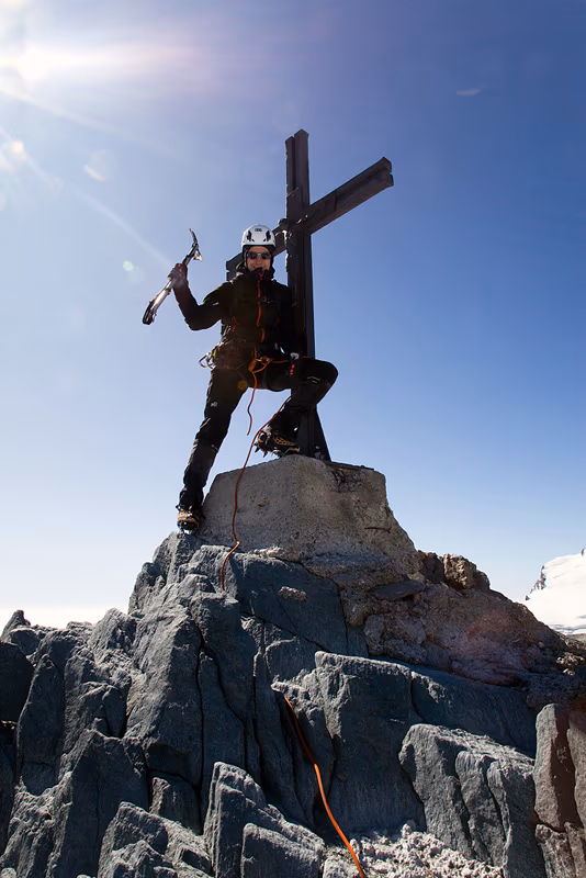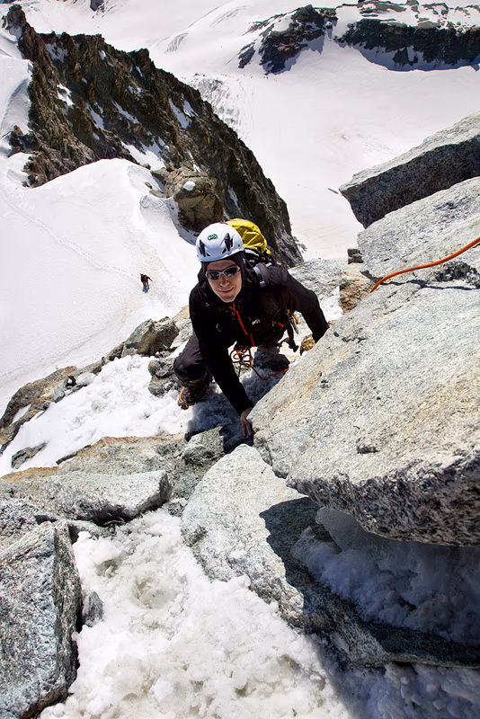 Davanti a noi ci sono 3 cordate, dobbiamo quindi fermarci e aspettare il nostro turno sull’insidioso scivolo nevoso che precipita per circa 600m sull’Hohlaubgletscher. Finalmente arriva il nostro turno. Vado avanti e raggiungo con un delicato traverso il primo fittone per autoassicurarmi. A questo punto faccio andare avanti mio padre che affronta la prima placca(II+, il tratto più impegnativo). Dopo la prima placca l’arrampicata diventa semplice e divertente, anche se esposta. C’è anche il tempo per scattare qualche foto ricordo. Superato il salto roccioso percorriamo il facile (ma sempre esposto) pendio nevoso che conduce ai 4027m della vetta.
