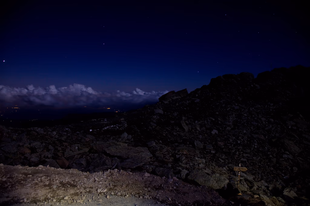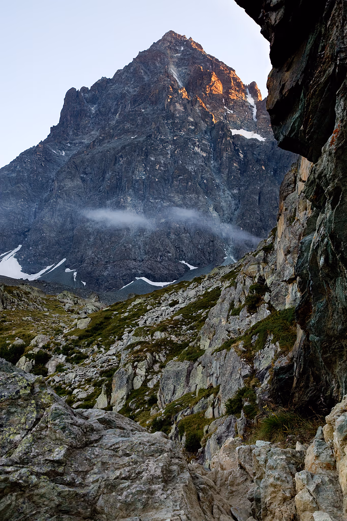 Non c’è tantissima gente, il mangiare non è malvagio. Tutti a letto alle 22 visto che la sveglia suona alle 4. Alle luci delle frontali imbocchiamo il sentiero che aggira il laghetto sotto il rifugio e sale in direzione del Passo delle Sagnette. E qui la prima difficoltà: una bella ferrata fisica e abbastanza esposta. Raggiungiamo il passo dal quale è visibile la parete sud, lungo la quale sale la via normale.Dal passo si perdono circa 80-90 metri di quota per poi iniziare l’avvicinamento al Bivacco Andreotti lungo una vallone detrico.