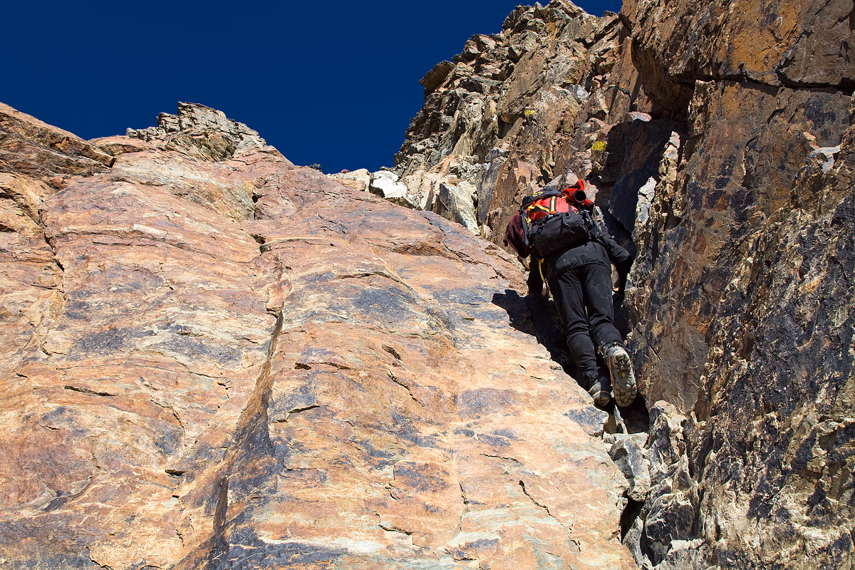 Questo è il tratto più noioso della salita (specialmente al ritorno). L’ultimo tratto è molto ripido e taglia le gambe. Al bivacco mangiamo qualcosa ma ci rimettiamo subito in marcia visto che manca ancora il tratto più impegnativo della via. Subito dopo il bivacco troviamo quel che rimane dell’ex ghiacciaio Sella, ormai ridotto a semplice nevaio.