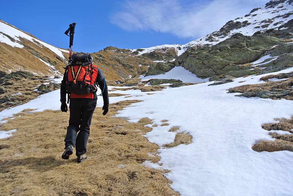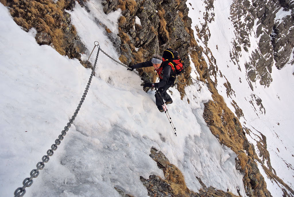 Qui si trova anche un Rifugio Privato, che abbiamo trovato chiuso. Il lago è parzialmente ghiacciato ed è presente uno strato di neve ventata, ma di scarso spessore. Saliamo ora in diagonale verso SE puntando a un canale che scende dal pianoro sovrastante. Battiamo la pista fino ad arrivare a individuare le catene che ci aiutano nel risalire il canale, ripido ma non eccessivamente impegnativo. In altre condizioni, cioè con molta neve e catene sommerse, sarebbe stato un percorso di ben altra difficoltà, ottimo però per un allenamento a un 4000 da fare in estate. Non abbiamo bisogno dei ramponi tanto che usciti dal canale ci troviamo sul pianoro del Lago Deleguaccio Superiore a quota 2250 m.