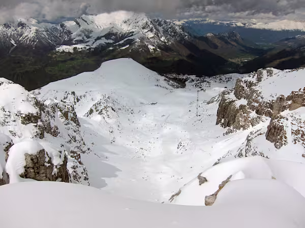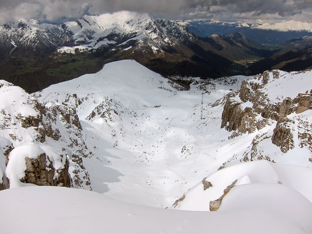 Rientro con lunghe scivolate fino al Rifugio Lecco quota 1780 m che troviamo, sfortunatamente per noi, strapieno e quindi il solito salamino anziché pizzoccheri o polenta con pietanze a scelta. Funivia, auto e in 45 minuti siamo a casa. Tempo discreto con squarci di sole fra le nuvole scure. Ottimo per le foto d’effetto.