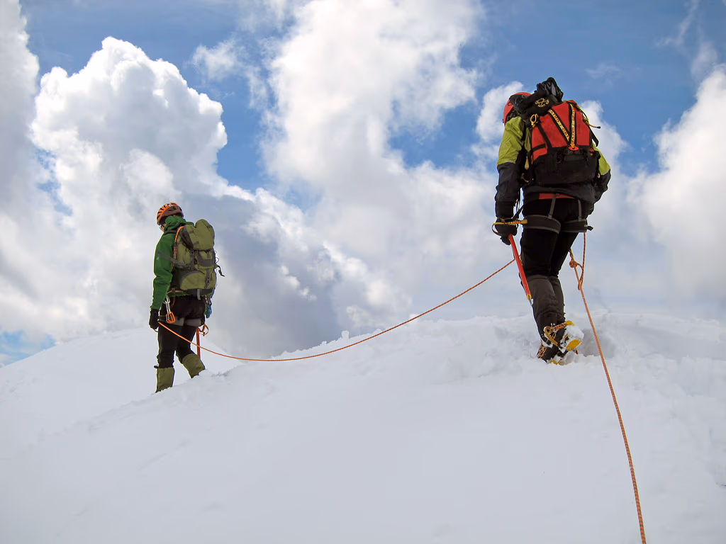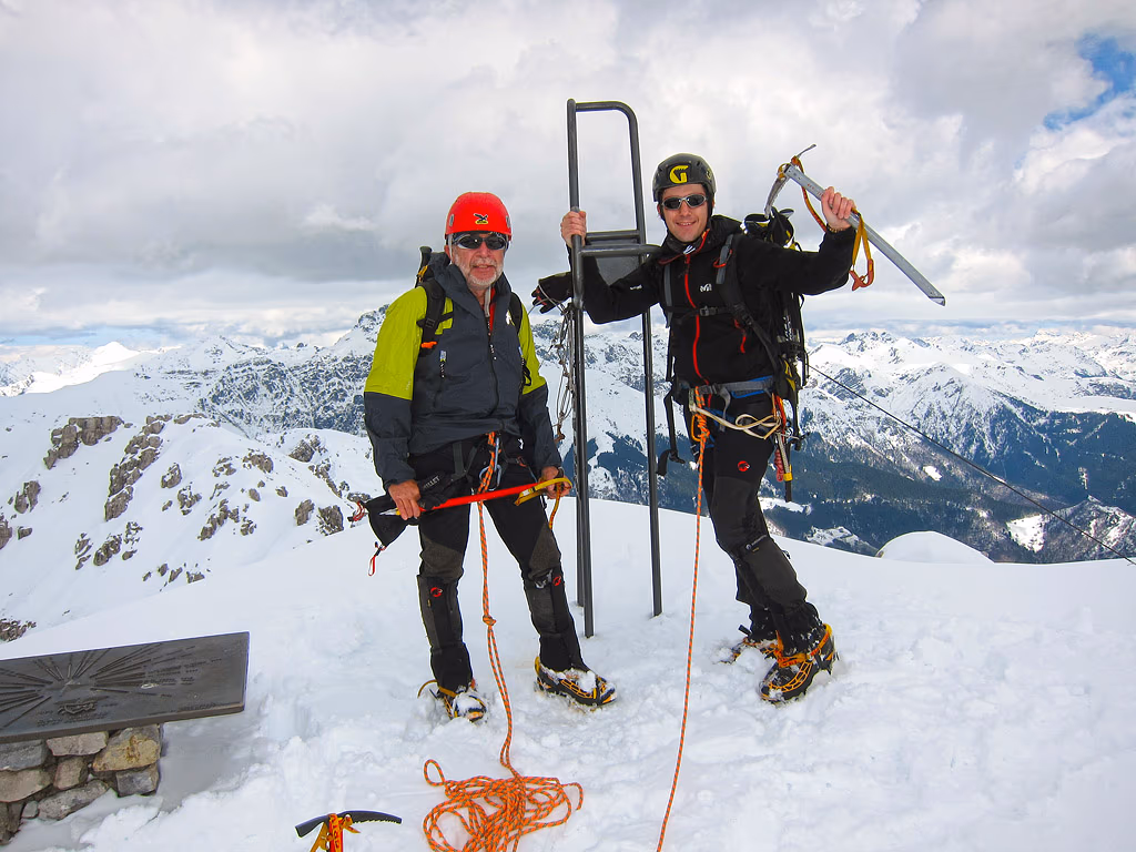 Siamo i primi e quelli che ci seguono fanno molto meno fatica, ma sai la soddisfazione! Dalla cima del Zucco Pesciola quota 2096 m seguiamo la cresta verso E fino ad arrivare all’intaglio che precede la cima del Zuccone Campelli. Qui bello legato mi faccio calare un pezzo fino a trovare e a liberare la catena che ci aiuterà nella calata. Al fondo dell’intaglio risaliamo in breve un tratto di misto e siamo in vetta al Zuccone Campelli 2167 m.