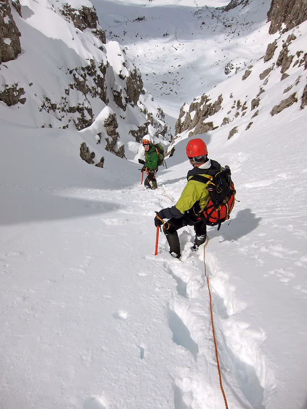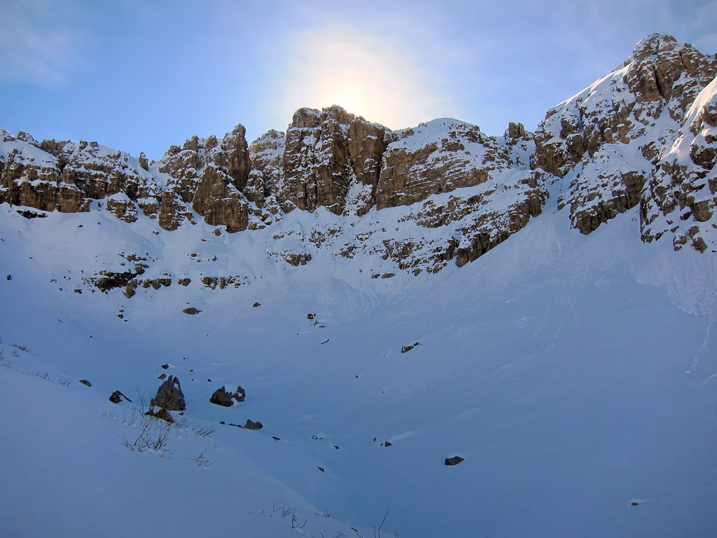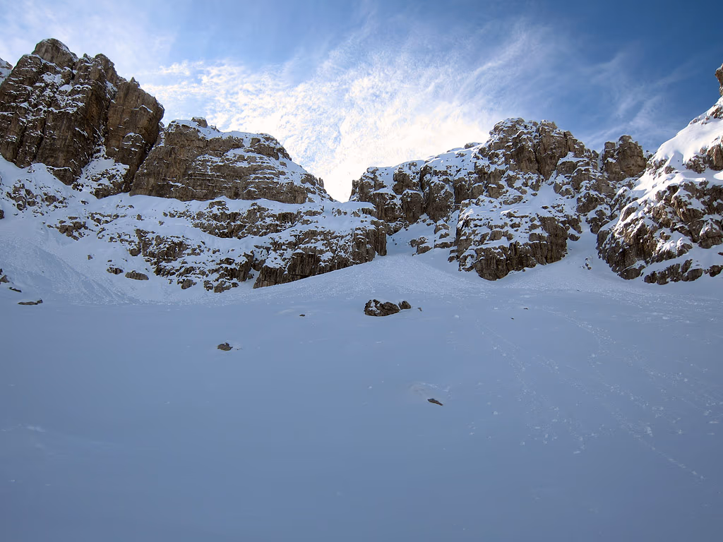 Entriamo nel canale e lo percorriamo fino all’intaglio della cresta, con divertente, ma assai faticosa salita. D’estate ci sono dei facili saltini di roccia un poco friabile, ora la neve, appena caduta, non ha potuto gelare sulla roccia e quindi dobbiamo quasi spalarla via con le mani e pestarla con gli scarponi per trovare appigli e creare appoggi.