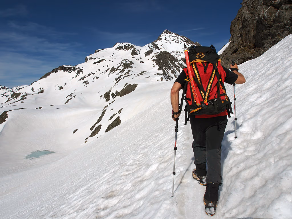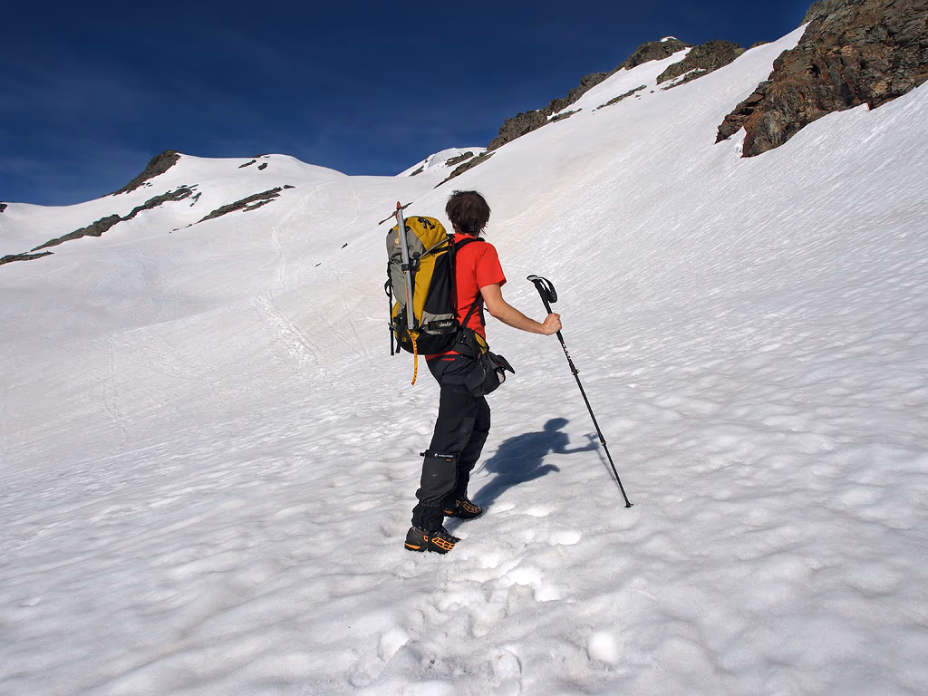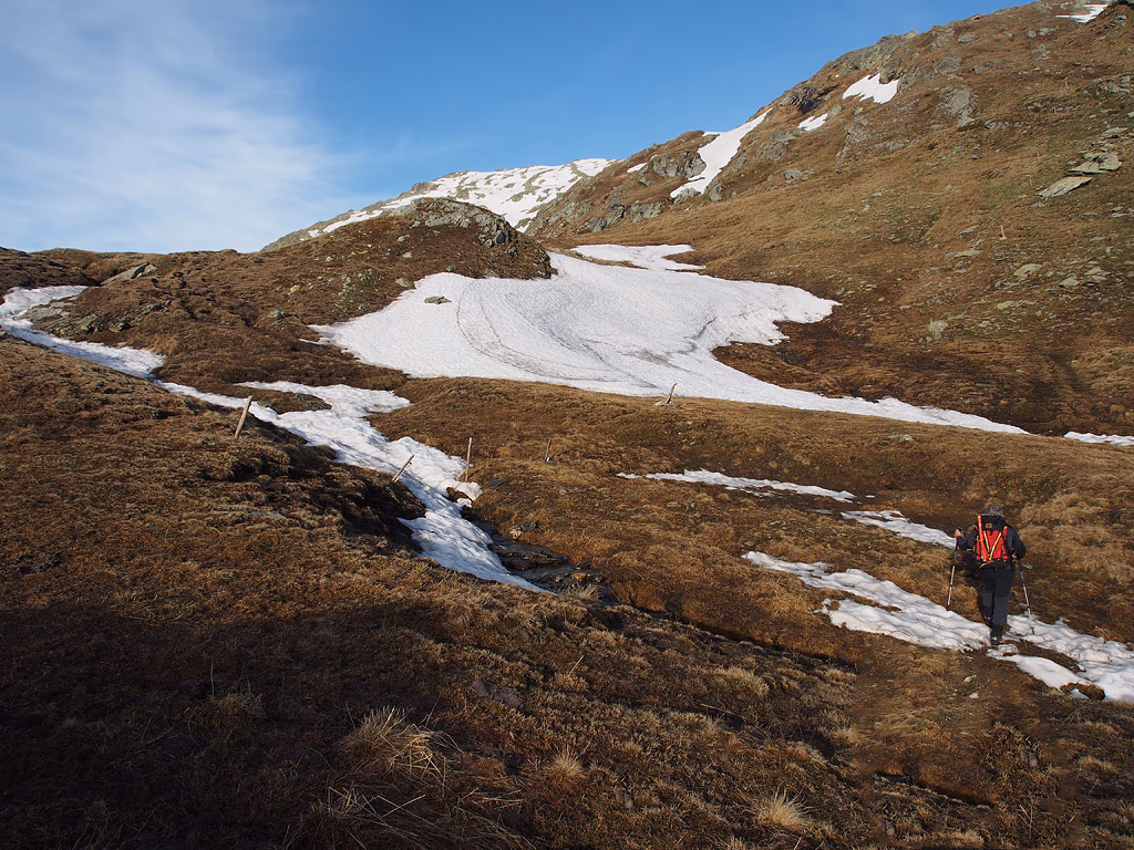 A circa quota 2450 m troviamo uno strato di neve continua, delizia per i molti scialpinisti che ci seguono o che ci precedono, ma abbastanza dura e quindi procediamo senza fatica. Per sicurezza ci siamo portati l’attrezzatura: picozza, ramponi, imbrago e cordino, ma non ne avremo bisogno. Percorriamo sempre nella stessa direzione guadagnando progressivamente quota, fino a un punto vicino alla sommità della cresta di OSO a circa 3050 m.