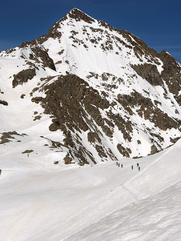 Come sempre cerchiamo le condizioni meteo migliori per un’ascensione. Quindi eccoci alle 7,30 al Passo dello Spluga m 2114 con un bel sole e temperatura vicina allo zero. Dovremmo trovare la neve, caduta lo scorso maggio, abbastanza dura e quindi non sprofondare troppo. Iniziamo la salita prendendo la traccia di sentiero che parte dietro la casermetta della Guardia di Finanza e che si innalza su dossi in direzione OSO verso la cima del Pizzo Tambò 3279 m, che vediamo diritta davanti a noi.
