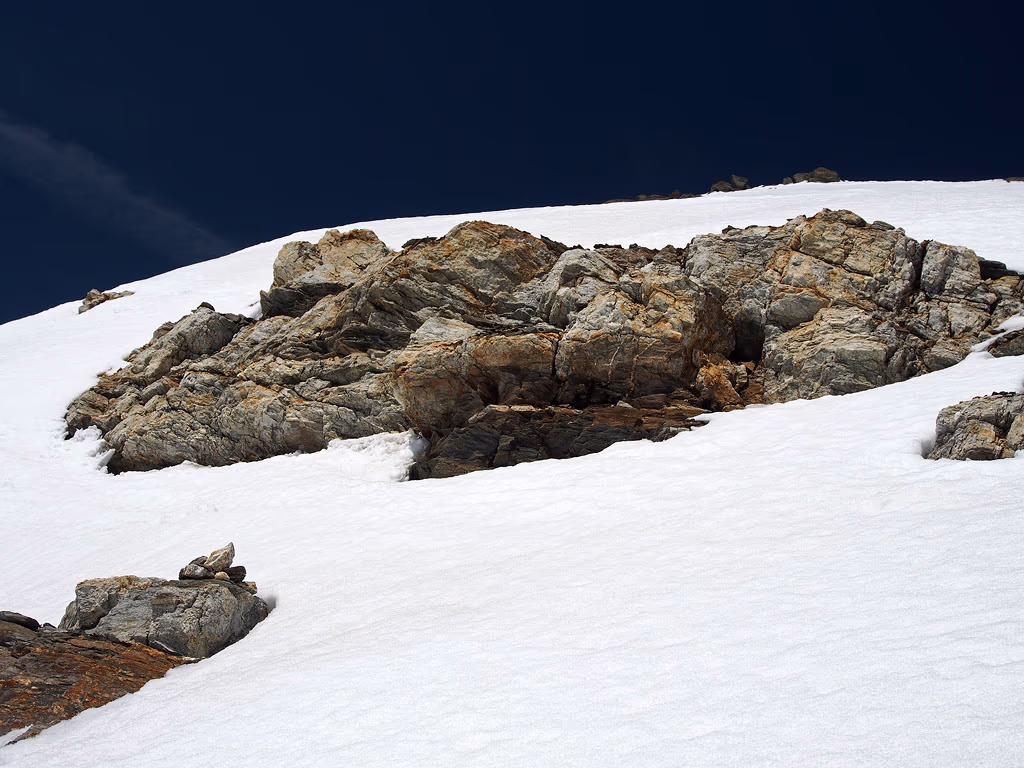 Noi a questo punto attraversiamo a mezza costa, sempre su neve, un valletta prima in leggera discesa e poi in salita fino a guadagnare la sella da cui parte uno scivolo di neve che ci conduce all’ultimo tratto di cresta. Questa parte, di rocce ora compatte, ora rotte e segnalata da ometti, ricorda il tratto terminale del Pizzo Scalino.