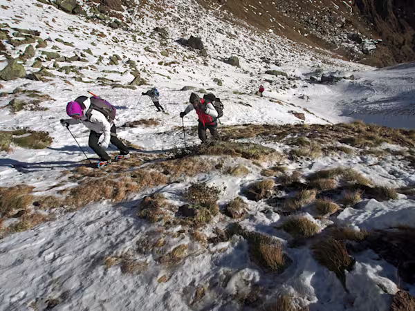 Da qui è visibile tutto il percorso fino alla Bocchetta d’Inferno. Breve sosta tè e ripartiamo seguendo l’evidente sentiero che guadagna rapidamente quota. Superata una prima baita attraversiamo il torrente e quindi, piegando decisamente verso destra, affrontiamo alcuni ripidi tornanti dove finalmente incontriamo la prima neve. Finora è stato un’inverno eccezionalmente caldo e secco, l’esatto contrario di quello passato. Qui le raffiche di vento ci costringono a rintanarci in una bellissima baita ricavata sotto il tetto di un’enorme pietra.