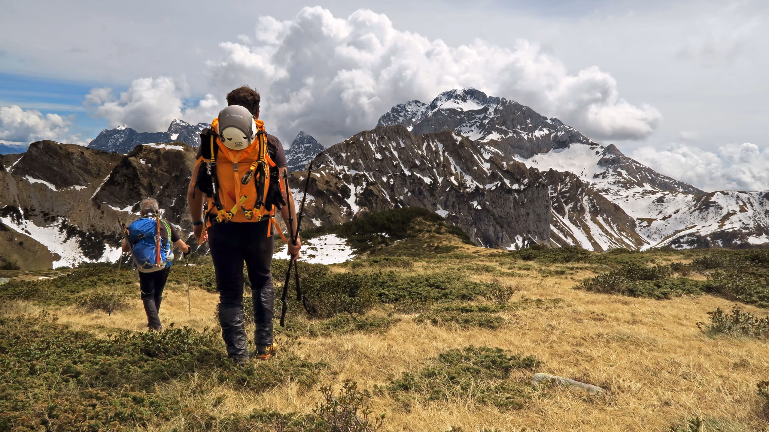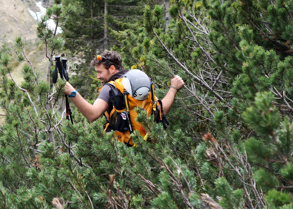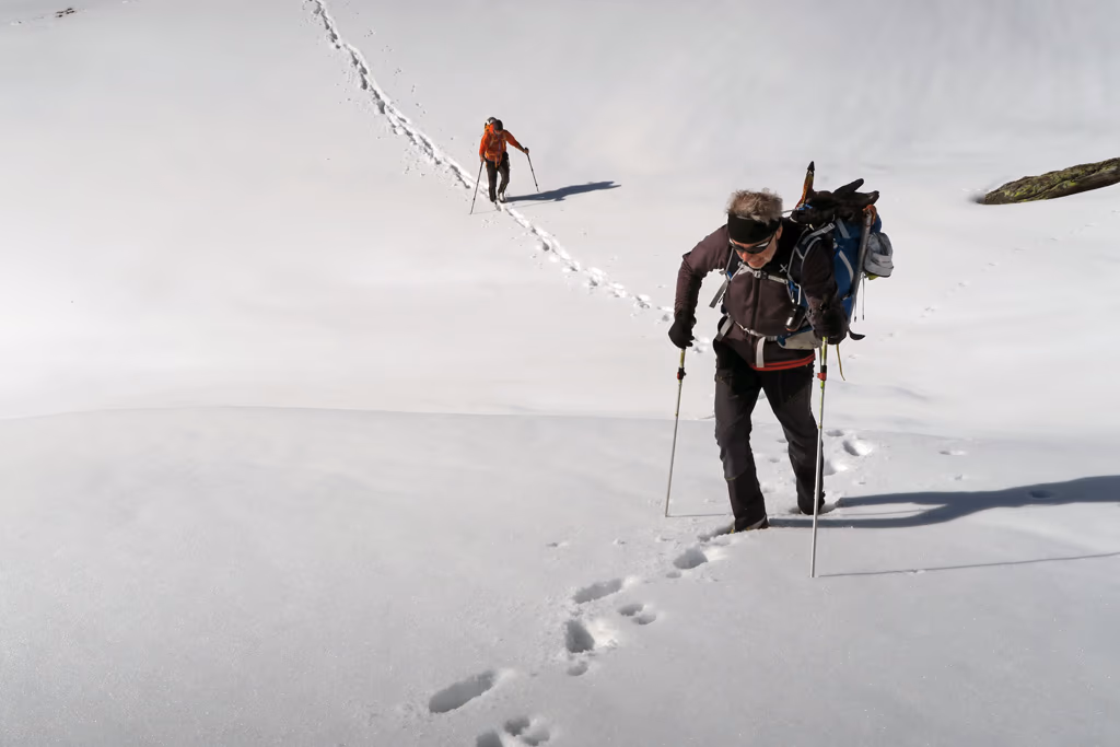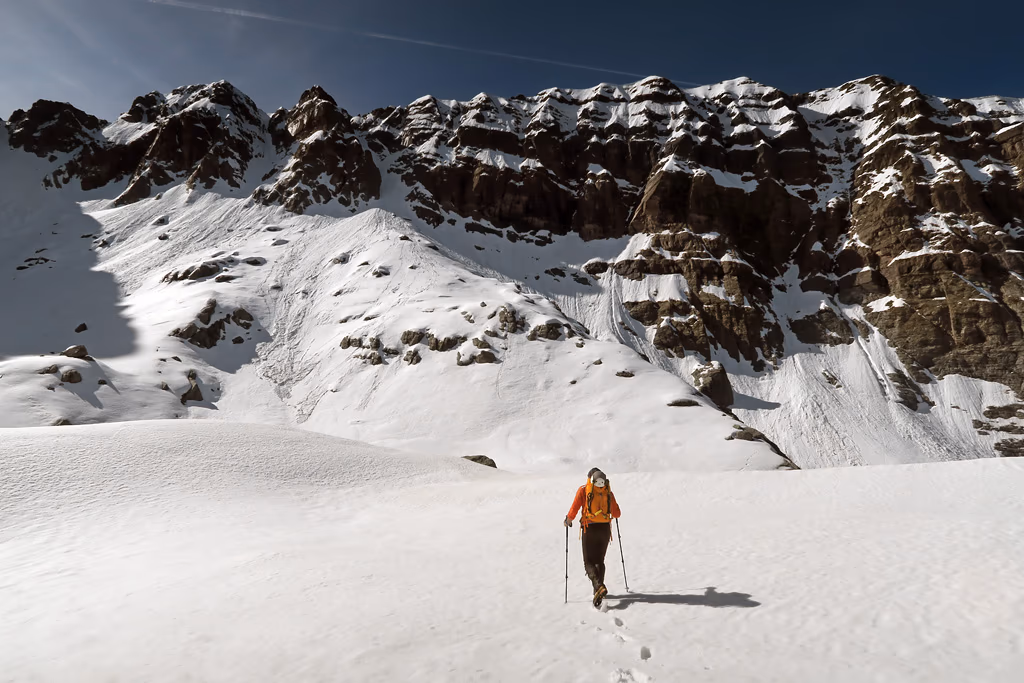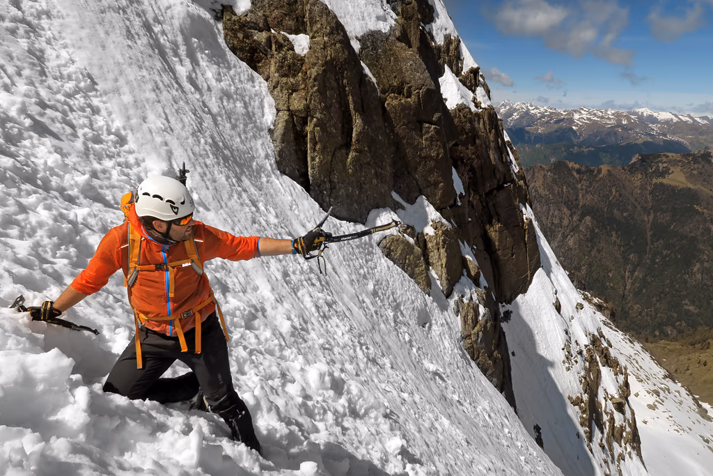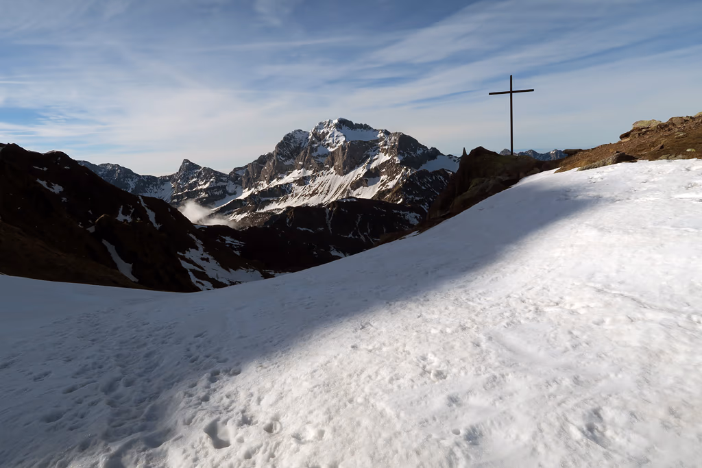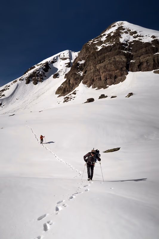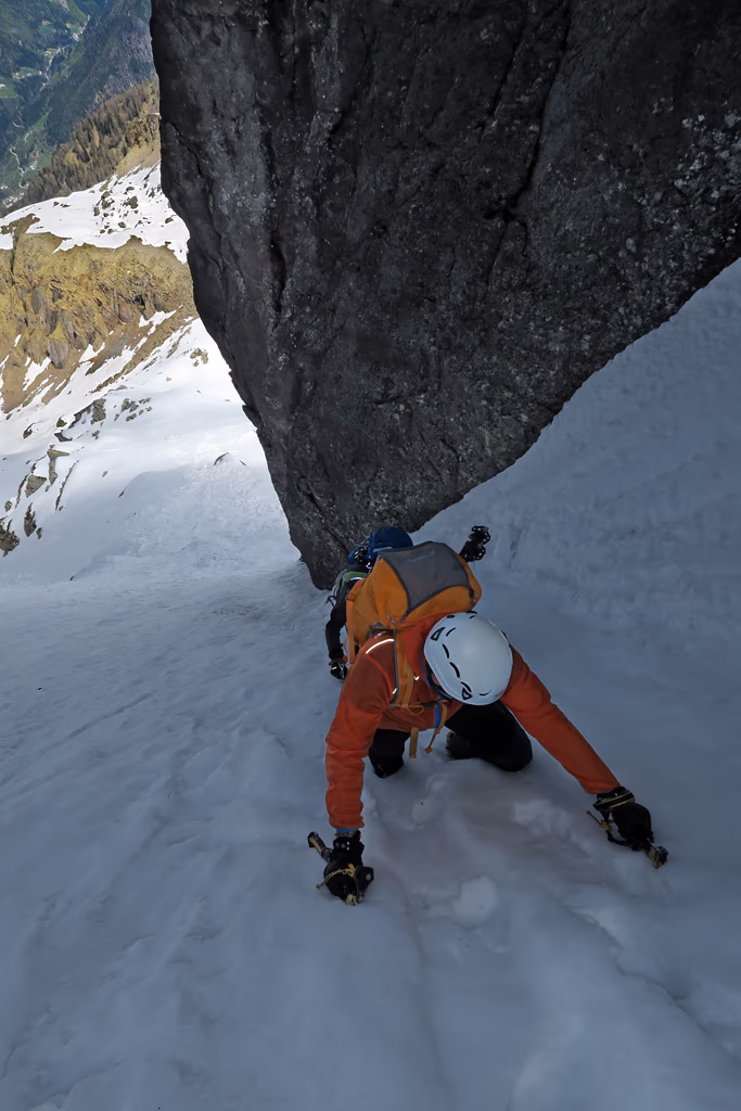Risaliamo il primo tratto con qualche zig zag e innumerevoli sfondoni orobici fino a circa metà dove ci fermiamo presso un grosso masso ed indossare casco, imbrago, ramponi e tirare fuori le picche. Ora il canale si restringe e prosegue quasi diritto con pendenze mai superiori ai 40°/45°. A metà circa del canale troviamo un breve salto di roccia, che purtroppo non riusciamo ad affrontare per via di un grosso buco che ci impedisce fisicamente di raggiungerlo. Lo aggiriamo quindi sulla destra su neve poco portante. Procediamo con una certa fatica alternandoci nel battere il percorso. Verso la fine troviamo placche di neve dura che, con l’uso delle doppie picche, non ci impensierisce più di tanto. Ecco ora al culmine del canale ad una bocchetta a quota 2340 m circa.