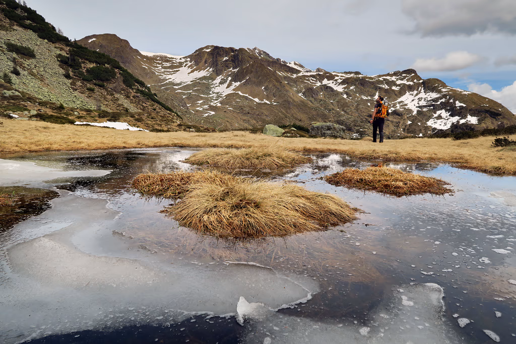 Così parto di buon passo, accompagnato dall’inseparabile padre e l’amico Stefano, verso il Passo di Mezzeno posto a 2144 m con il versante nord dell’Arera a farci compagnia. Dopo aver goduto brevemente del bell’affaccio sulla valle dei Laghi Gemelli e sulla corona di monti che la circondano, puntiamo verso NW costeggiando il versante W del Monte Spondone, per arrivare ad una sella posta all’attacco della cresta S del Monte del Tonale quota 2275 m circa. La copertura nevosa si presenta continua ed abbastanza portante per il momento. La speranza è che che tenga per il proseguo!