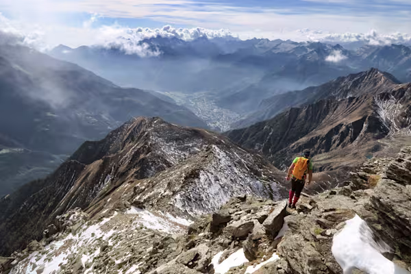 Il percorso si svolge interamente sul filo di cresta (ometti) con una seconda parte rocciosa costituita da grossi blocchi instabili: ogni appoggio va testato per evitare di fare una rovinosa caduta. L’unica vera “difficoltà” è una breve paretina di II° poco prima del tratto finale. Stefano è ormai cotto ma con grande determinazione non molla e, dopo un ultimo tratto nevoso tocchiamo i 3107m della vetta dopo 7h e mezza! Siamo solo a metà dell’opera però, ora dobbiamo ridiscendere ai 400m di Piuro!