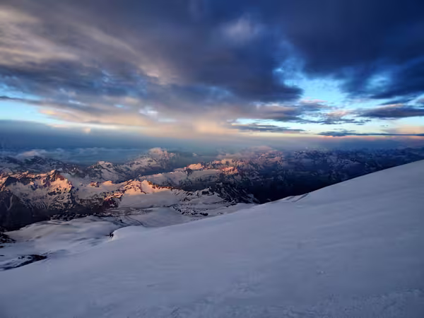 Una prima rampa attrezzata con una corda fissa mette a dura prova i polmoni: la quota comincia a farsi sentire. Ci alziamo sempre di più ma la vetta non arriva mai. La cima vera è propria è spostata verso ovest, l’ultimo tratto sembra non finire mai. Eccoci sul tetto d’Europa a 5642m, non c’è una nuvola, un momento bellissimo. Il vulcano è situato oltre la catena del Caucaso, verso nord non ci sono montagne di rilievo, il panorama si perde senza confini in direzione della Russia, emozionante!