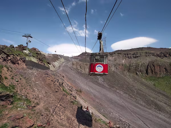 Trasferimento in pullman fino alla funivia di Azau. Dobbiamo portare su tutto, acqua e viveri compresi. Ci organizziamo con una sorta di catena umana per velocizzare il carico dei materiali nella cabina. L’impianto versa in condizioni preoccupanti, la cabinovia invece sembra appena costruita. Primo tronco fino a 3000m, nuova catena umana, e via verso i 3500m della stazione a monte. Impressionante la roccia nera della montagna che ci ribadisce ancora una volta che stiamo salendo un vulcano.