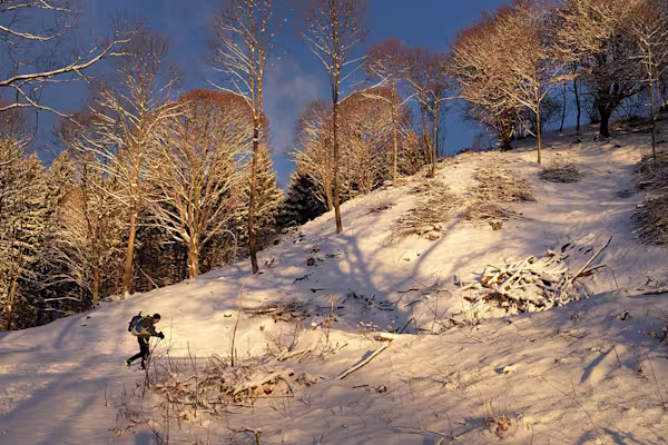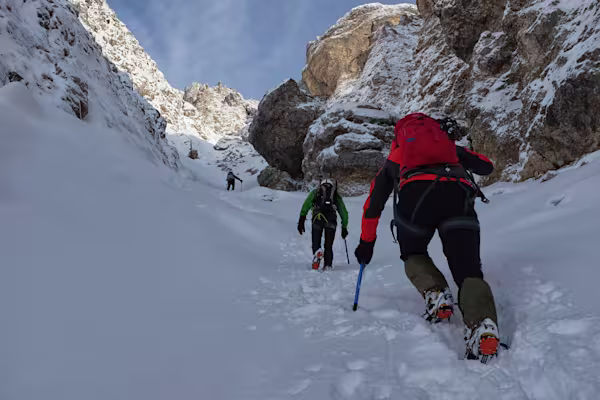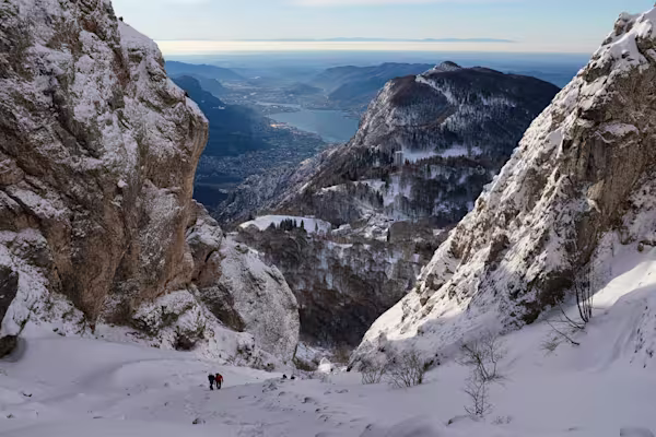 Calziamo i ramponi e attacchiamo il canale, inizialmente con i bastoncini visto che le pendenze sono modeste. Da metà canale in poi la piccozza torna utile. La nevicata della notte poggia sul vecchio strato di neve dura, la progressione è agevole.