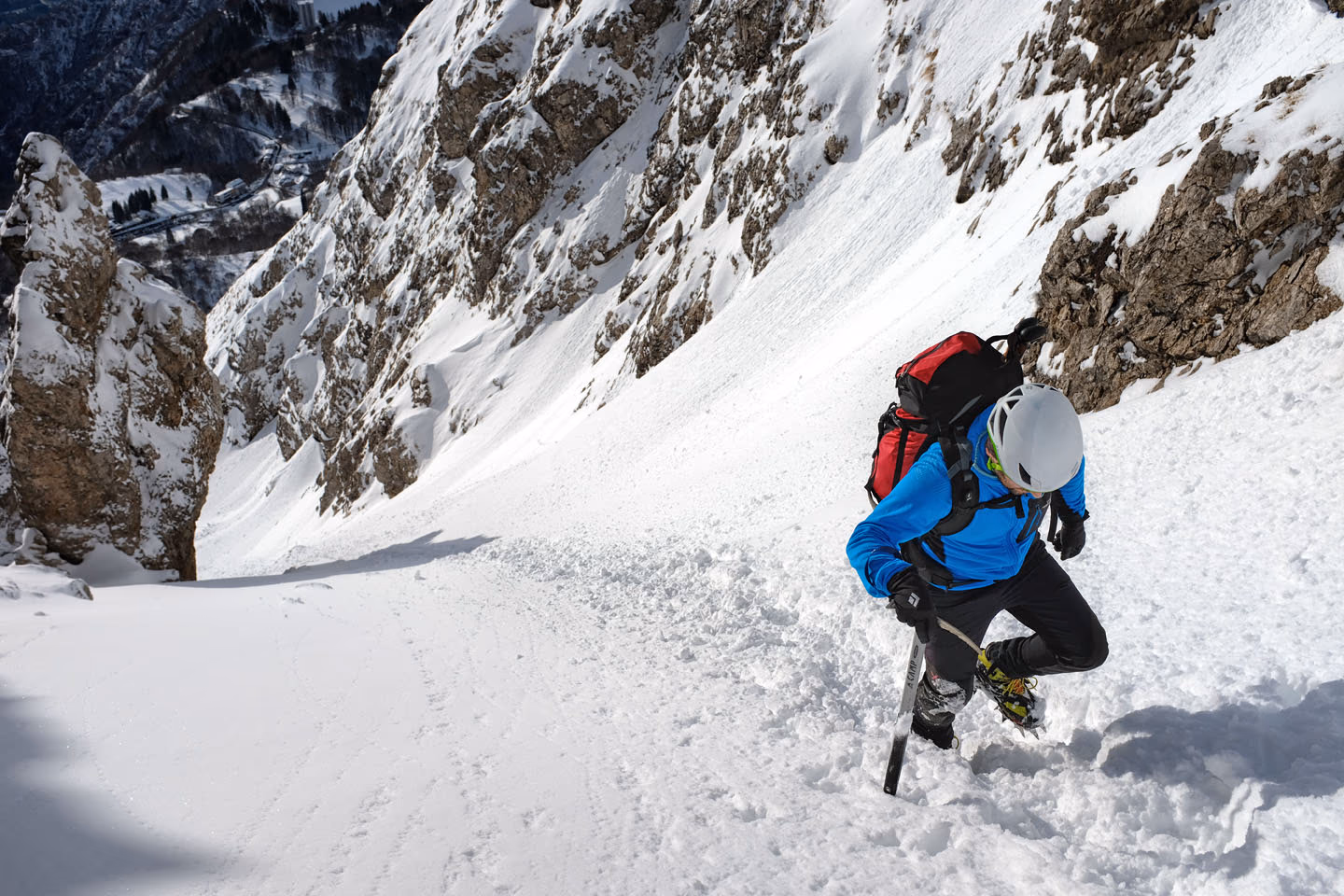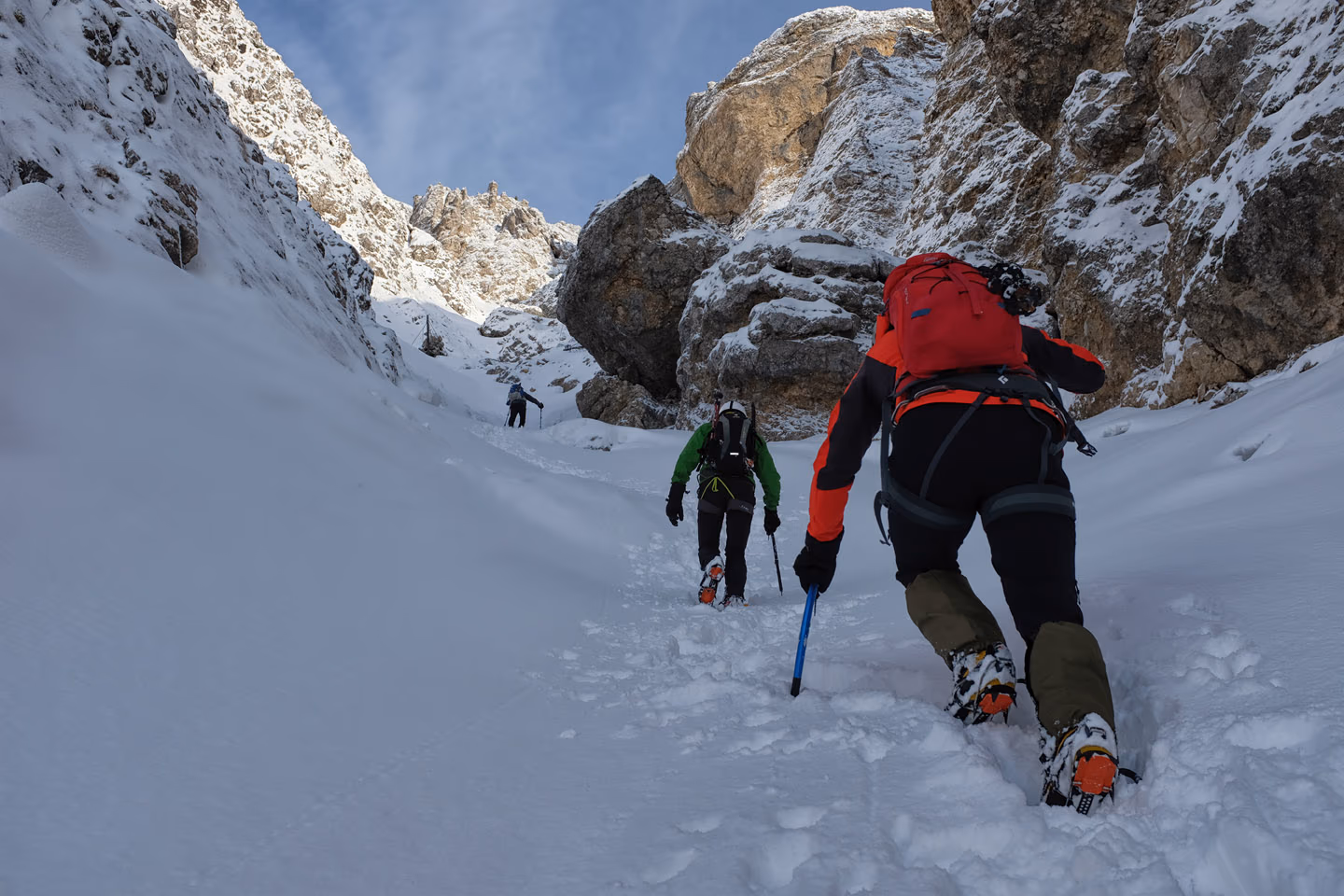 Calziamo i ramponi e attacchiamo il canale, inizialmente con ibastoncini visto che le pendenze sono modeste. Da metà canale in poi lapiccozza torna utile. La nevicata della notte poggia sul vecchio strato di neve dura, la progressione è agevole.