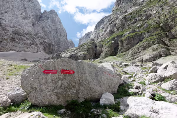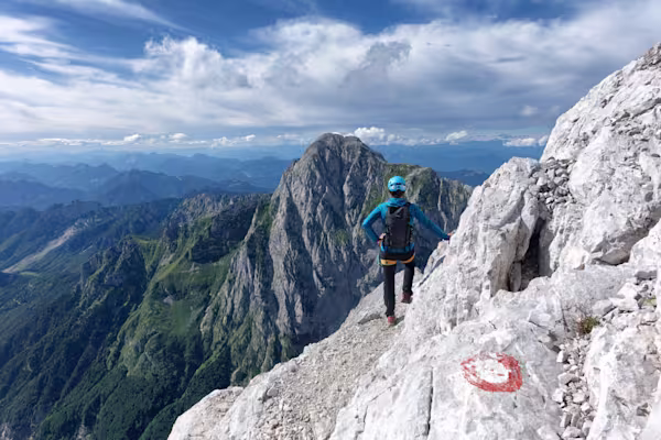 Alcune relazioni citano un bivacco, noi non lo abbiamo trovato. Il sentiero, nella parte alta, si unisce a quello che sale dal canalone, piegando verso destra. Facciamo una breve pausa al passo — cartelli indicatori — e ripartiamo verso la nostra meta sul filo di cresta. Per placche di calcare prima e detriti poi arriviamo all’attacco della ferrata posto sulla sella Škrbina v Prode.