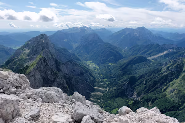 Siamo soli, il panorama è immenso in ogni direzione. Dal Canin al Triglav fin verso il Großglockner. Sotto di noi la Valle di Trenta con le sorgenti dell’Isonzo visitate il giorno prima. Le Giulie sono bellissime: impervie e selvagge sono diverse da qualsiasi parte delle Alpi abbia visto. Qui si registrano i massimi pluviometrici di tutta la catena alpina.