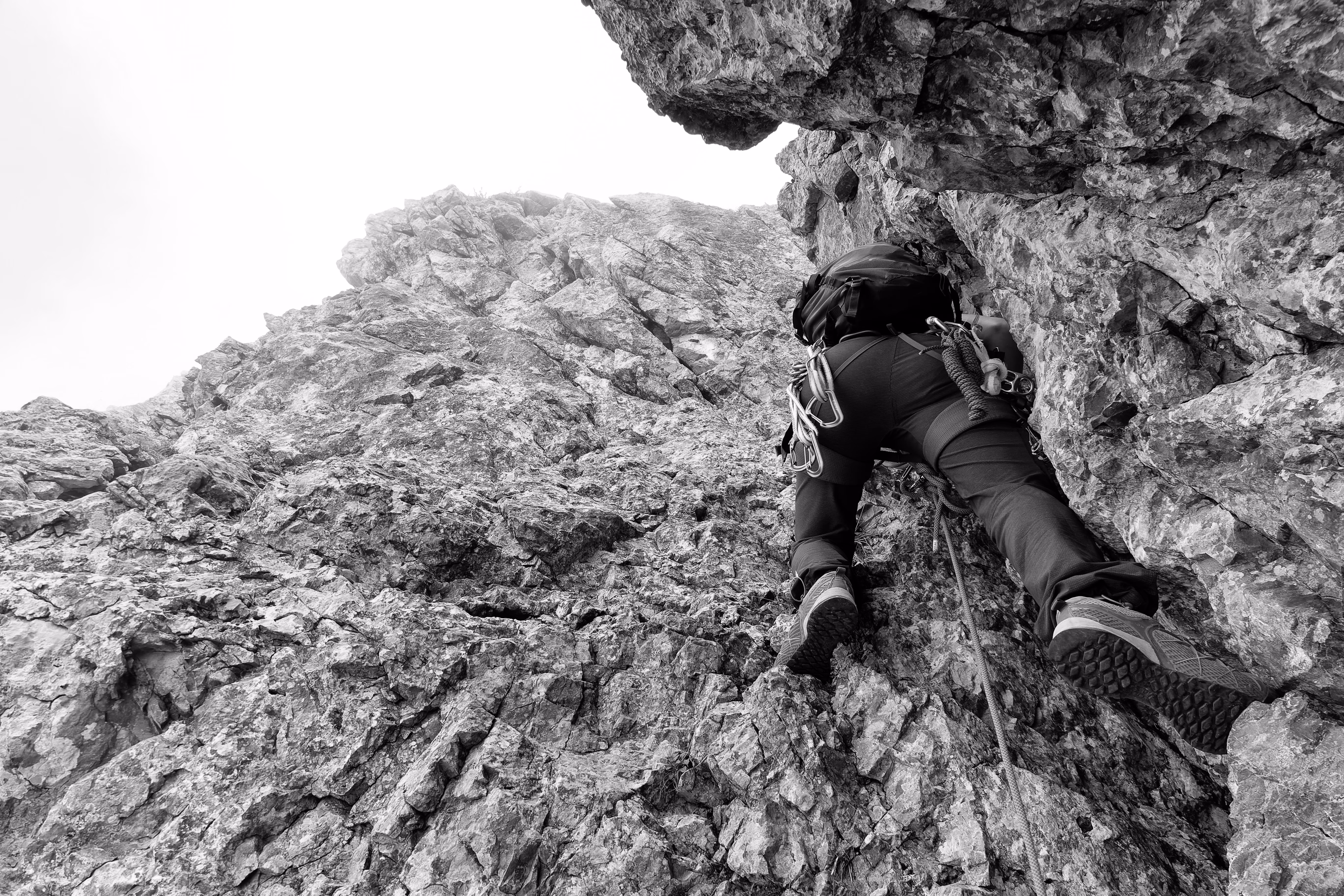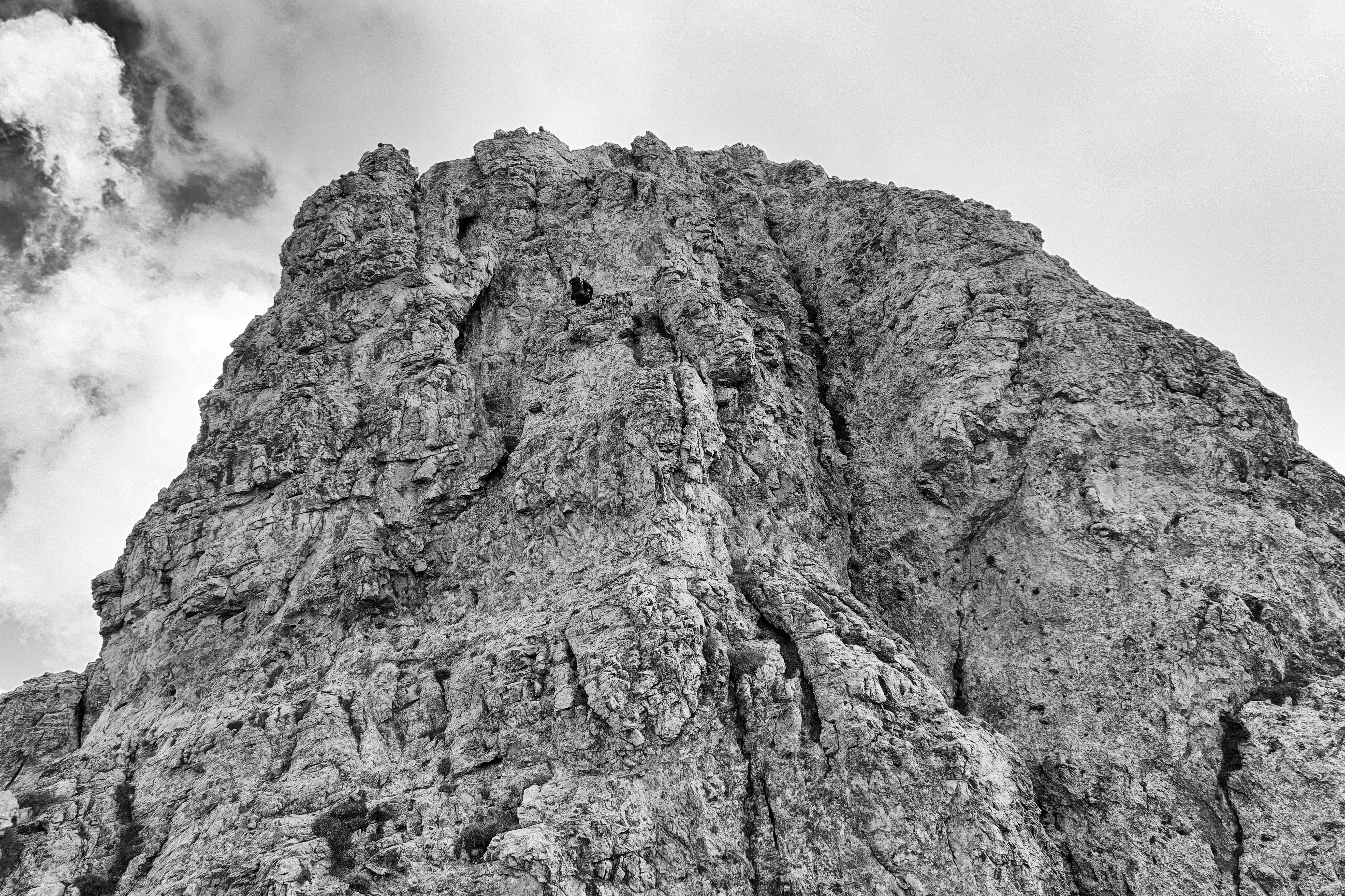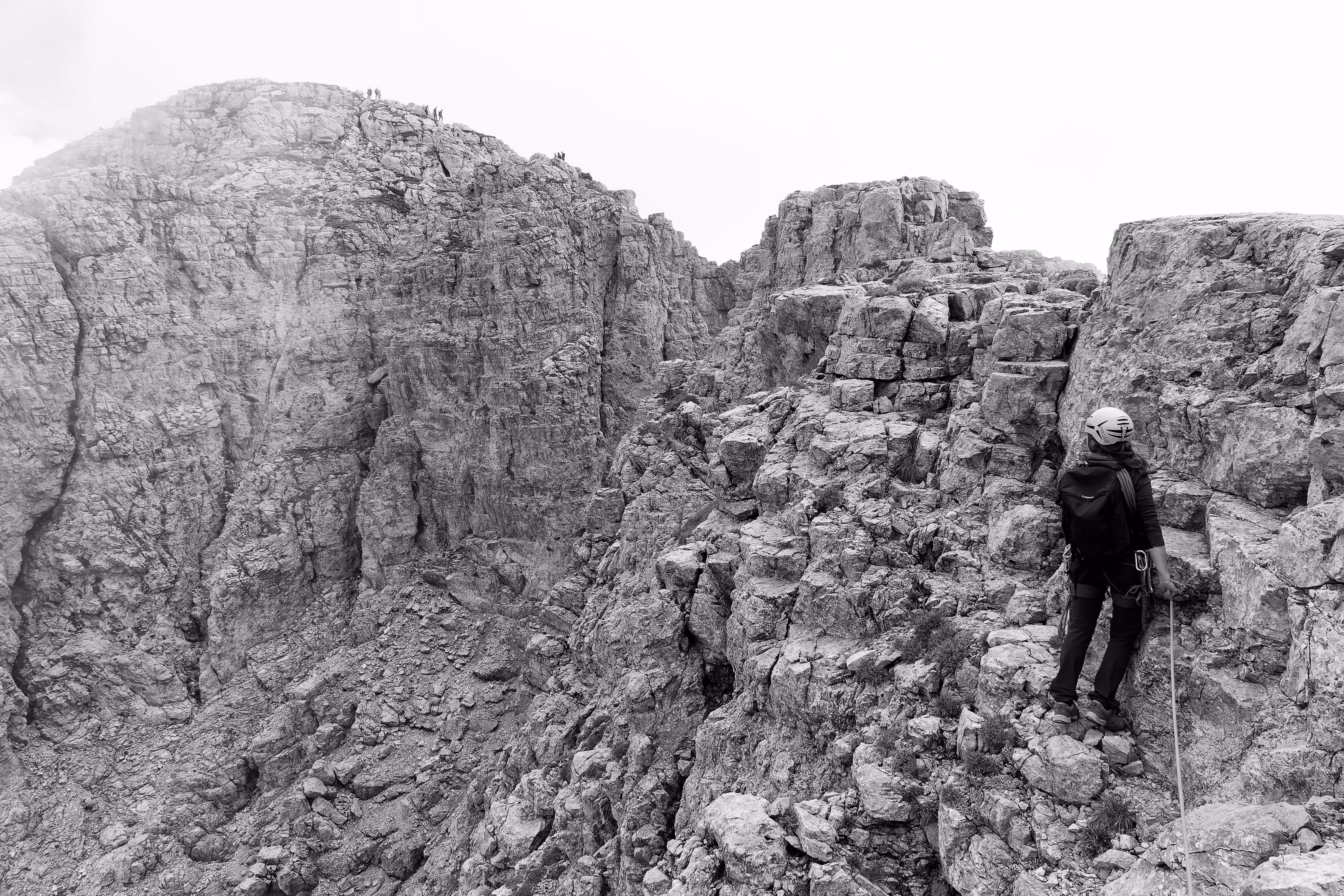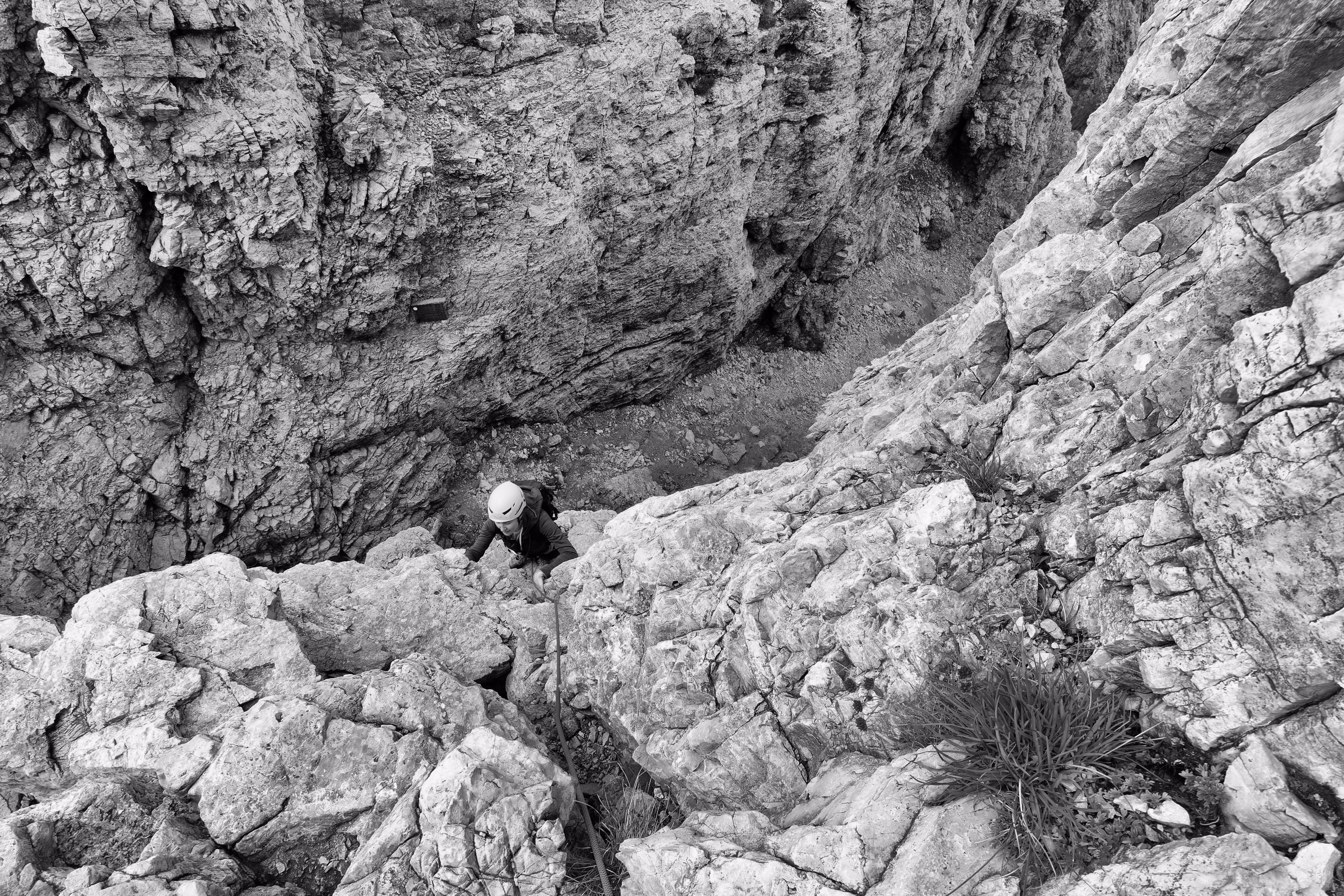 Via facile, molto panoramica ma purtroppo parecchio discontinua. La si fa più per l’ambiente che per l’arrampicata in se. Molto noiosi i tratti in discesa, tra sfasciumi e ghiaia instabile. Facendola tutta in conserva si risparmia molto tempo, ma bisogna avere esperienza su questo tipo di terreno e sentirsi sicuri sul terzo grado verticale. La scarpe da avvicinamento sono perfette, più comode delle scarpette da arrampicata e più sensibili di uno scarpone. Orientarsi non è difficile ma come al solito i dubbi vengono sempre. La rifarò in una giornata con tempo migliore.