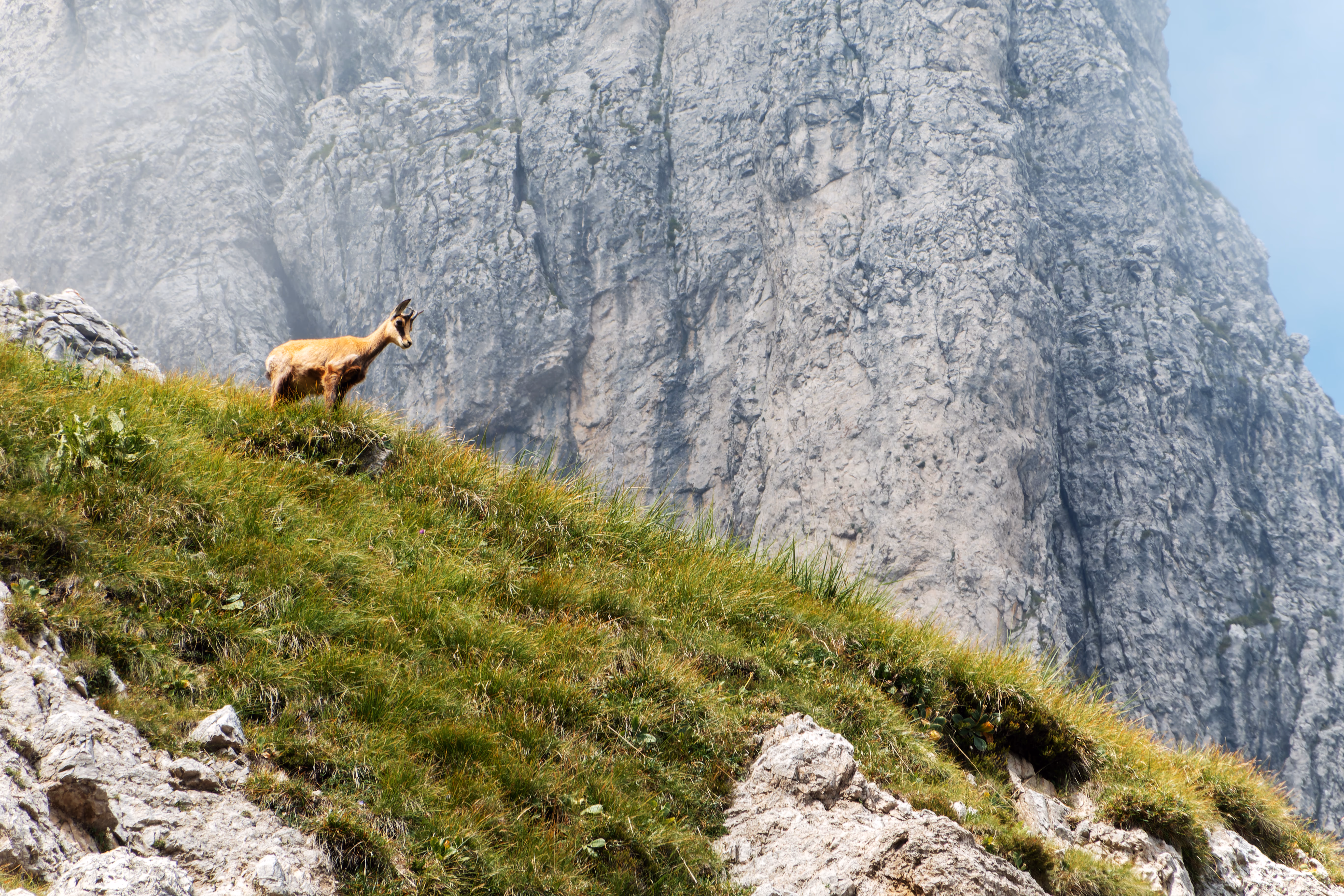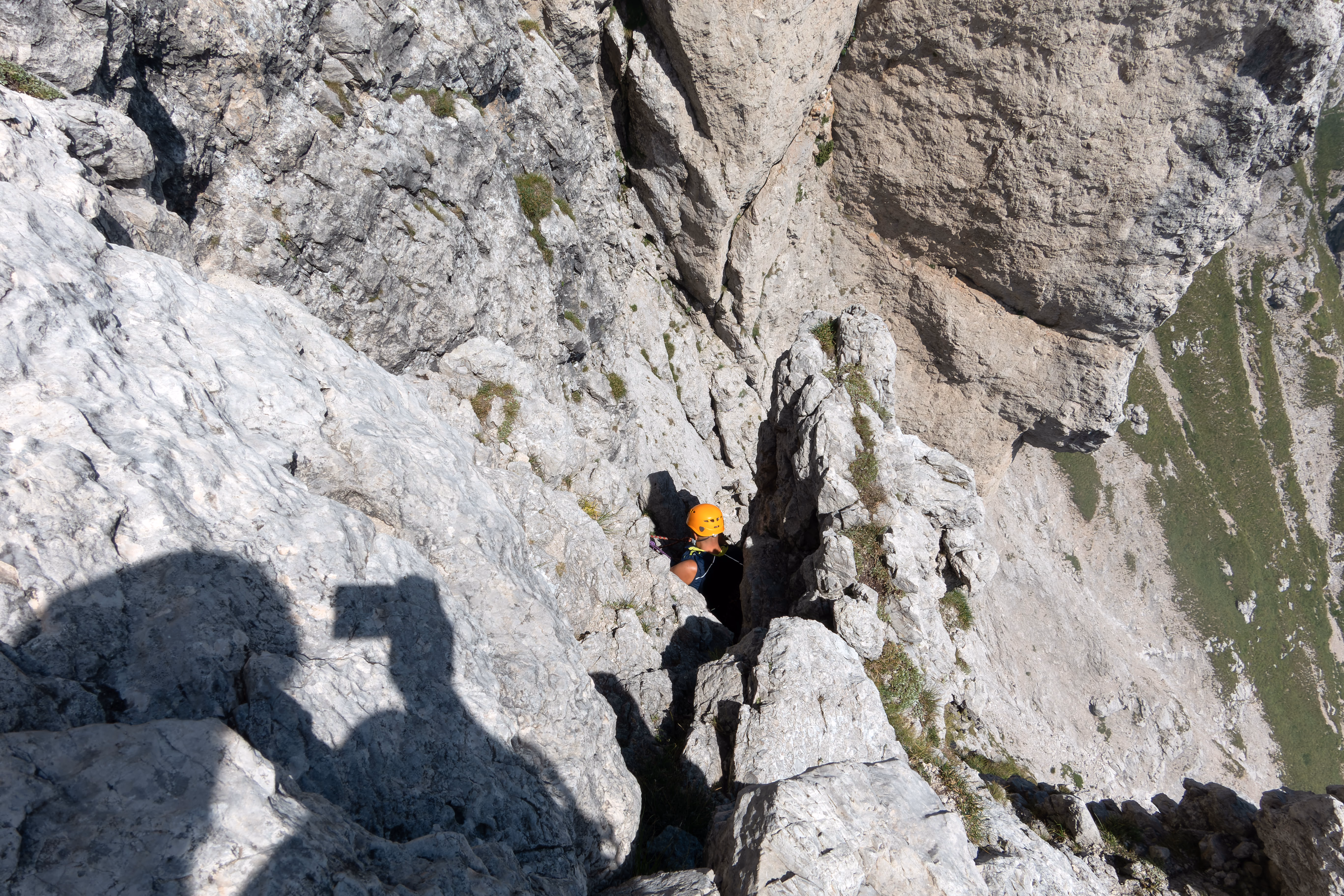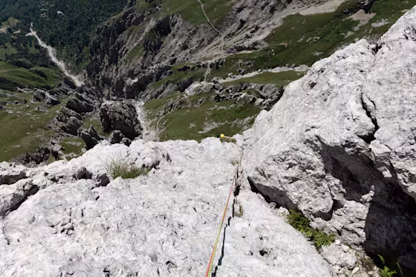Si sale un evidente canale, alla fine del quale è possibile vedere il primo fittone dove rinviare. Tiro molto semplice che sul finale devia a sinistra su un comodo terrazzino dove si trova la prima sosta (III)
