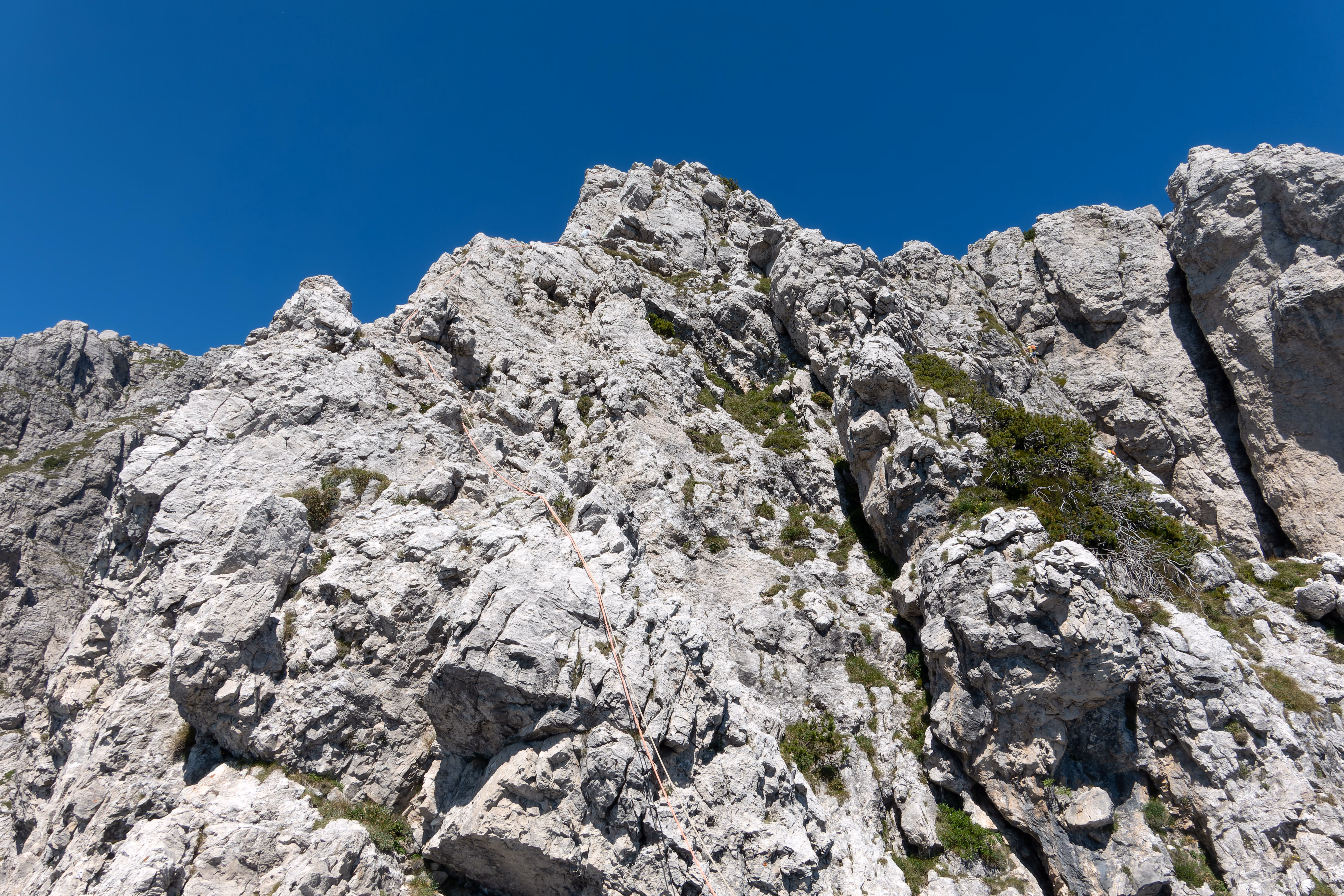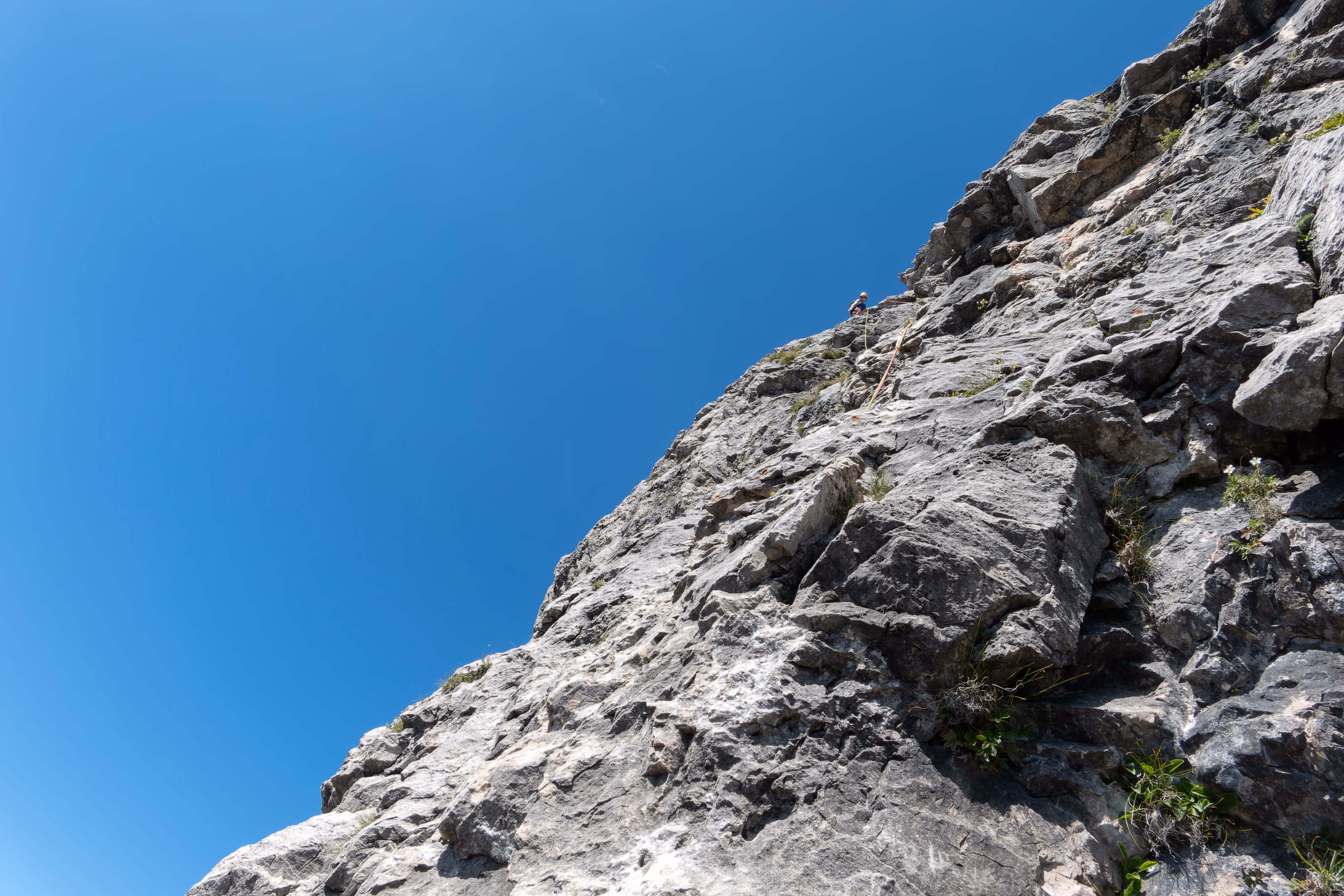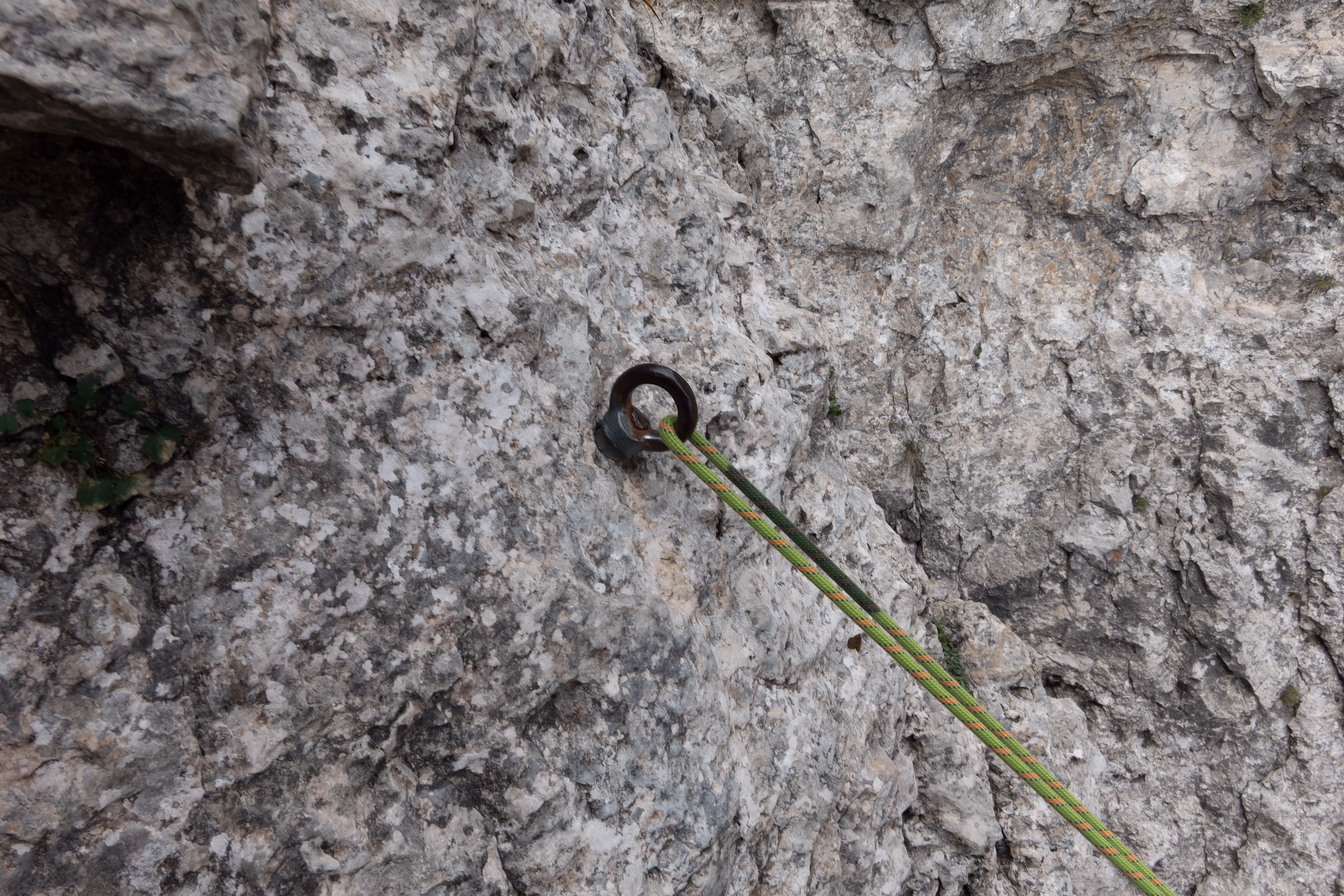 Si sale in verticale puntando un piccolo muretto strapiombante — facile — per poi piegare verso sinistra e trovare la sosta poco dopo. Tiro facile e corto (III)