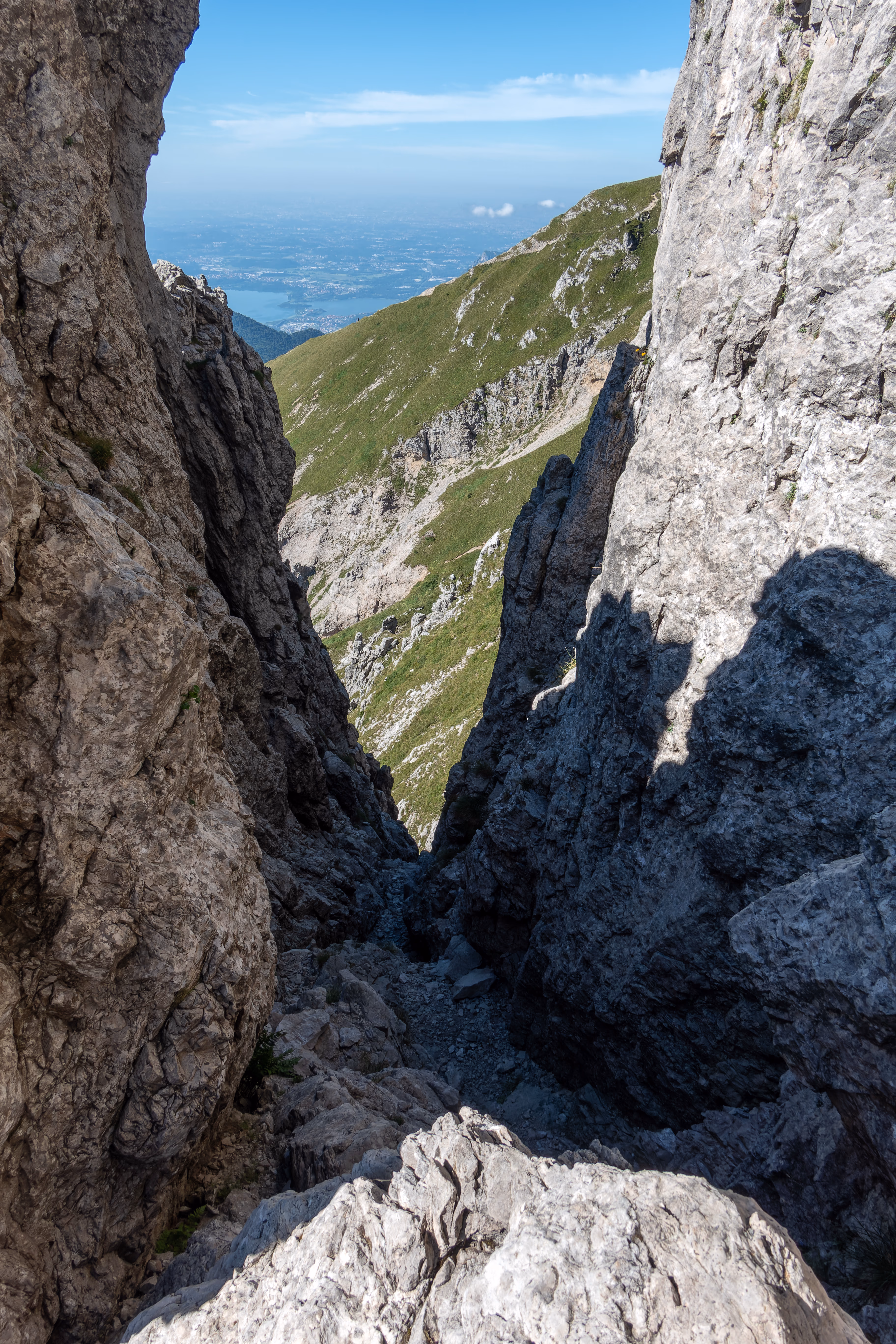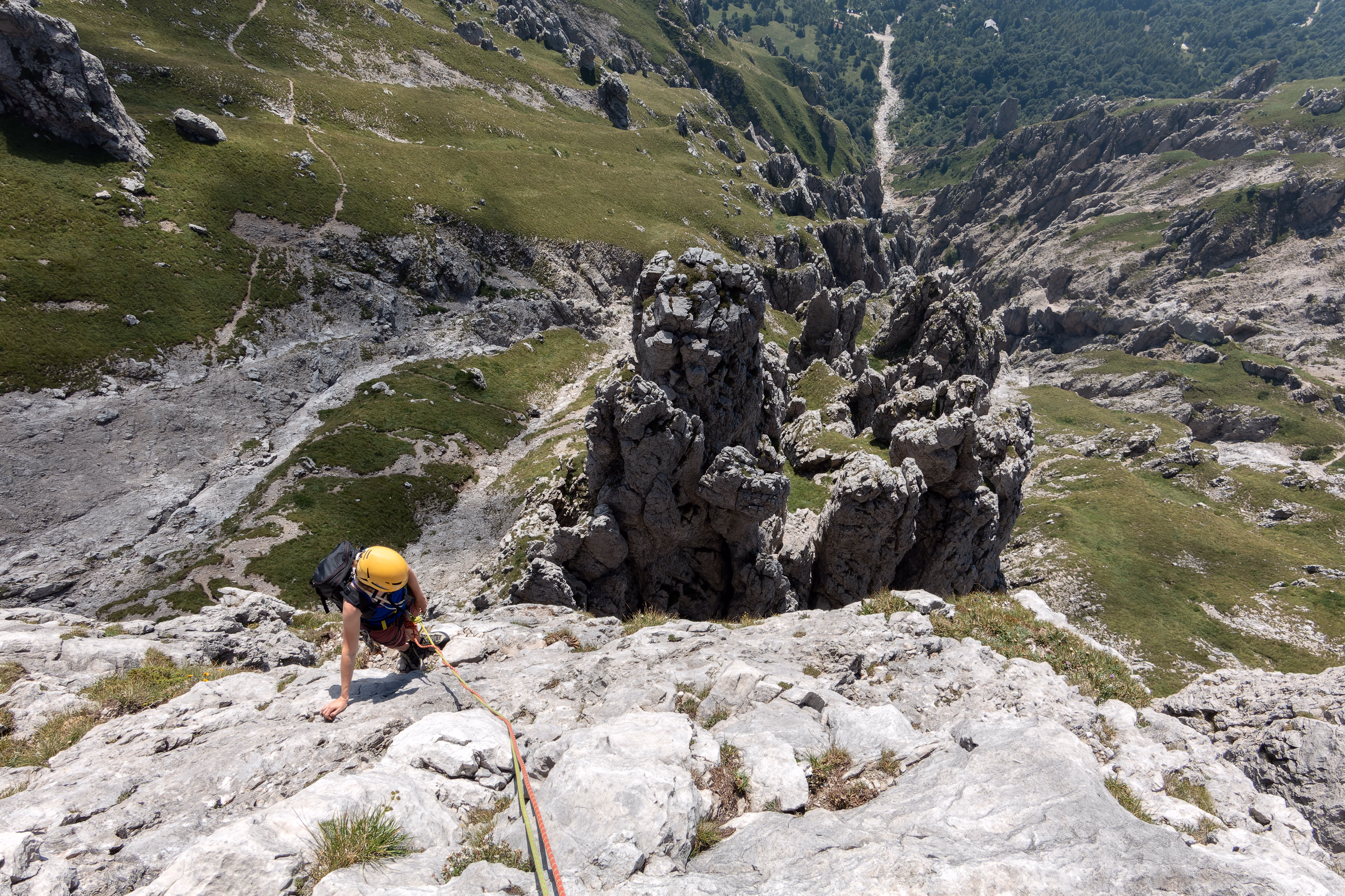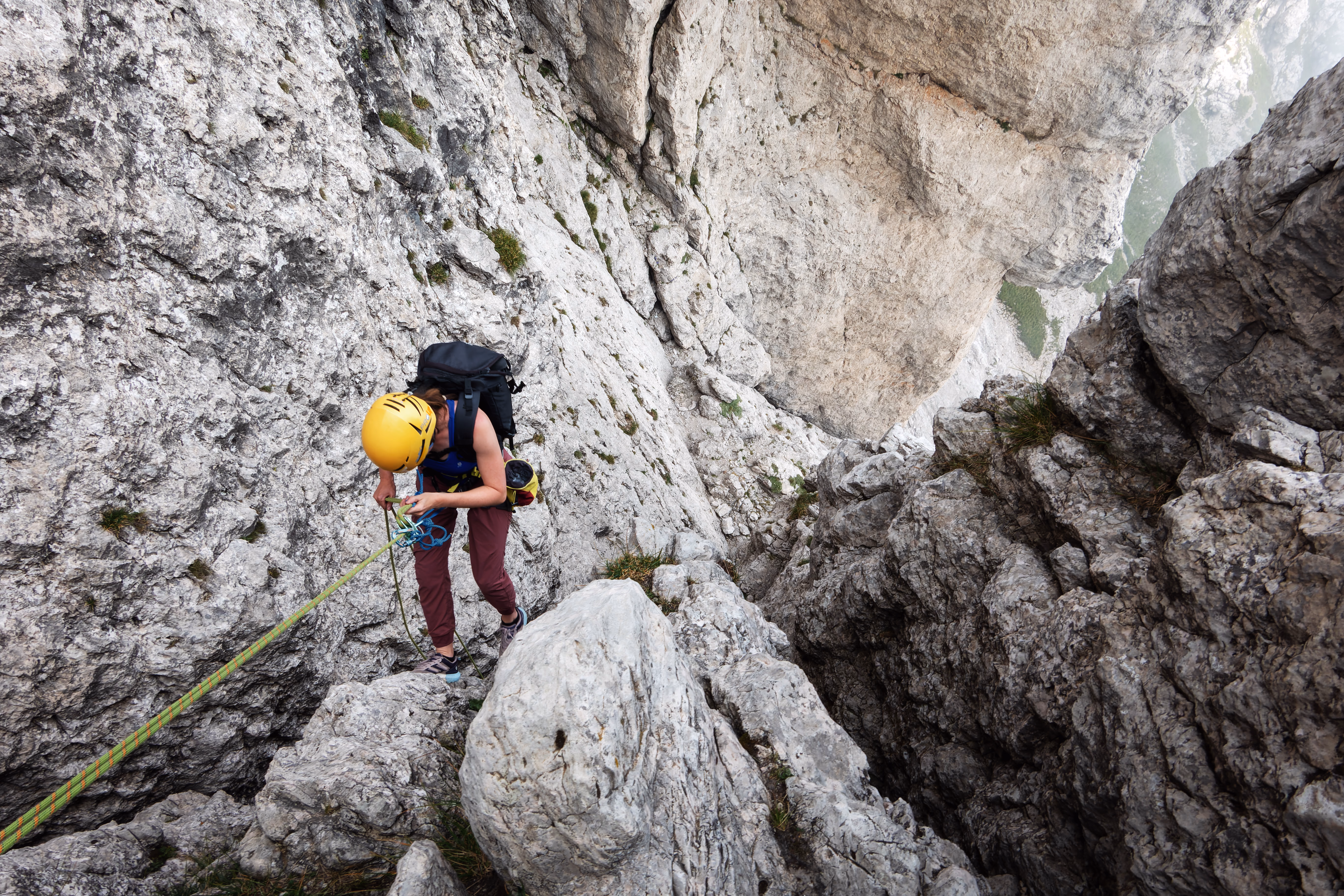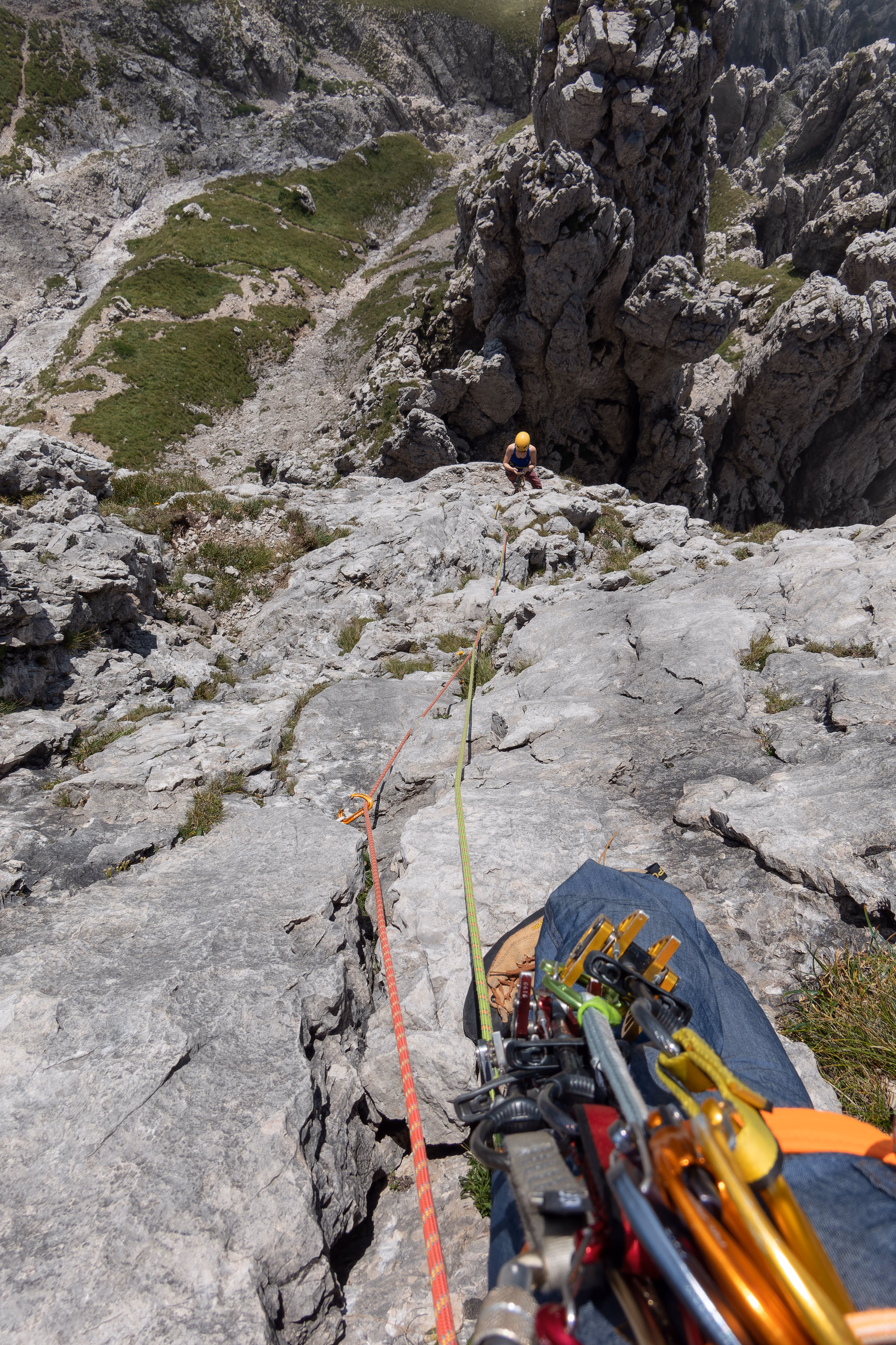 Dalla sosta noi ci siamo slegati scendendo a piedi, con attenzione, fino alla prima sosta di calata che si trova dentro a un intaglio. Da qui volendo è possibile continuare con il “passaggio del traversino” e continuare la traversata dei Magnaghi. Noi invece abbiamo iniziato le calate lungo la via normale. In tutto sono 5 calate da 25m. Volendo si possono anche fare tre calate, la prima sicuramente da 25m fino al terrazzino detritico, poi due da 50m sempre sulla verticale.