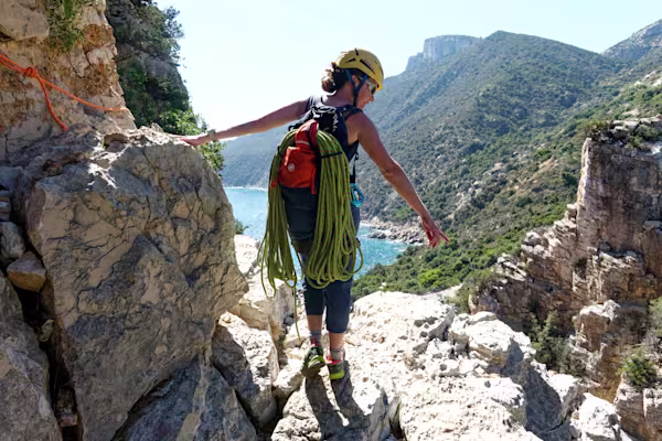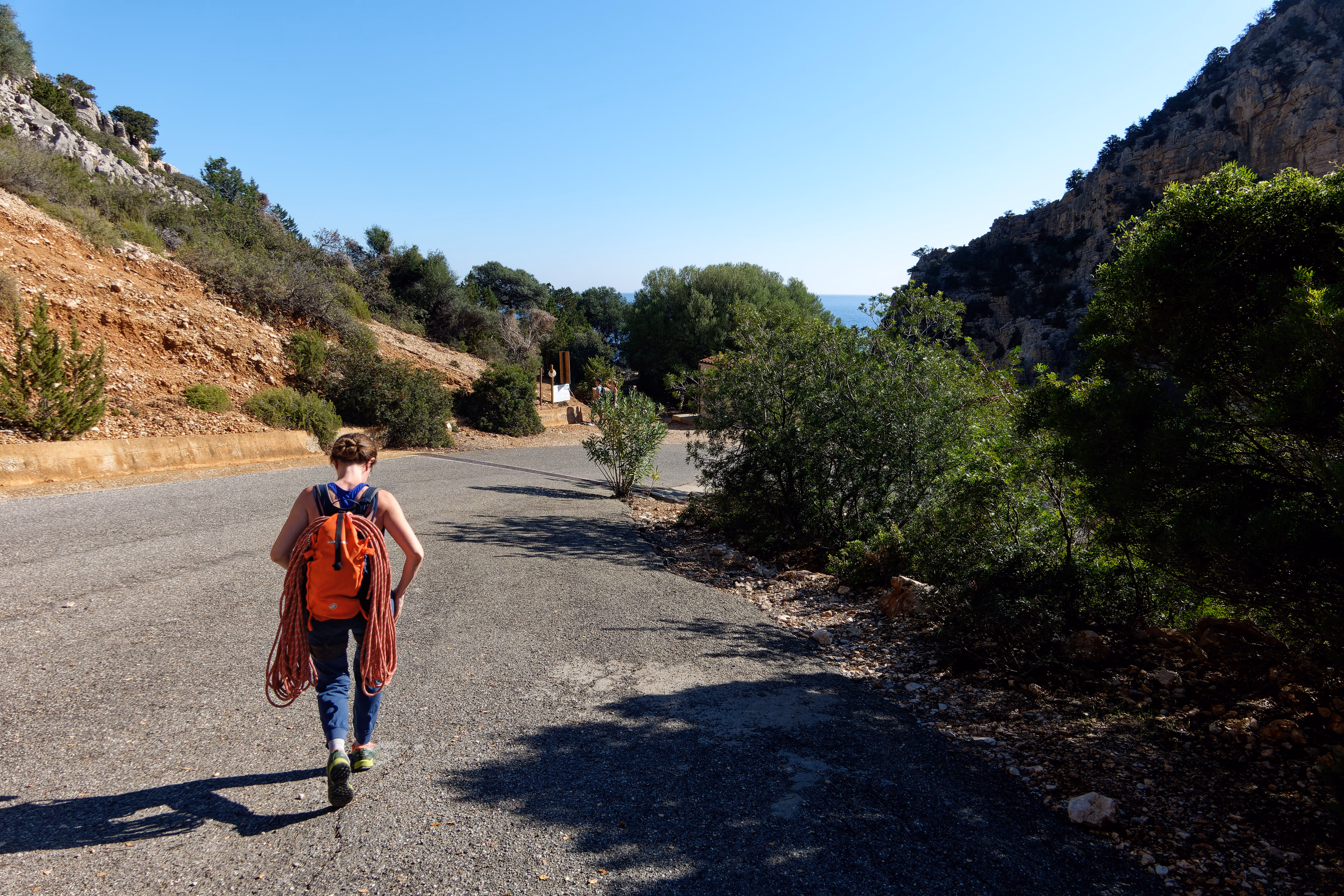 Volevamo concludere la nostra vacanza in Sardegna con una bella via sul mare. Viste le nostre capacità, la scelta è ricaduta su Signorina Fantasia. Quattro tiri facili, chiodati corti e a picco sul mare. Parcheggiamo l’auto poco sopra il Ristorante di Pedra Longa, da dove parte la discesa a scalini che porta alla caletta. Lasciamo le scale a prendiamo la traccia a destra che porta alla base della parete.