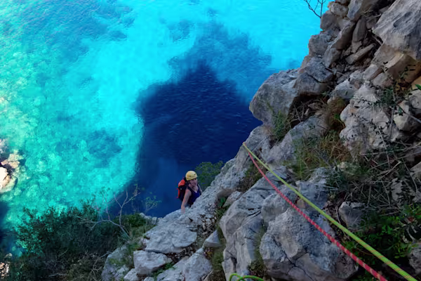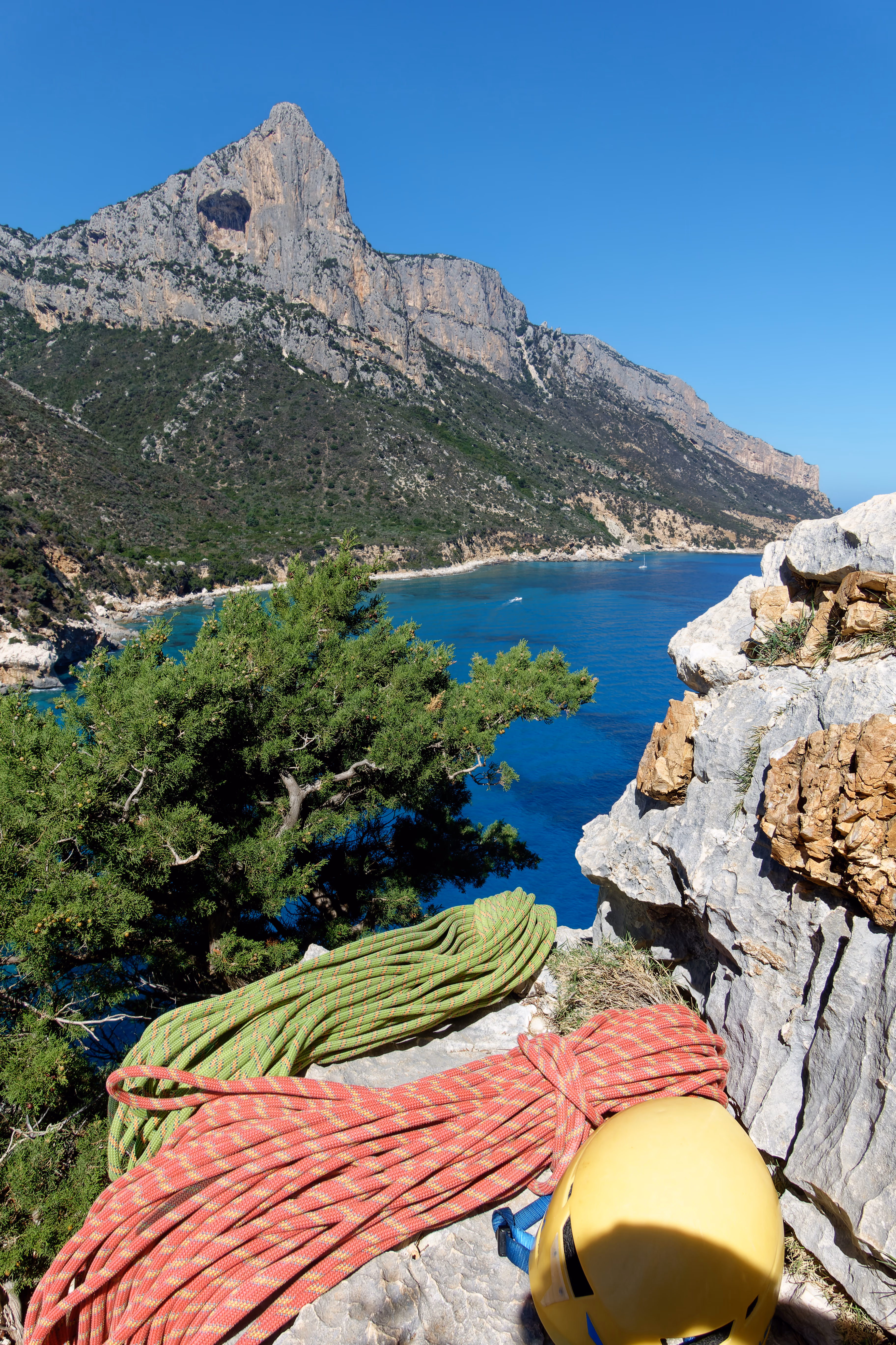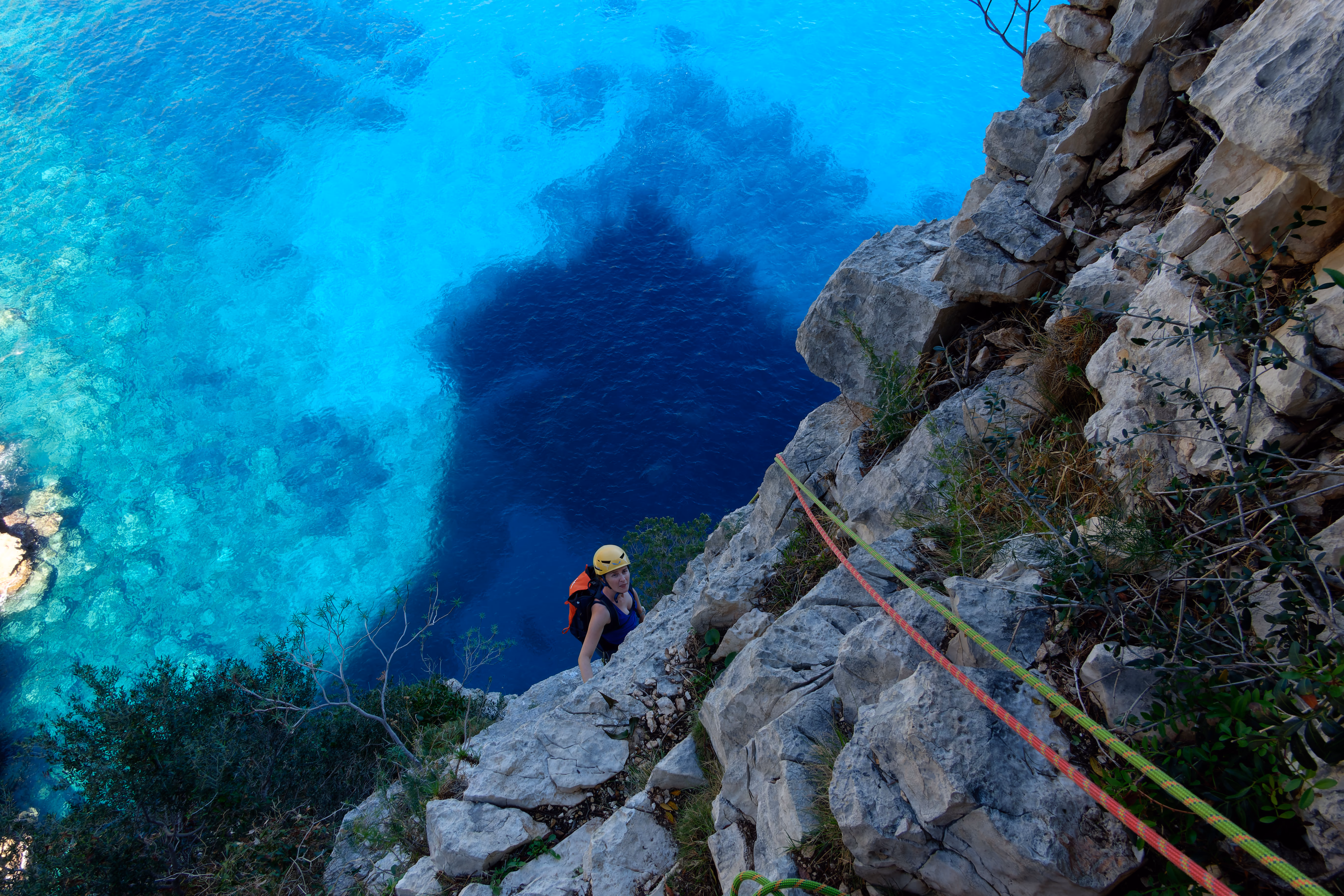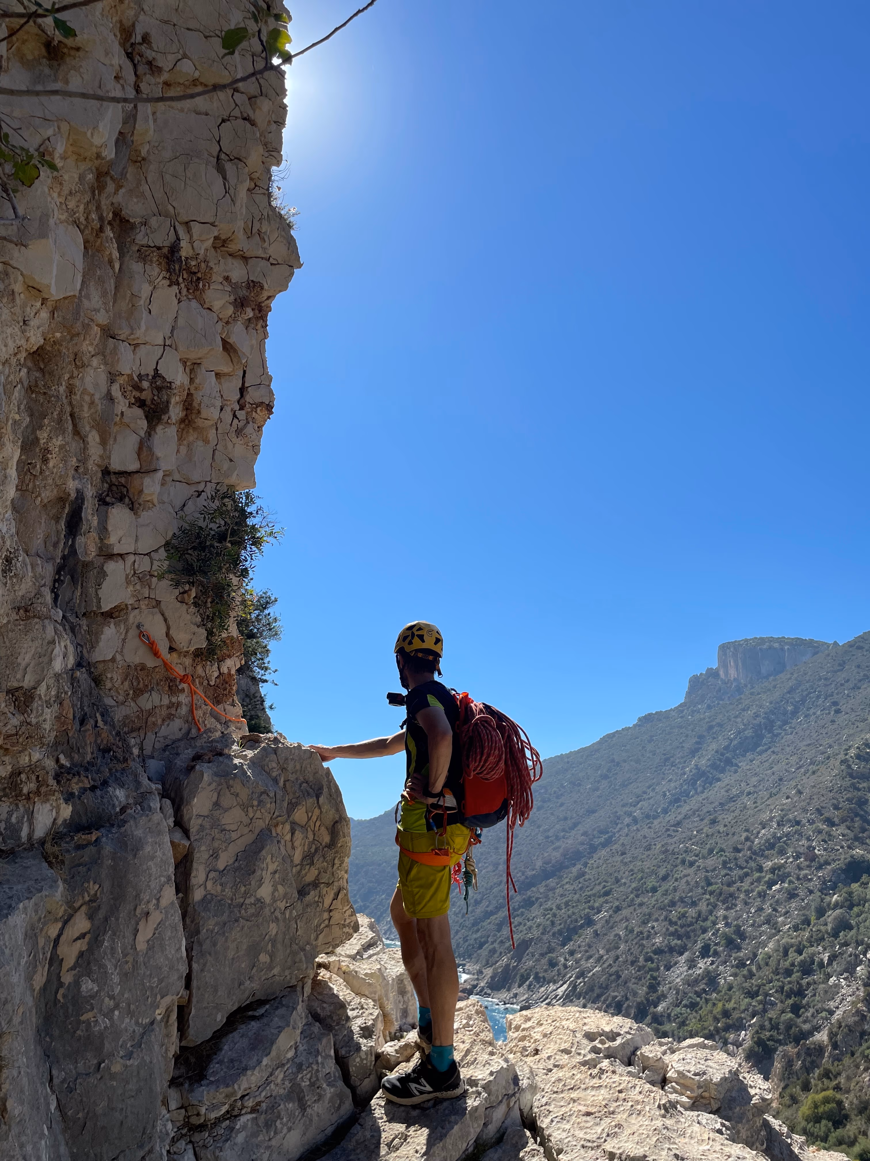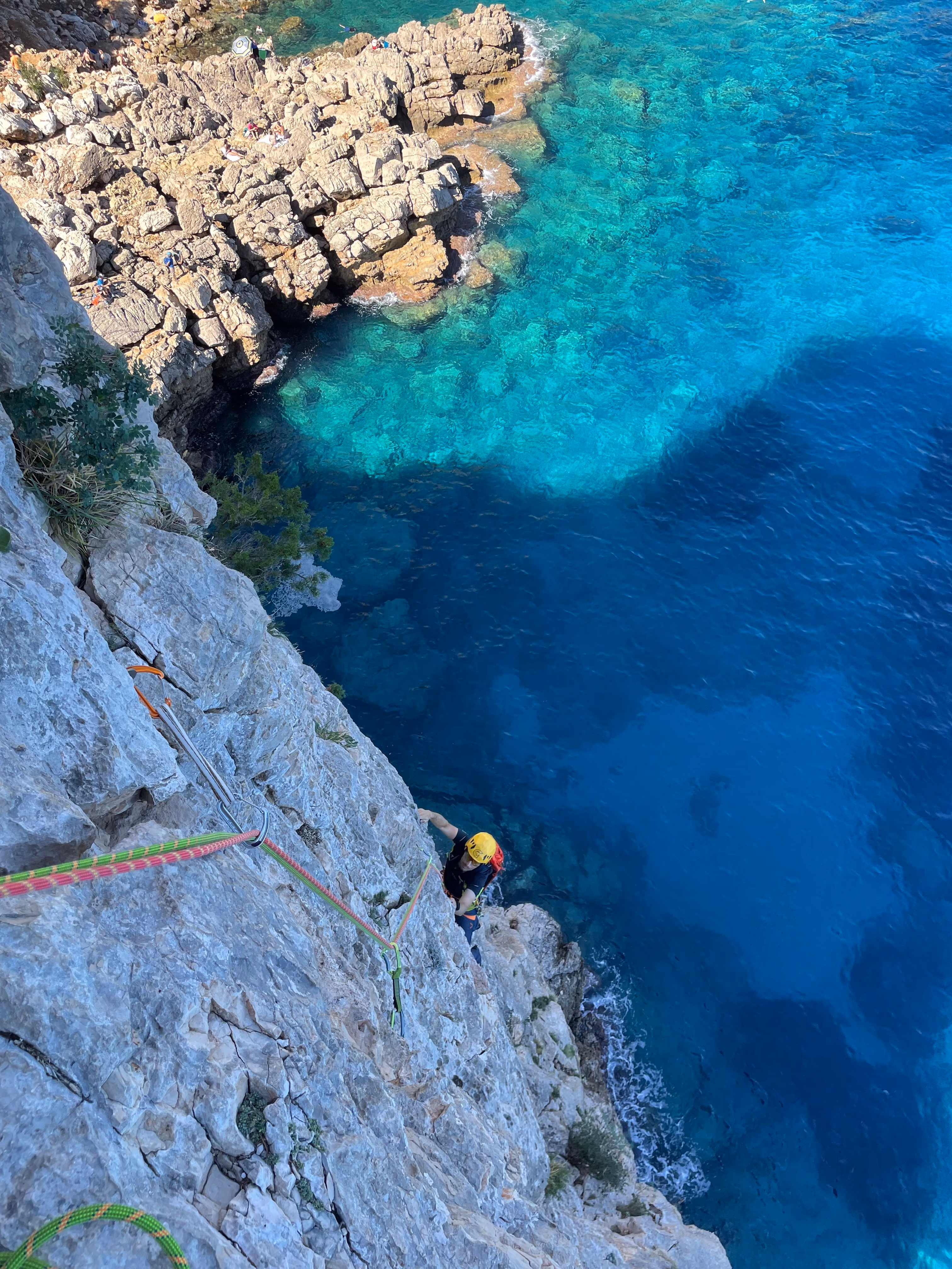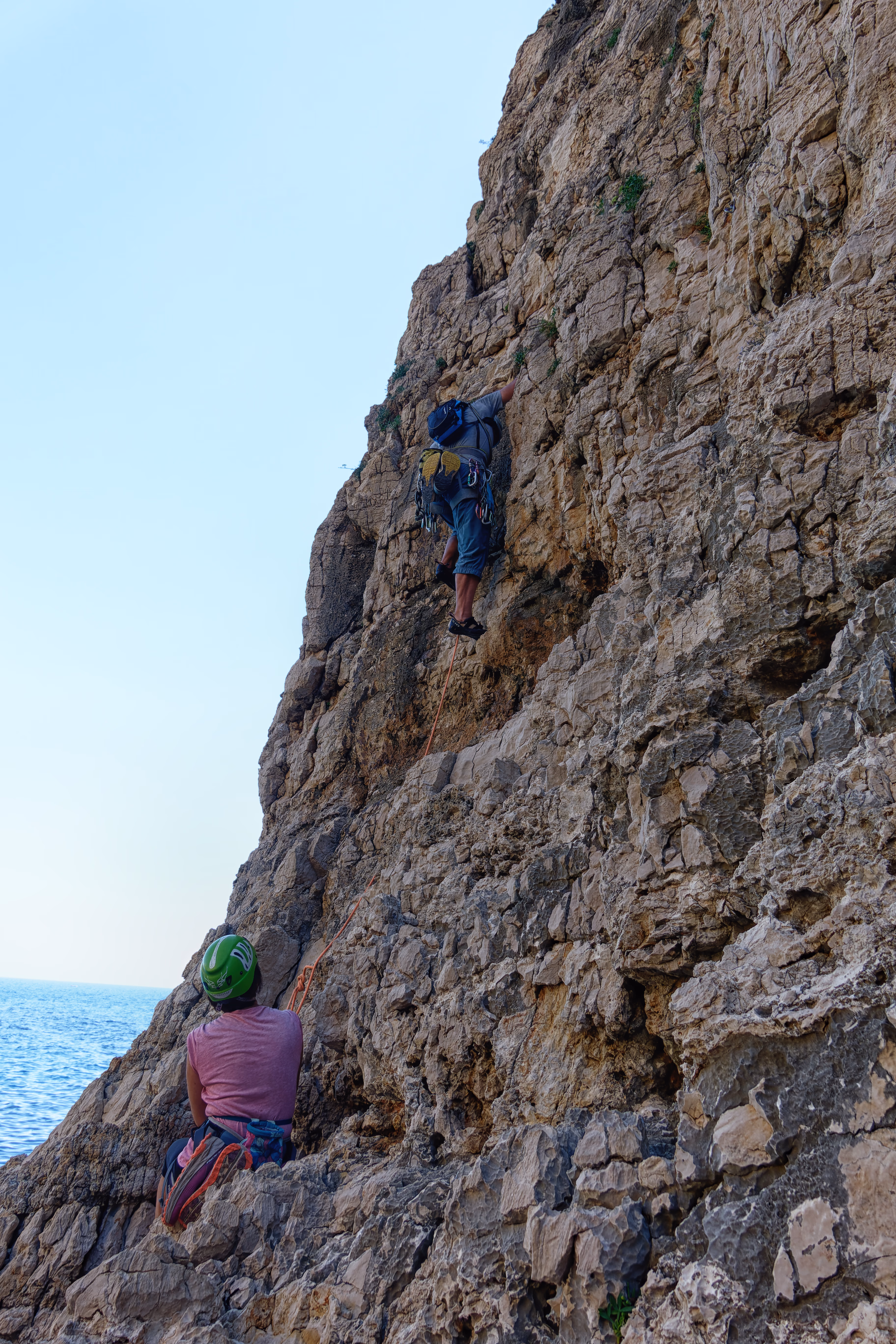 Il tiro più semplice, lascia la verticale a picco sul mare, e prosegue discontinuo per facili risalti. La sosta vera e propria è su un albero, noi ci siamo fermati pochi metri sotto dove inizia la cengia che porta alle calate. La cresta era impegnata da un numeroso gruppo diretto verso la cima. Attenzione che anche qui le rocce sono instabili.