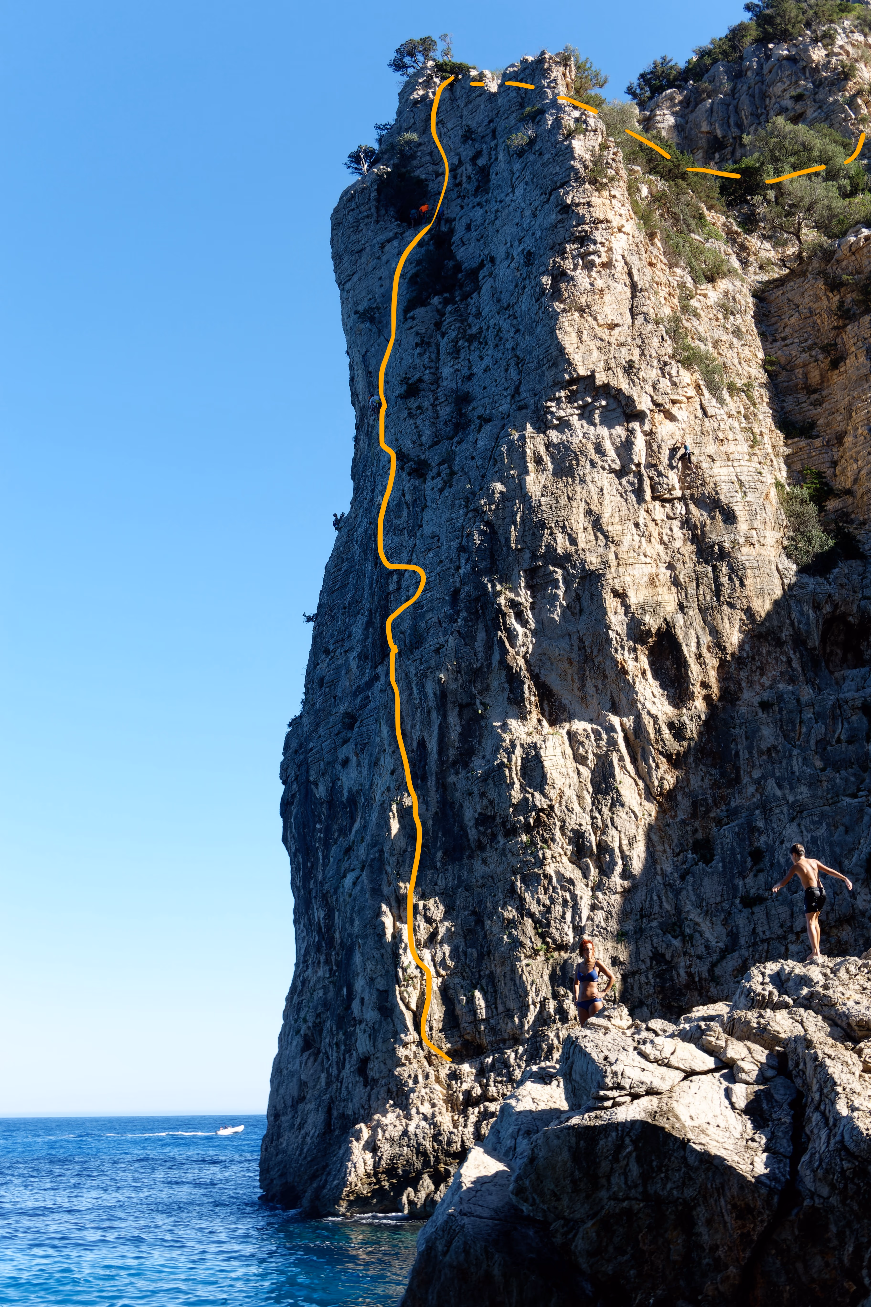 Partenza non difficile ma da capire. Si alzano i piedi in verticale per poi spostarsi verso destra, su una paretina più appoggiata. Si prosegue dritti, per poi traversare con decisione verso sinistra. Il traverso è protetto con uno spit, ed è facilmente azzerabile. Questo è il passo chiave della via. Al termine del traverso si risale una paretina verticale. Buone prese sulla destra, ma è richiesto un buon uso dei piedi per evitare di tirarsi su con le braccia. Sosta sportiva molto comoda e a sbalzo sul mare.