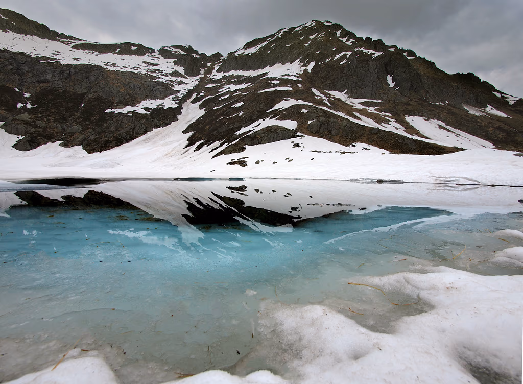 Il lago ancora parzialmente ricoperto di neve è magnifico, ne approfittiamo per scattare qualche foto. Un rapido panino e iniziamo la discesa per evitare di essere sorpresi da qualche temporale. Lungo il percorso ci fermiamo nei pressi del torrente per fotografare le bellissime pozze ricche di riflessi turchesi.