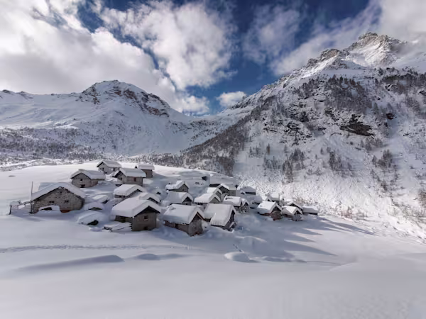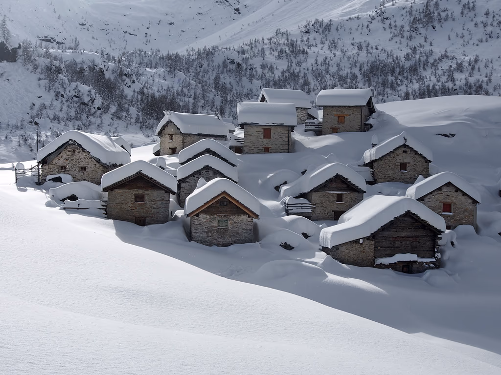 Un ultimo tornante e arriviamo a Lendine sotto una bella nevicata. Uno spettacolo meraviglioso, le piccole baite sono coperte da un metro abbondante di neve fresca! Purtroppo il cielo è ancora coperto e non ci consente di scattare una bella foto. Decidiamo di aspettare per vedere se riesce a rasserenare. Dopo circa un’ora veniamo premiati, il cielo si apre e i raggi del sole illuminano l’alpe e le montagne che la circondano: montiamo il grandangolo e riprendiamo la scena da una piccola altura sopra la chiesetta.