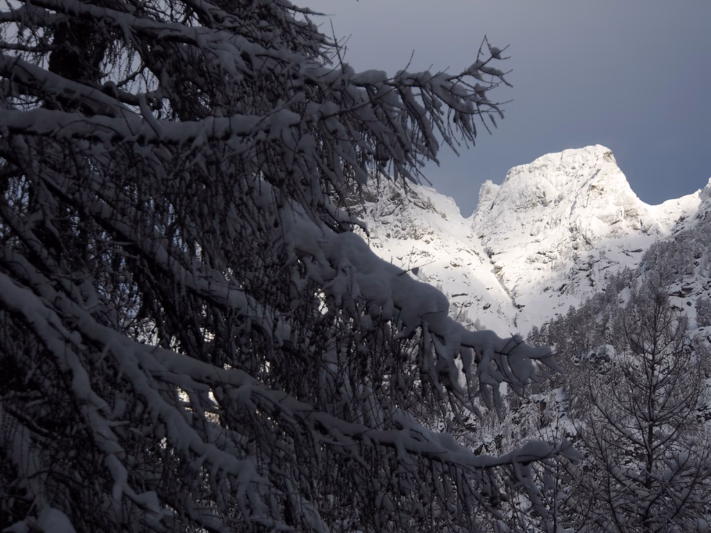 Superate le baite entriamo nel bosco di larici, oggi reso incantevole dalla nevicata appena conclusa, e iniziamo un traverso in leggera salita lungo la Valle del Drogo che si conclude nei pressi di un piccolo ponticello in legno. Qui la neve fresca aumenta a vista d’occhio, per fortuna la pista è stata già battuta in precedenza! Il bosco ora è più rado e il sentiero si impenna decisamente per guadagnare gli ultimi metri prima dell’Alpe.