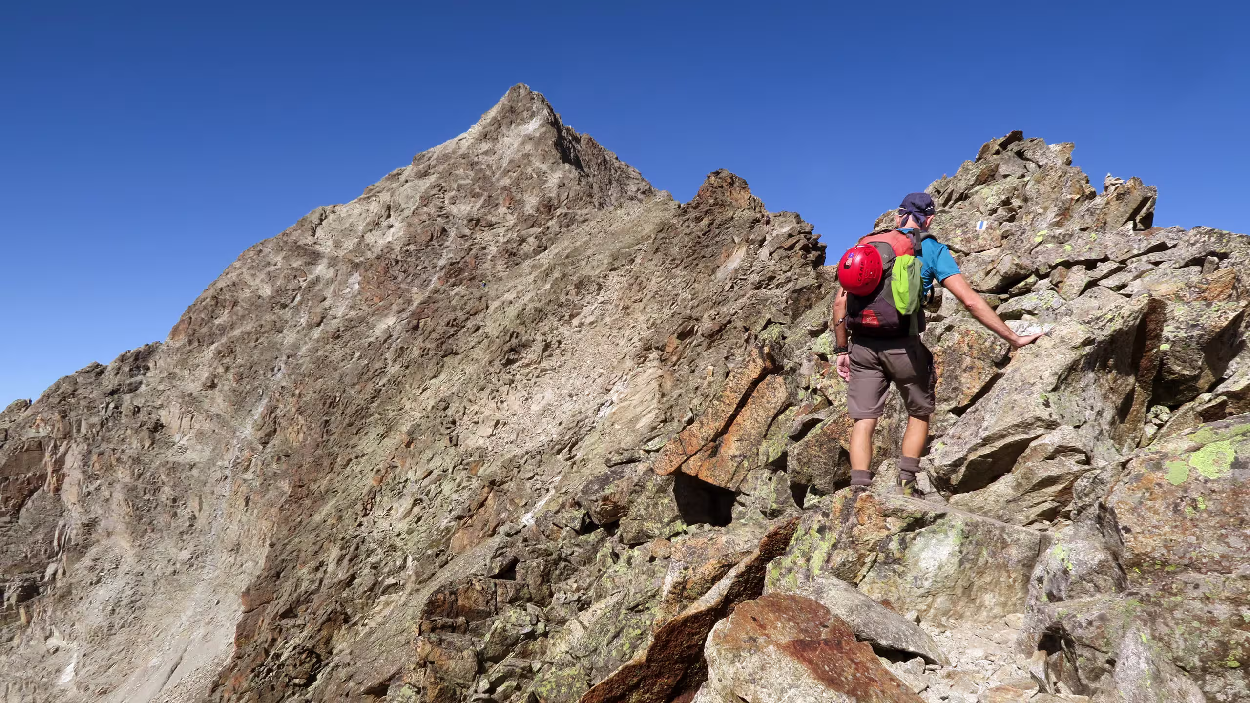 Raggiungiamo la Fuorcla Albana con un ripido sentiero su detriti: da qui la vista si apre verso St. Moritz e il Piz Languard, ed è ben visibile la lunga cresta che ci porterà in vetta. La cresta, apparentemente inaccessibile, è addomesticata da catene e corrimano nei punti più esposti, che la rendono facile e sicura, basta non soffrire di vertigini.