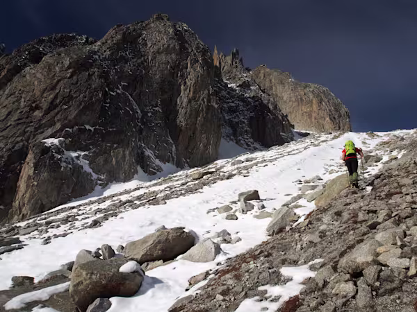 Ripartiamo affrontando una pietraia costituita da blocchi enormi: la neve nasconde delle insidiose voragini, procediamo con calma per evitare una rovinosa caduta! Superato questo tratto si inizia a risalire per terricio e detriti il pendio che porta al Gerenpass. Quando crediamo di essere arrivati al passo notiamo che in realtà manca ancora un traverso in leggera salita: un classico di queste situazioni, i passi sono sempre dopo il primo orizzonte.