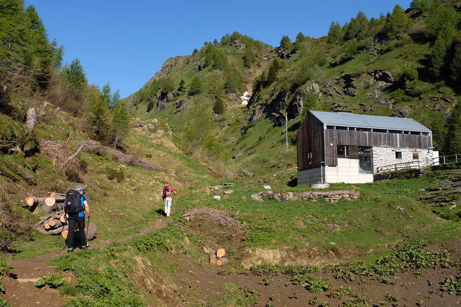 In compagnia dei soliti vecchietti: mio padre, Sergio e Angelo, alle 8 del mattino partiamo dal parcheggio posto a quota 1710 m al termine della strada asfaltata, ma stretta, che parte da Campo Blenio e arriva in località Pradasca. In poco più di mezzora arriviamo alla Capanna Bovarina UTOE, chiusa purtroppo, per prendere in direzione N le indicazioni Lago Retico e Pass Cristallina seguendo una sterrata che porta ad un alpeggio a quota 1993 m.