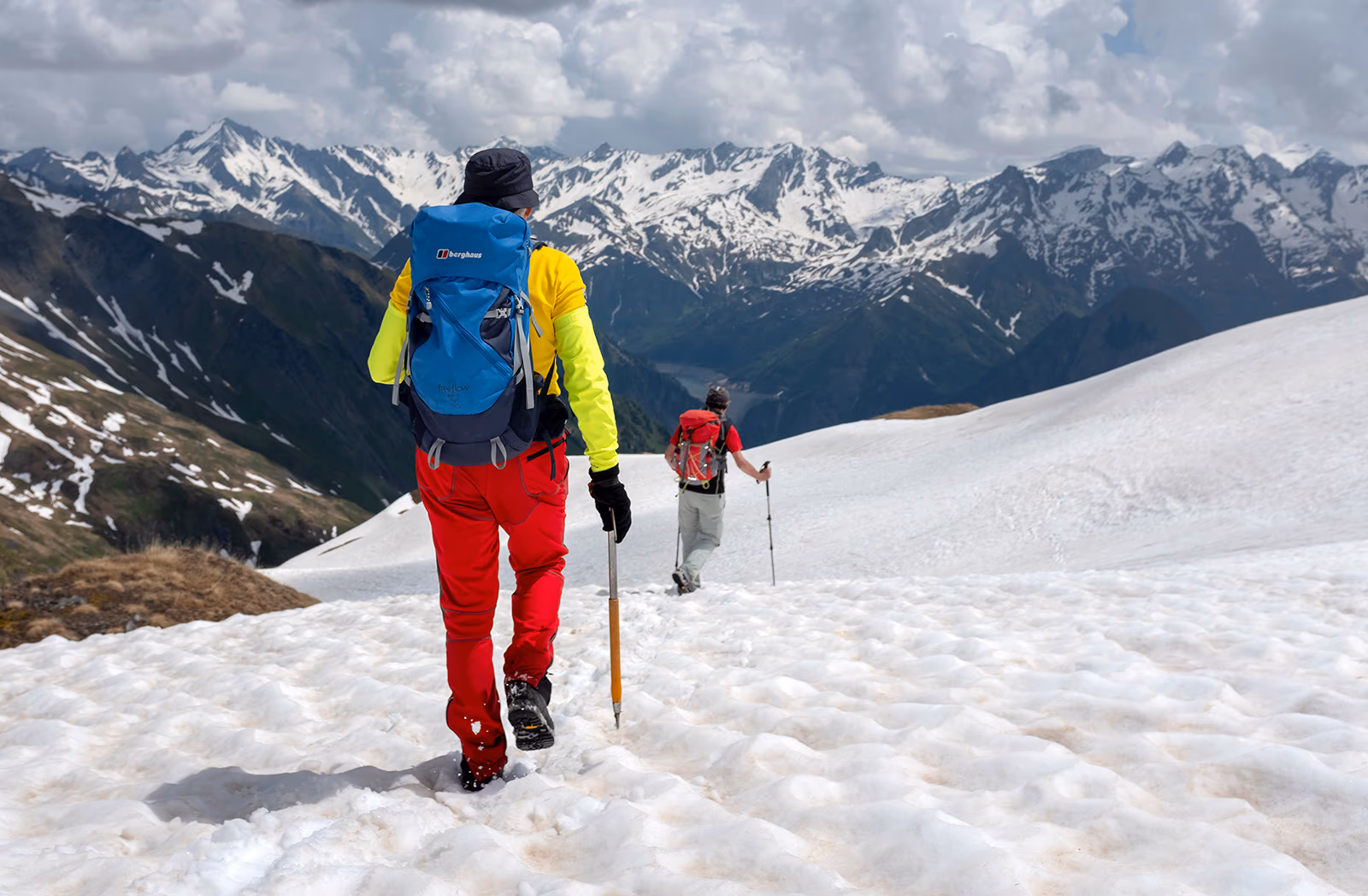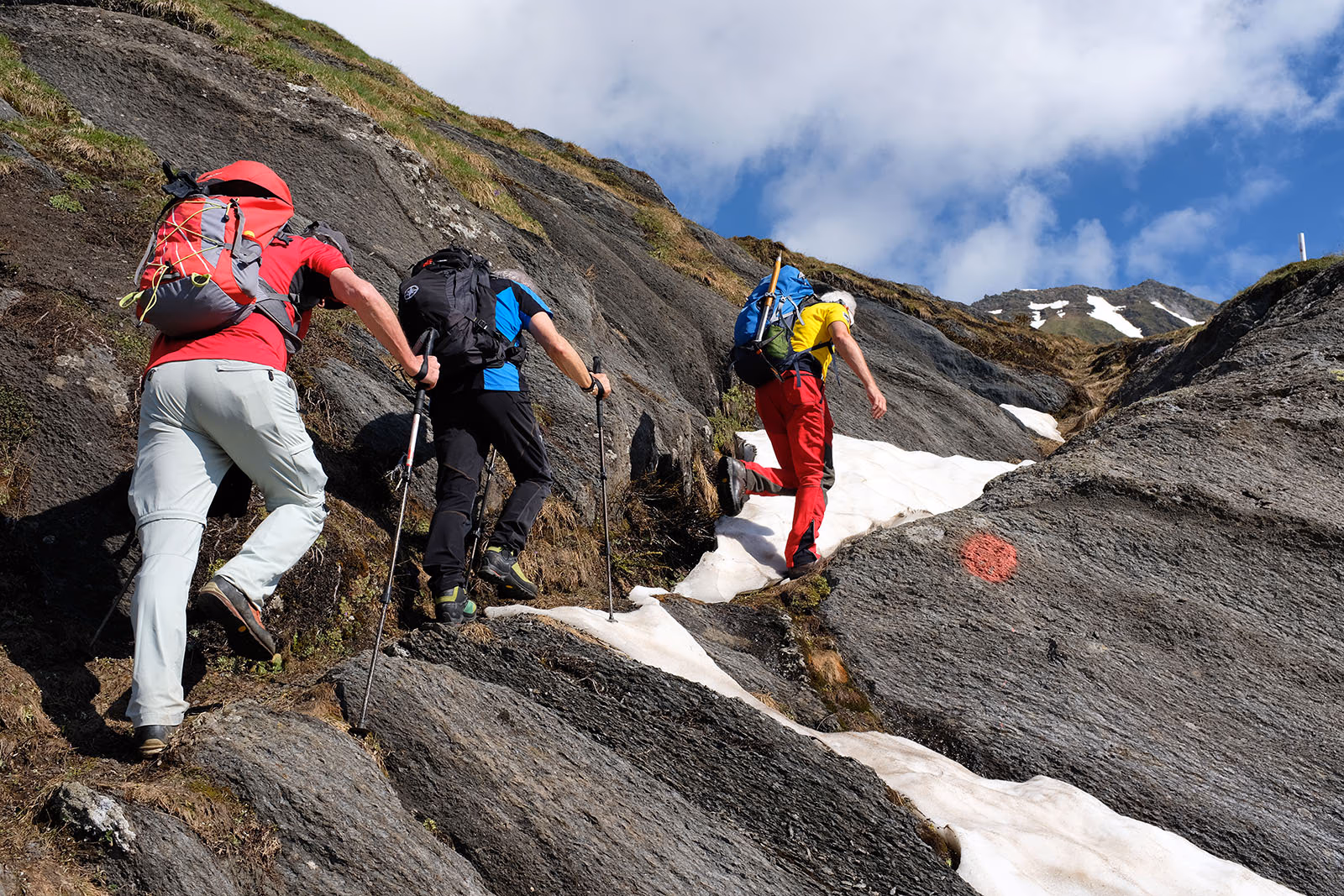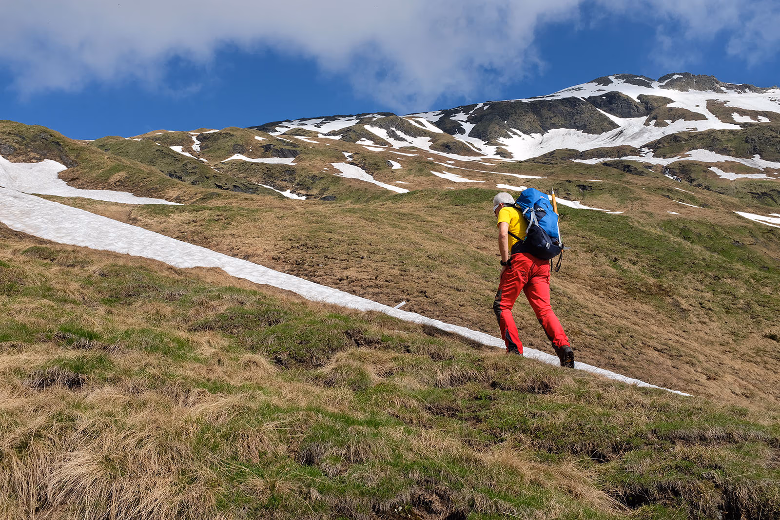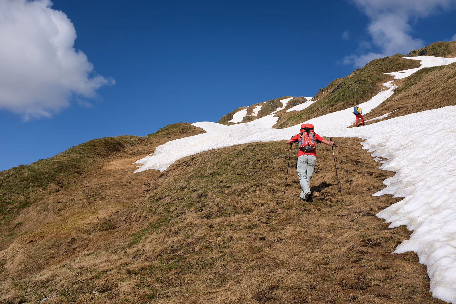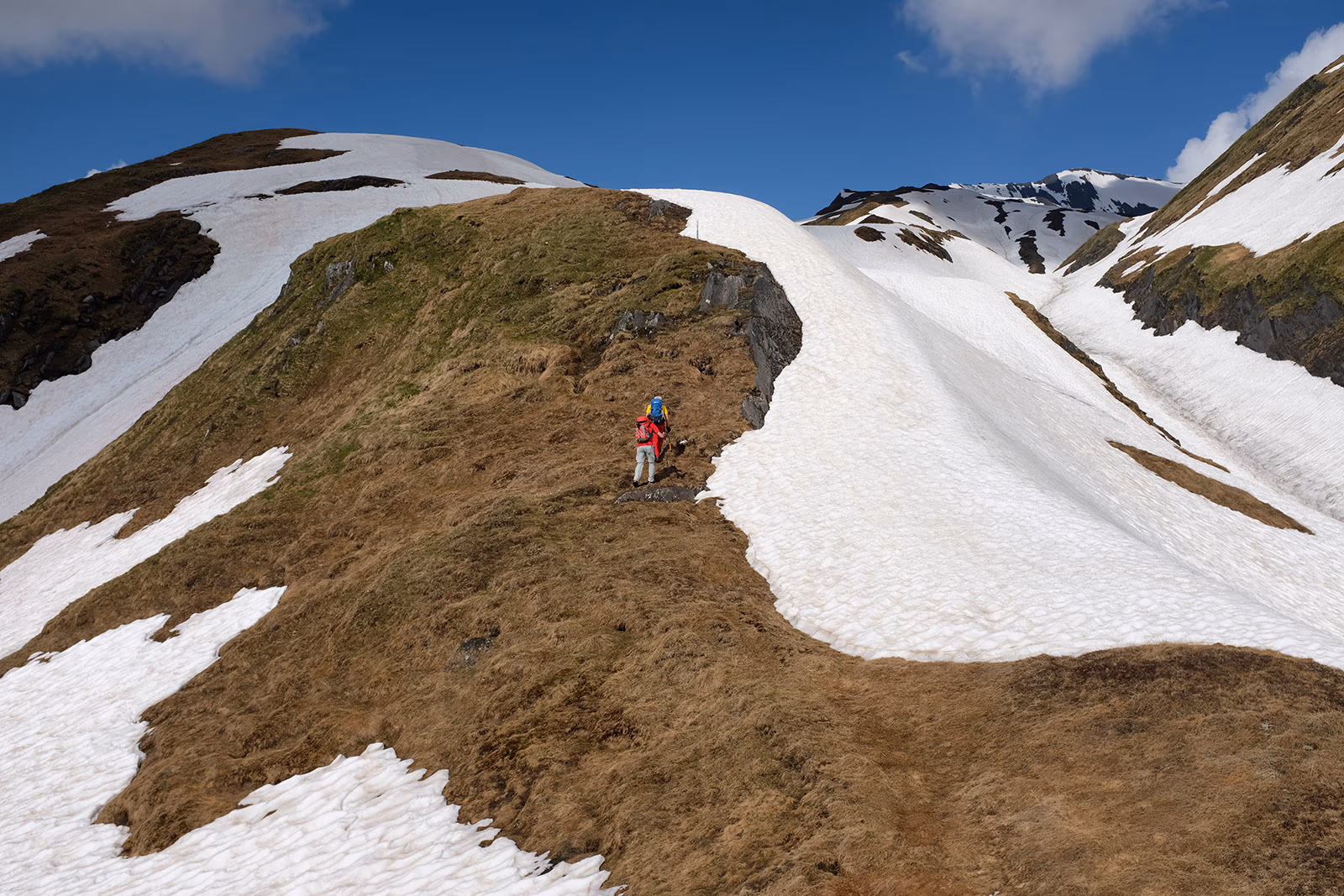 Qui lasciamo il sentiero e pieghiamo a WNW per seguire una labile traccia che punta alla quota 2466 riportata su https://map.geo.admin.ch. Fortunatamente si viene aiutati da radi paletti con l’estremità colorate da sbiadite strisce bianche e rosse. In pratica stiamo seguendo il sentiero che porta al Pass Casatcha lungo la Val d’Inferno. Cominciamo a camminare su belle lingue di neve spessa e, fortunatamente, compatta lungo la cresta di un dosso fino alla quota di circa 2550 m.