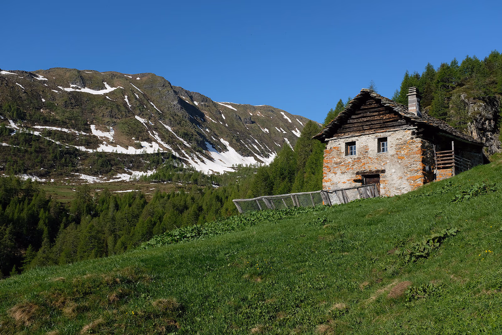 Perfetta solitudine, ambiente selvaggio, con valli e monti ancora abbondantemente coperti di neve. A S giganteggia l’Adula, la cima più alta del Ticino, mentre a W si vedono il Piz Medel ed il Piz Terri, da salire, con sotto la gigantesca diga del Luzzone.