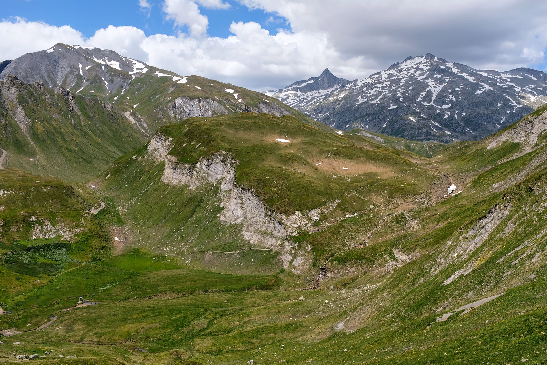 Ad un certo punto, di fronte ad un risalto di rocce friabili, ci facciamo ingannare dalla traccia di sentiero che volge a sinistra, quasi a voler superare il risalto. Errore! La traccia non porta a nulla; per cui ritorniamo sui nostri passi ad esplorare il risalto su cui individuiamo sbiaditi segni. Ritrovato il percorso, ometti e segni blu ora più evidenti, saliamo per sfasciumi e nevai fino a raggiungere il colle a quota 2748m da cui si stacca la cresta NW.