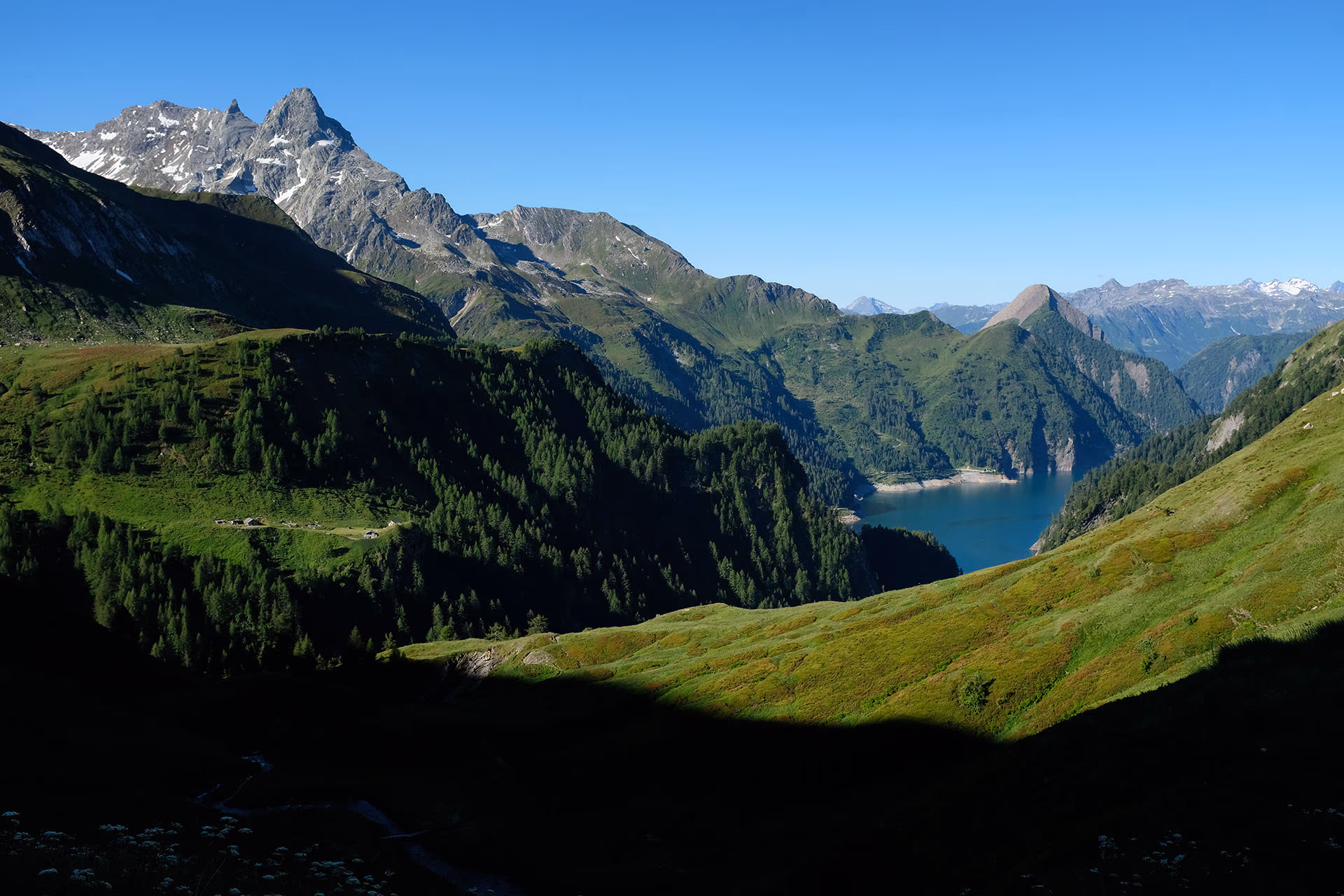 Avere visto la sua bella piramide dalla Cima della Bianca e volerlo salire è stato un tutt’uno. Così ritorniamo nella bella Valle di Blenio fino a lasciare l’auto all’Alpe Garzott, quota 1628m, dopo aver attraversato il culmine della diga del lago del Luzzone e lasciato a destra la deviazione per la Val Carassina con il suo itinerario per l’Adula.