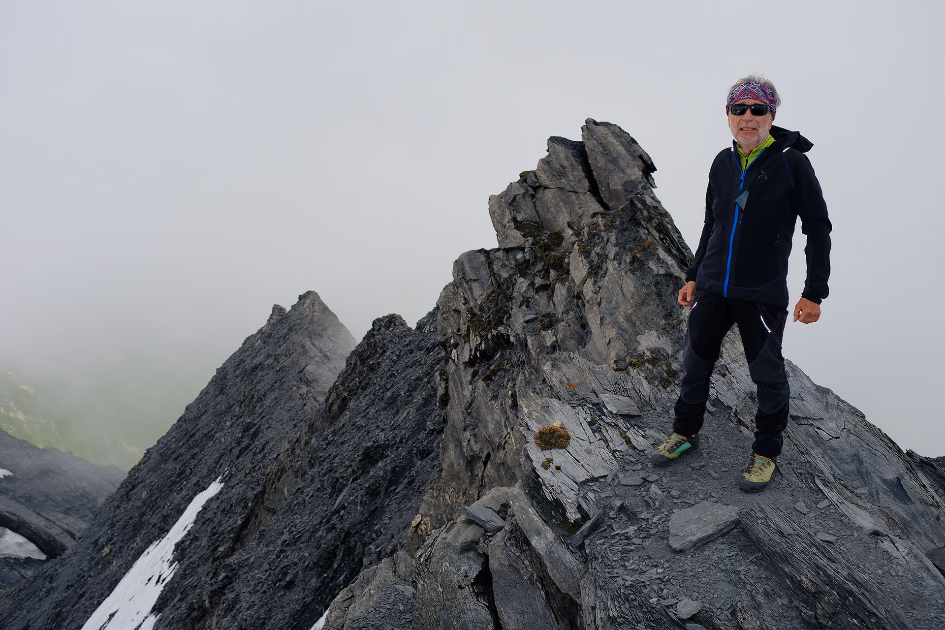 La cima sembra vicina, ma è un inganno! La traccia sale costeggiando sotto la cresta il ripido versante S su sfasciumi abbastanza stabili, costituiti da scaglie di roccia nerastra, che risulteranno ottimi in discesa. La croce di vetta è ora evidente ma non ci si arriva mai! Quattro ore di salita e finalmente tocchiamo la vetta del Piz Terri a 3149m.