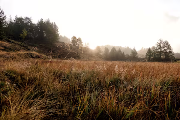 In breve arriviamo ad un caratteristico alpeggio. Posto magnifico, purtroppo rovinato dai tralicci dell’alta tensione. L’alba fa risaltare i colori autunnali che cominciano ad esplodere. Il sentiero procede attraverso un bel bosco di larici al cospetto della piramide del Parè Di Scut. Superata una baita procediamo in direzione del Passo del Sole fino a raggiungere il Lago dei Canali. Poco dopo incontriamo dei cartelli con le indicazioni per il Passo Predèlp. Abbandoniamo quindi la traccia per il passo e ci abbassiamo di qualche metro.