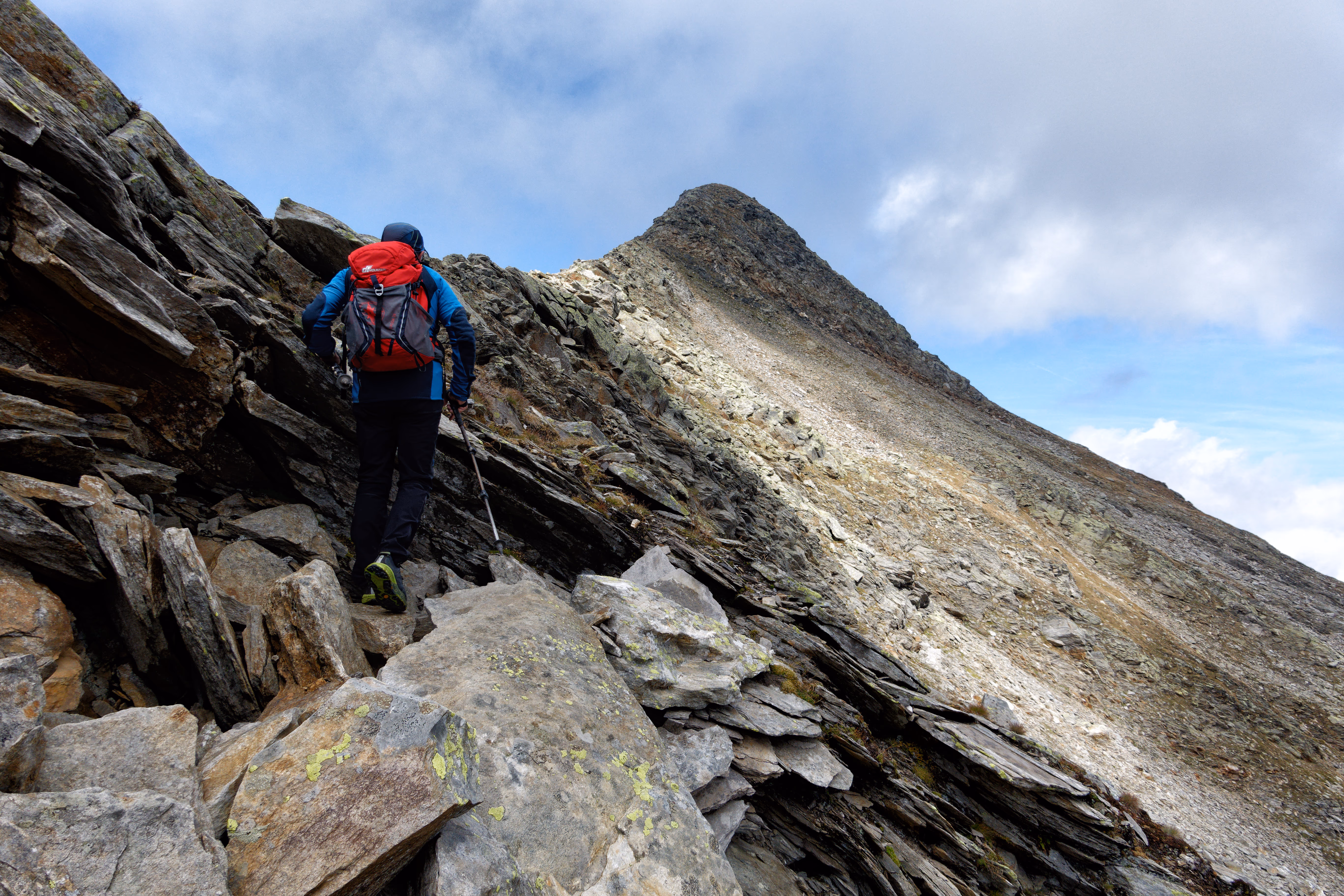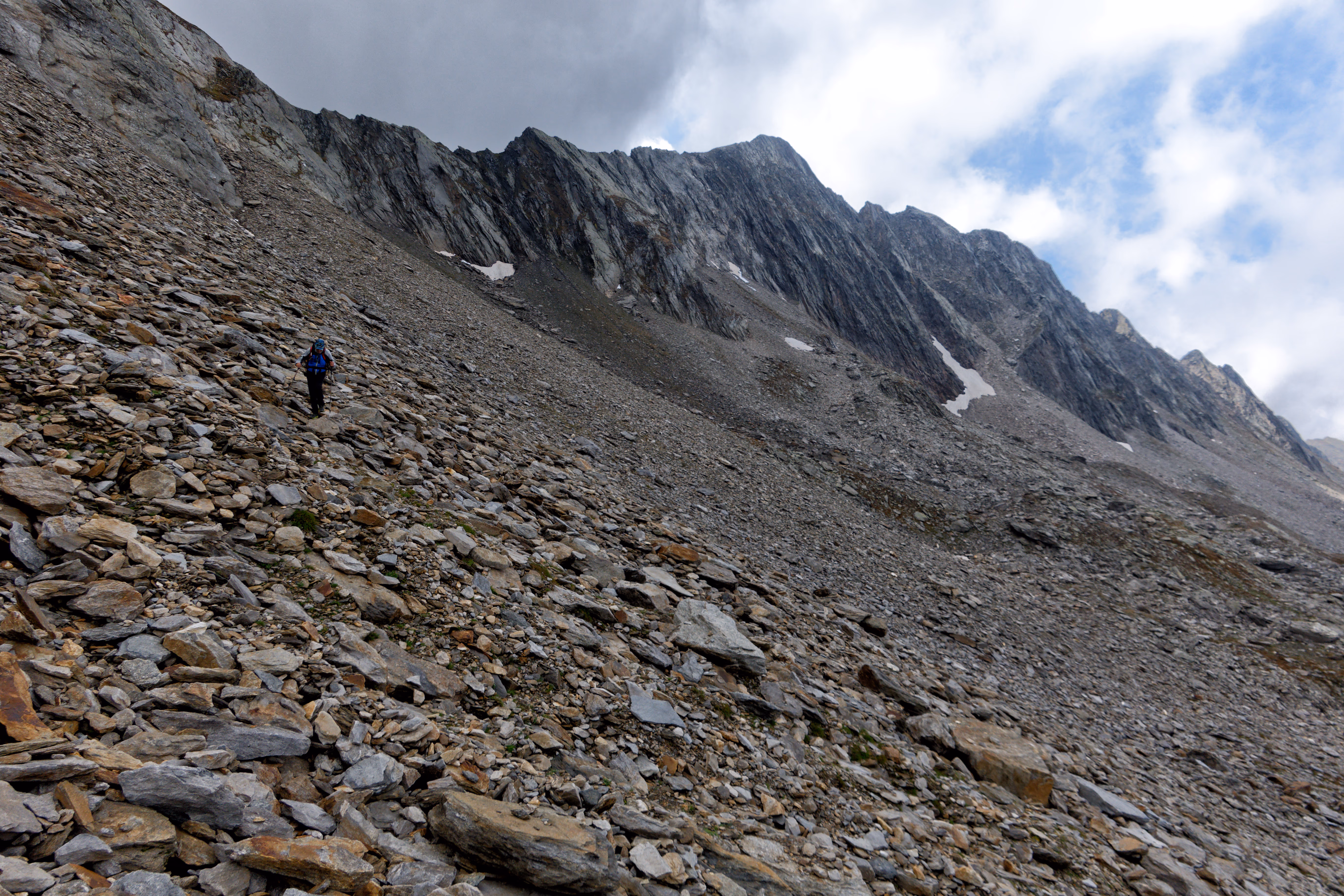 Lasciamo il sentiero diretto al passo per puntare con decisione verso la Bassa di Sou, un evidente valico dal quale parte la cresta che conduce in vetta. Non esistono indicazioni, la traccia gps allegata è un buon riferimento anche se il percorso è evidente. L’ultimo tratto lo percorriamo su un’ampia fascia detritica che sembra quasi un rock glacier.